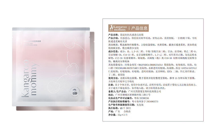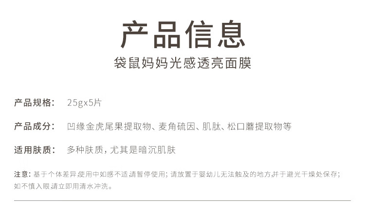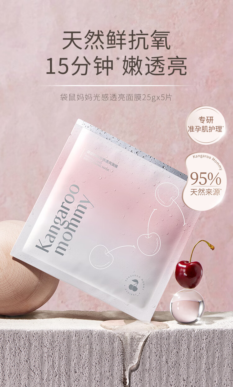 袋鼠妈妈光感面膜准孕妇敏感肌可用补水保湿滋润提亮肤色抗氧面膜贴 光感透亮面膜-25g×5片