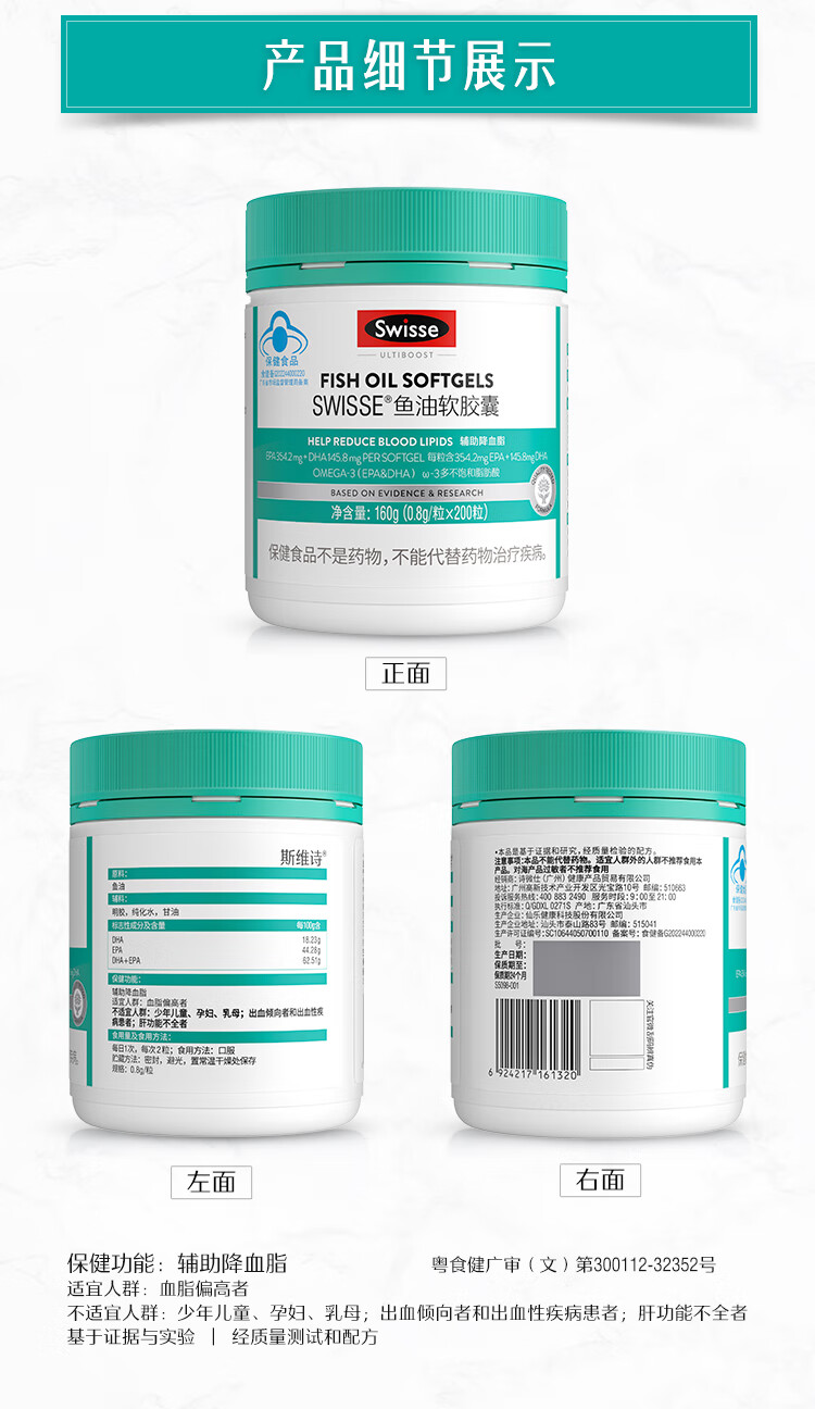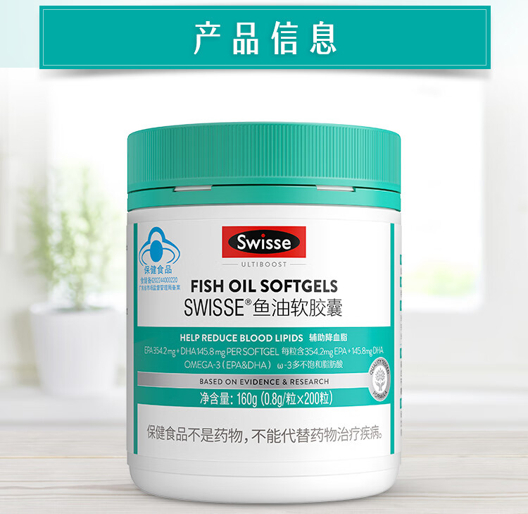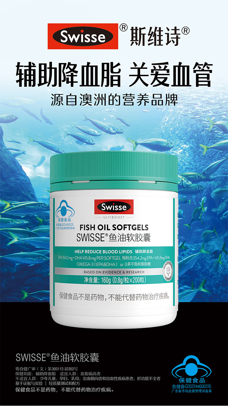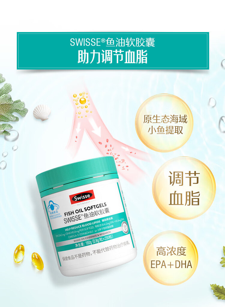 Swisse斯维诗 鱼油软胶囊 深海高浓度小粒鱼油 辅助降血脂 蓝帽认证 「联盟专享」0.8g/粒* 200粒*1瓶