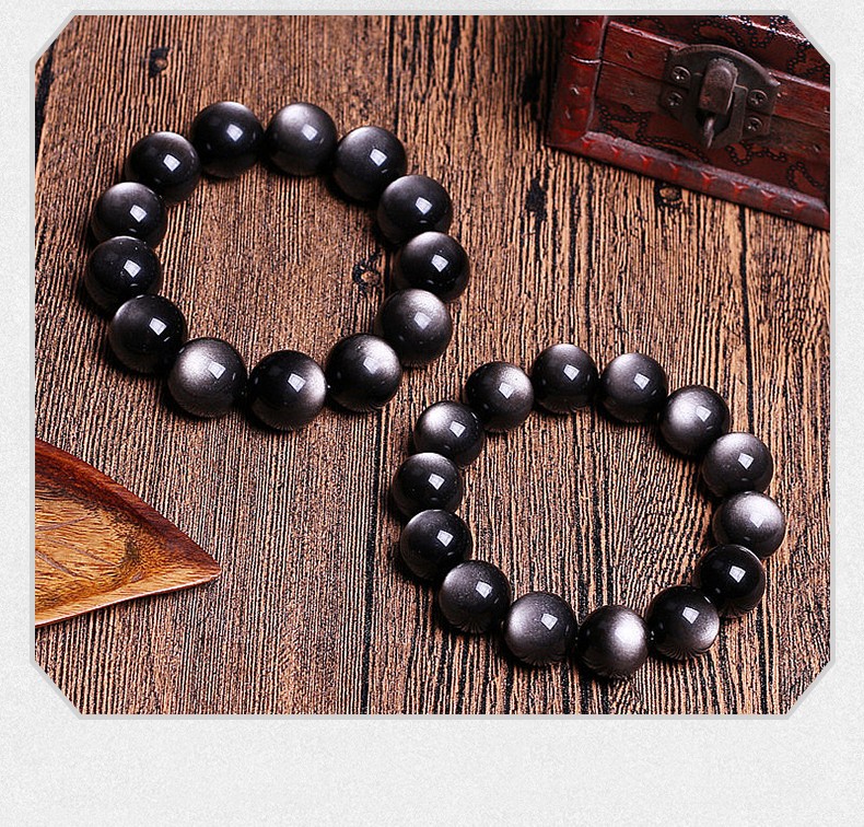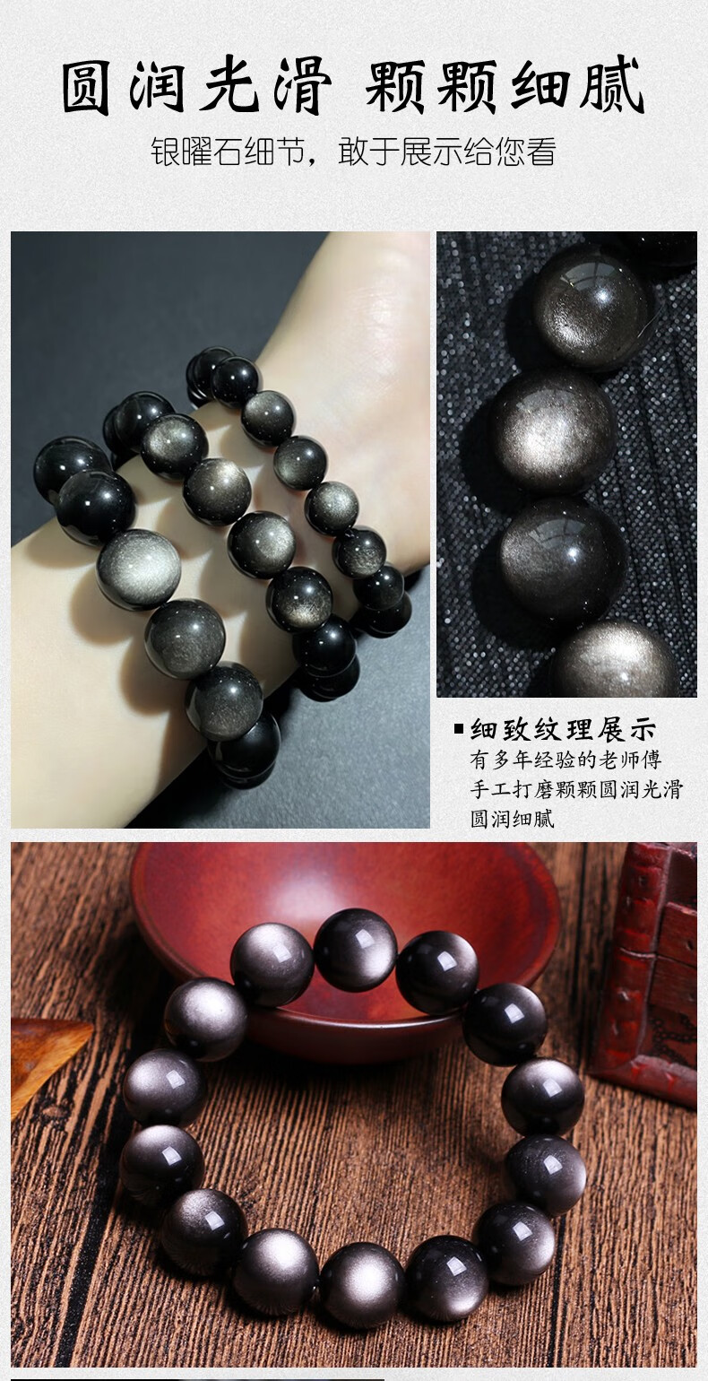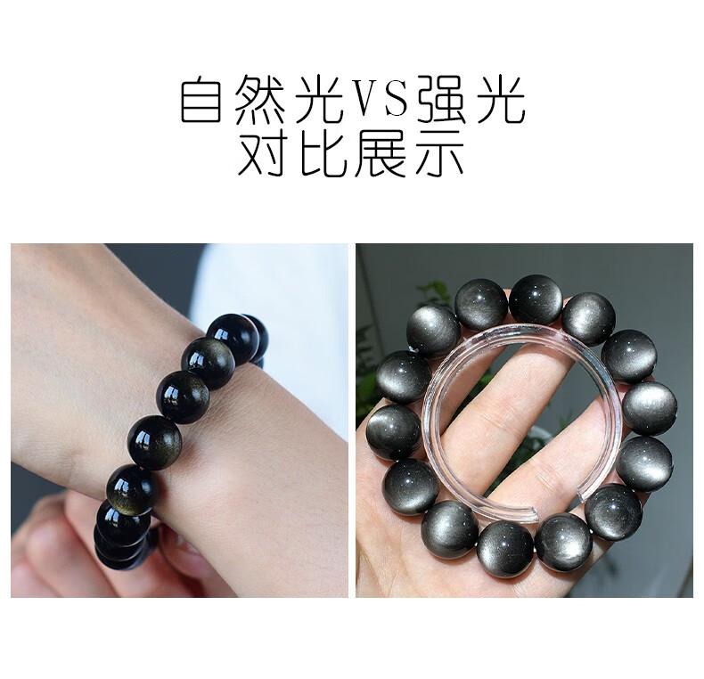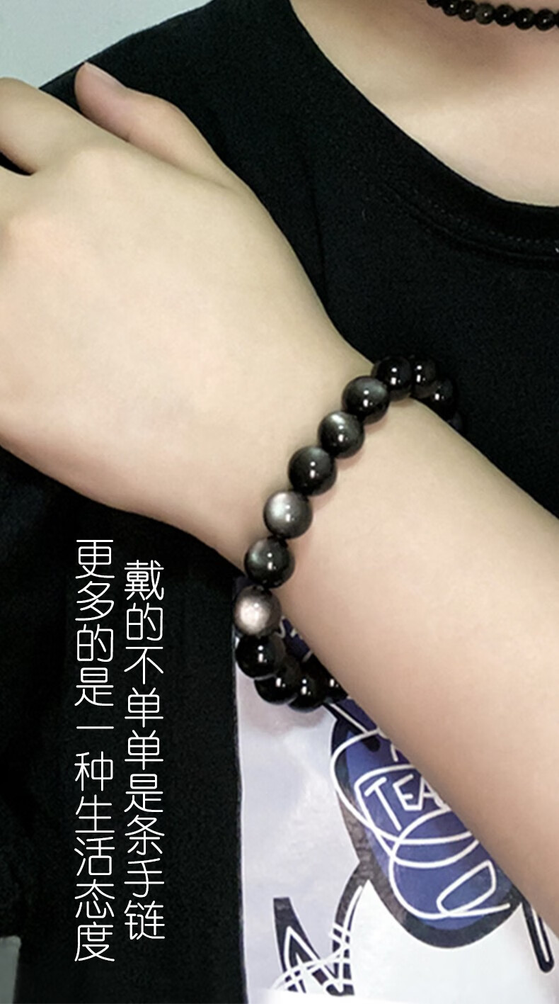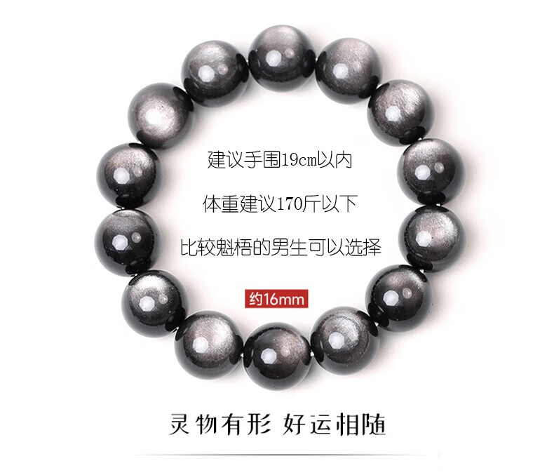 卡薇亚天然银曜石手串男女士情侣款黑曜石手链配证书上岸水晶情人节礼物 珠径16mm左右(建议男款)