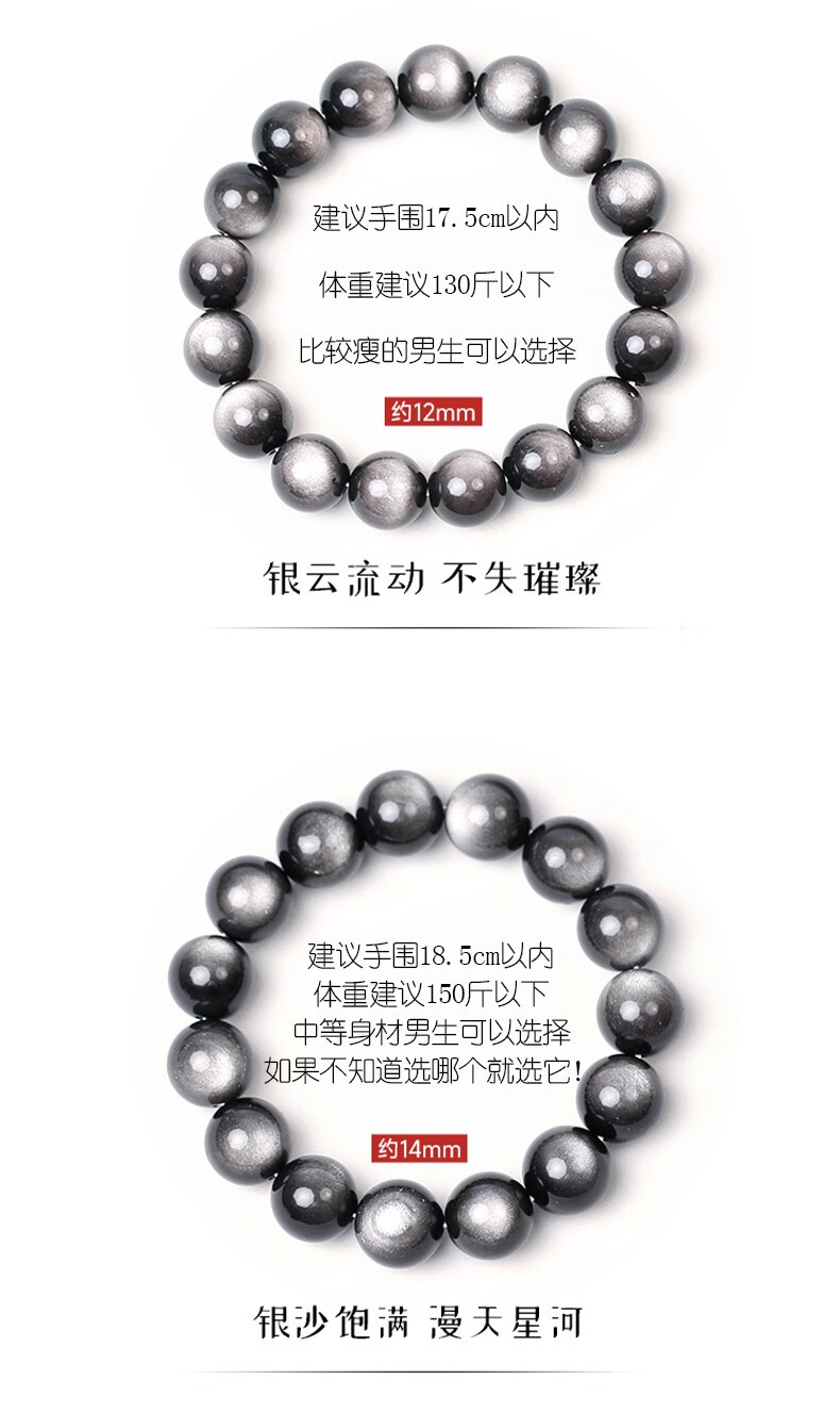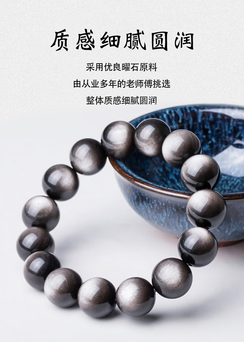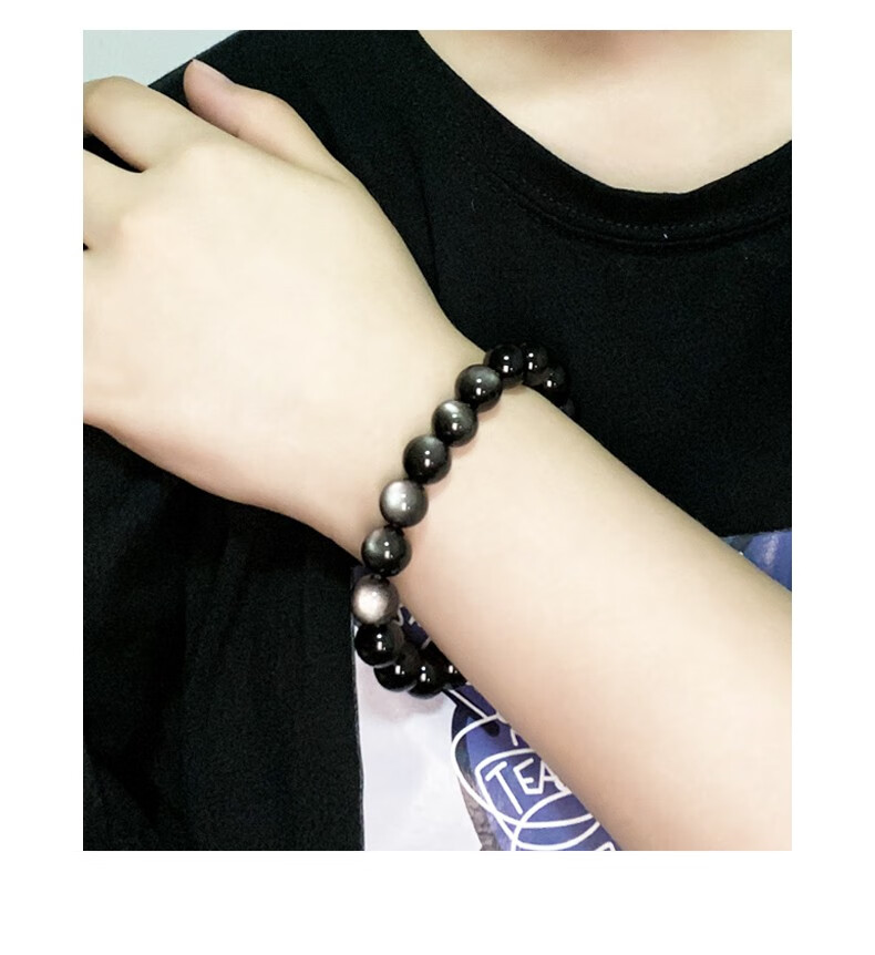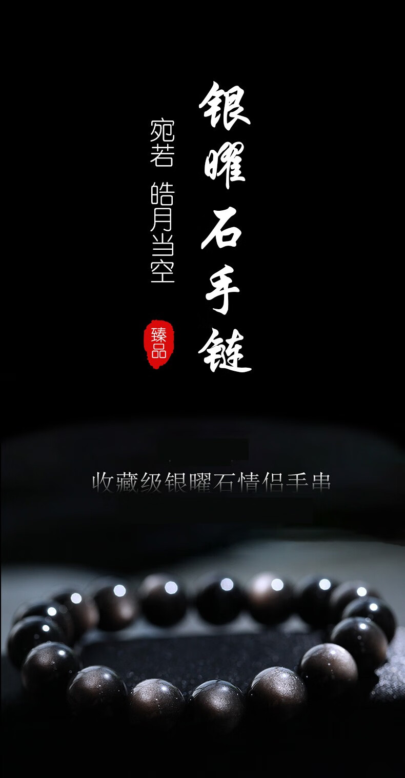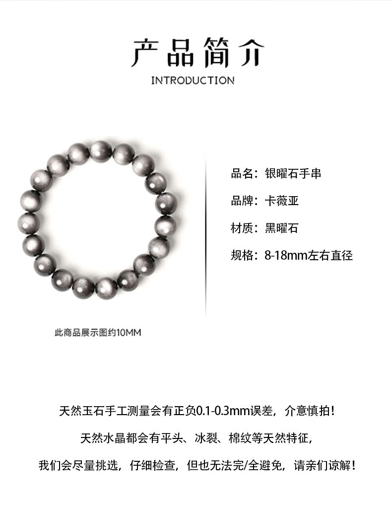卡薇亚天然银曜石手串男女士情侣款黑曜石手链配证书上岸水晶情人节礼物 珠径16mm左右(建议男款)
