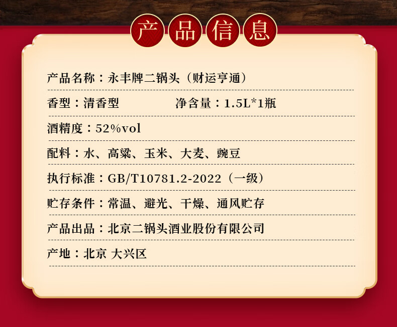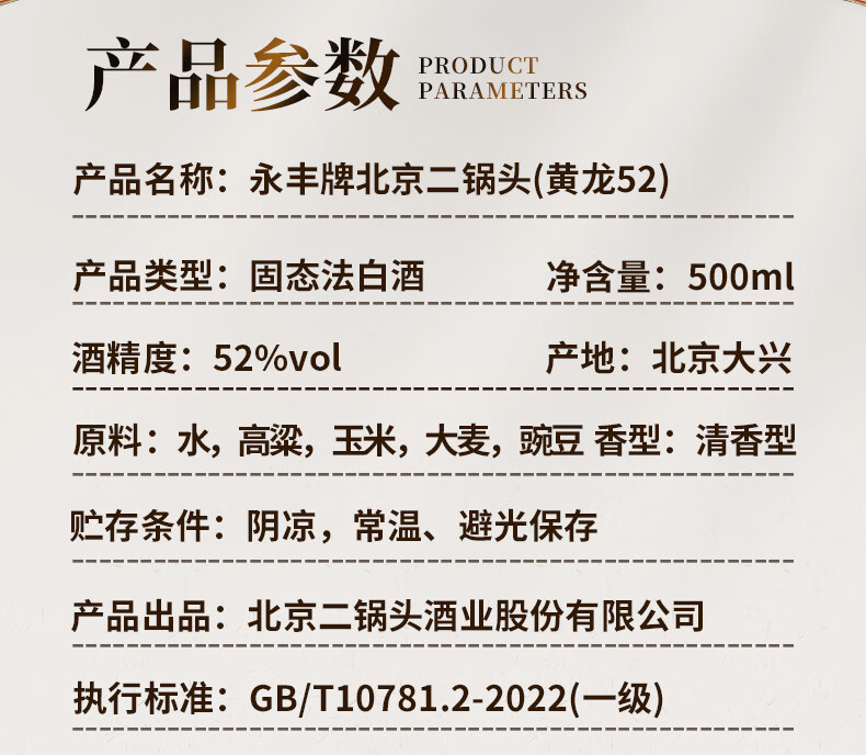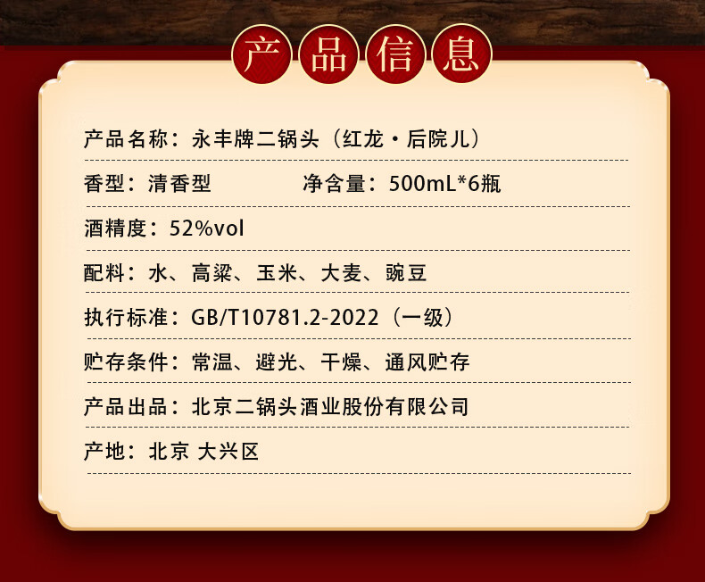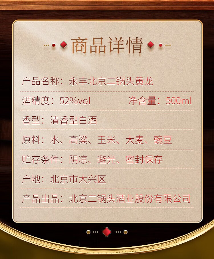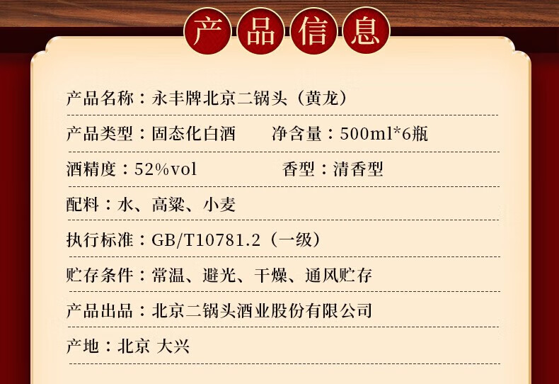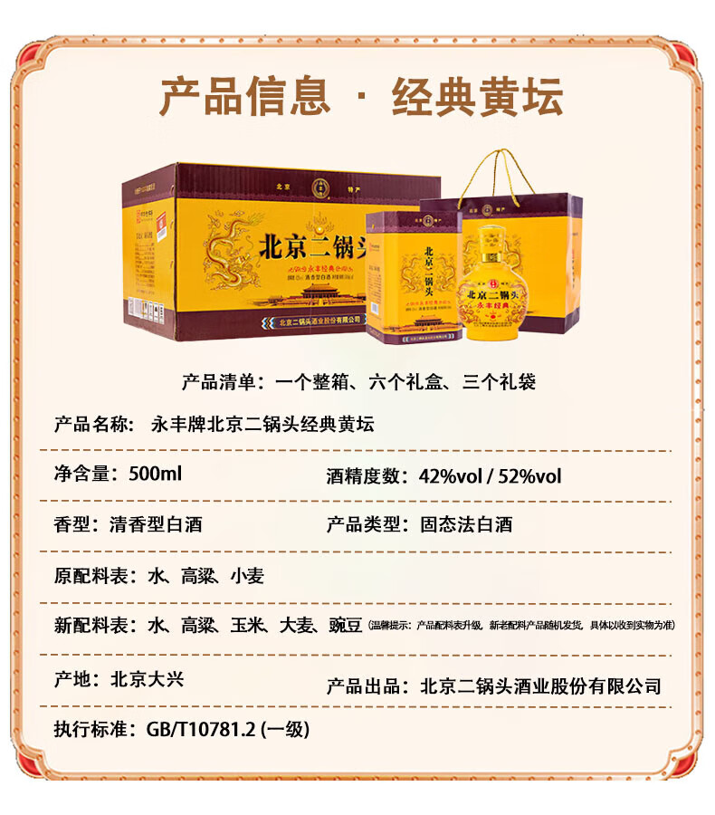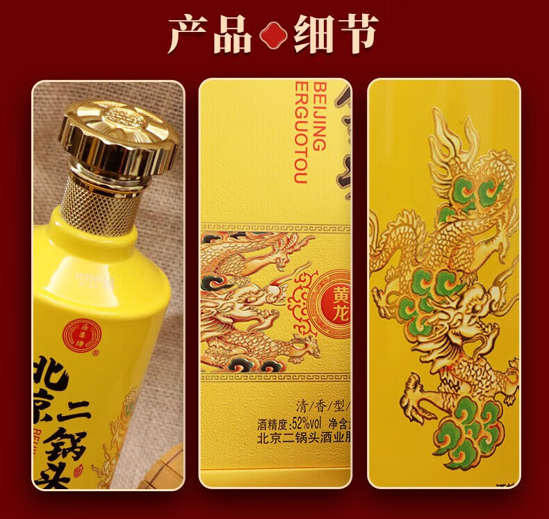 永丰牌北京二锅头永丰牌 清香型白酒 粮食酒 礼盒装 节日礼品 52度 500mL 2瓶 黄龙