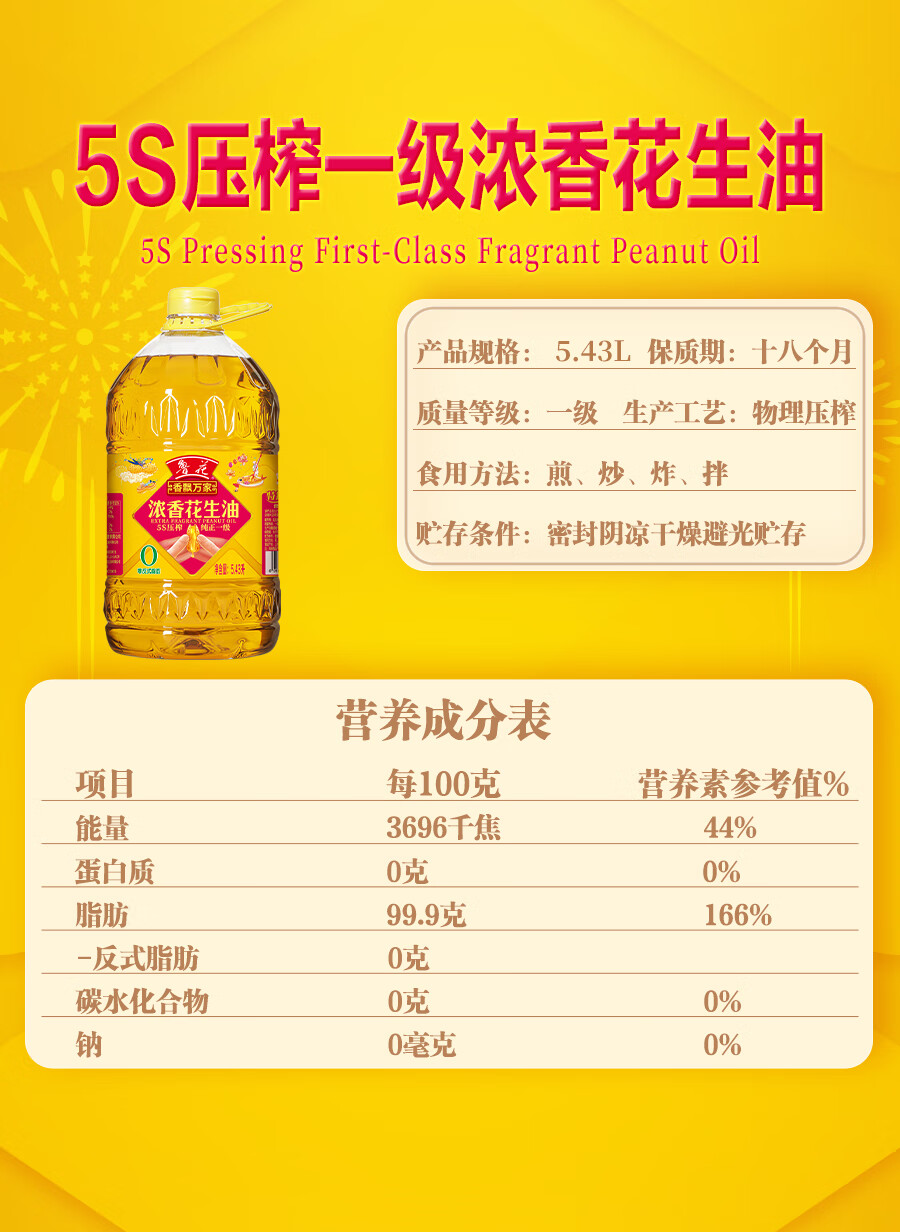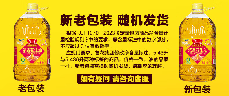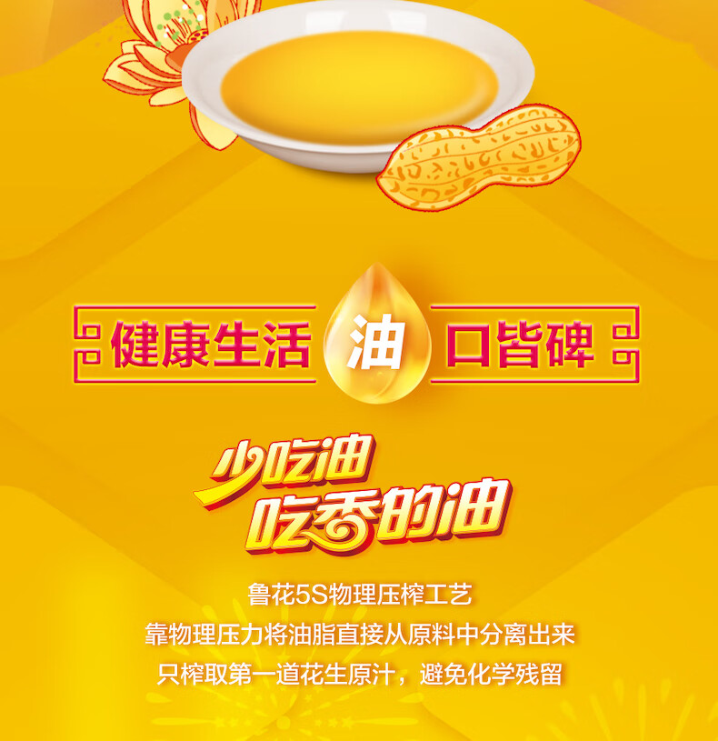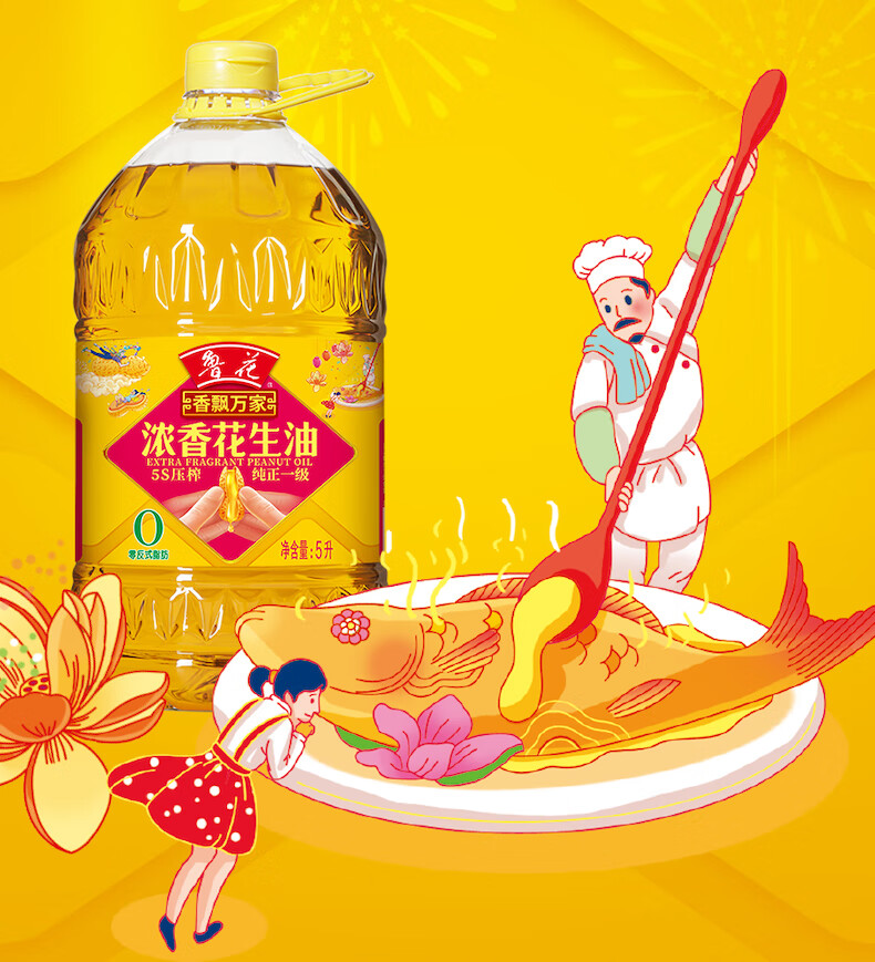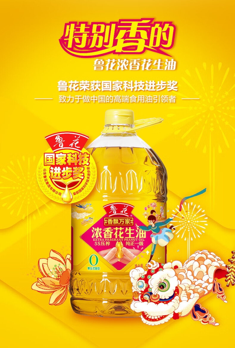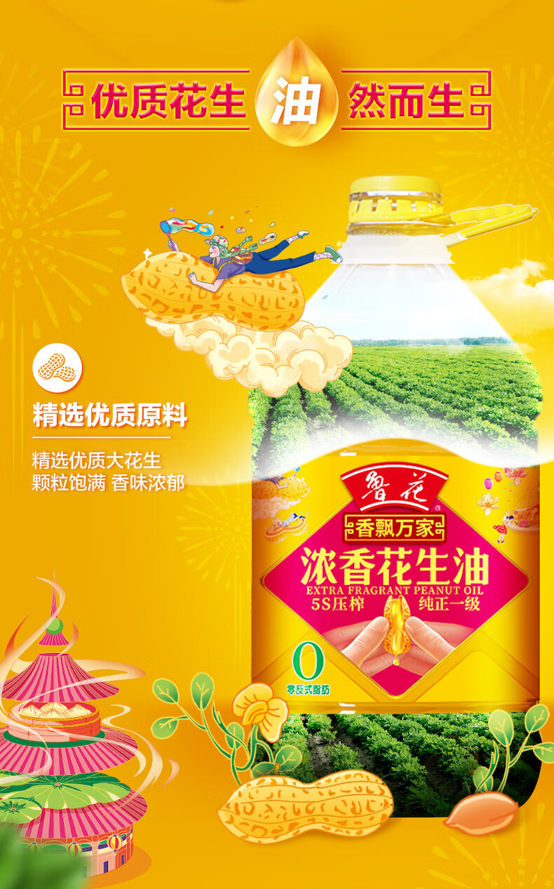 鲁花食用油 5S压榨一级 香飘万家浓香花生油 5L*1桶