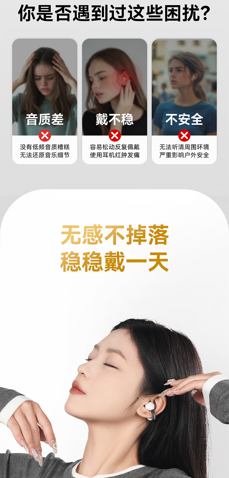 鑫羽音【精选百货】蓝牙耳机夹耳式骨传导2025新款无线运动不入耳跑步挂耳开放超长续航适用华为vivo苹果 黑色【HiFi环绕音+持久续航】 【手机通用】蓝牙5.4-单耳