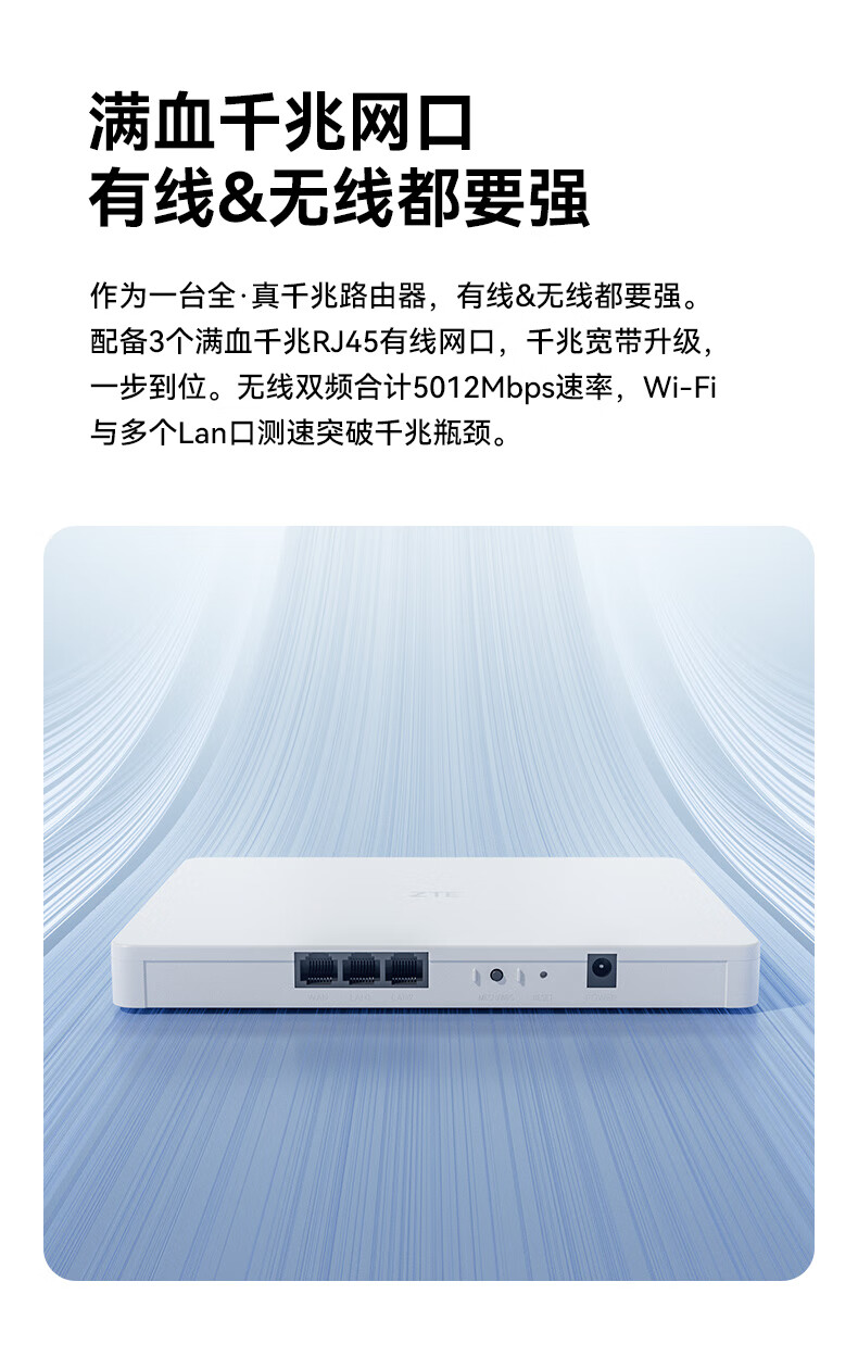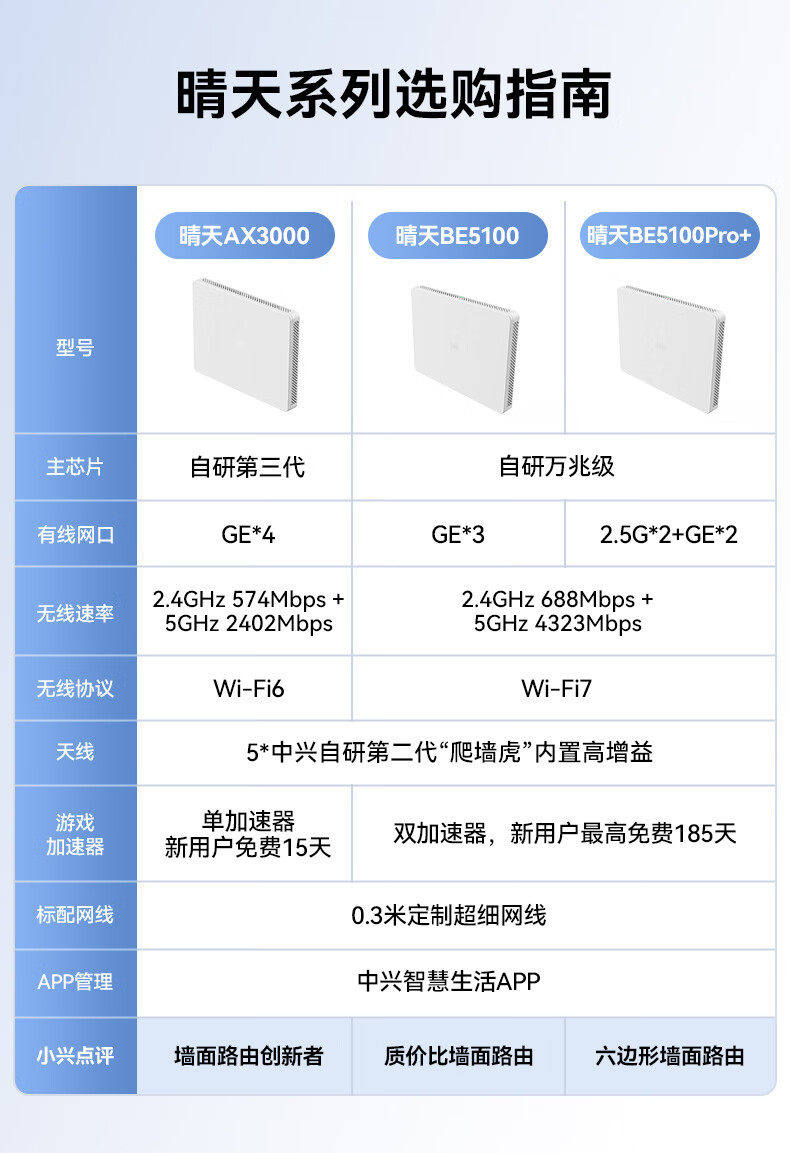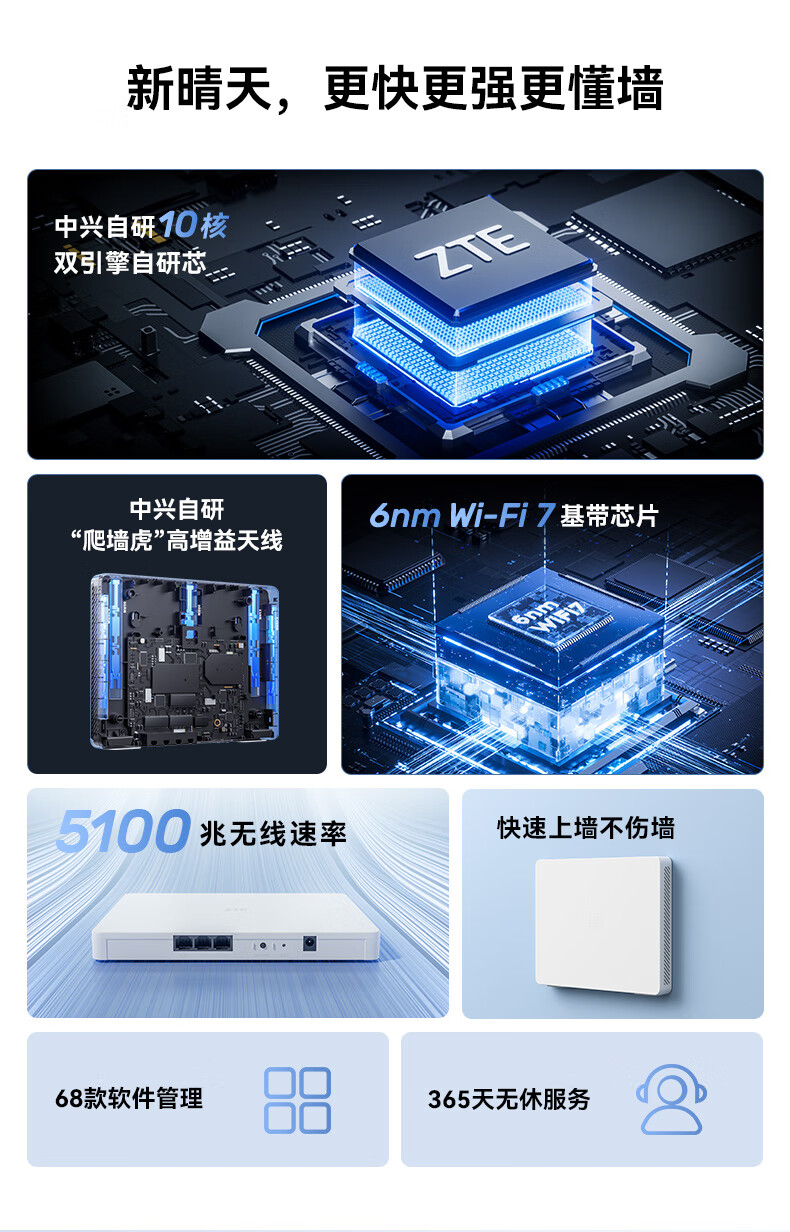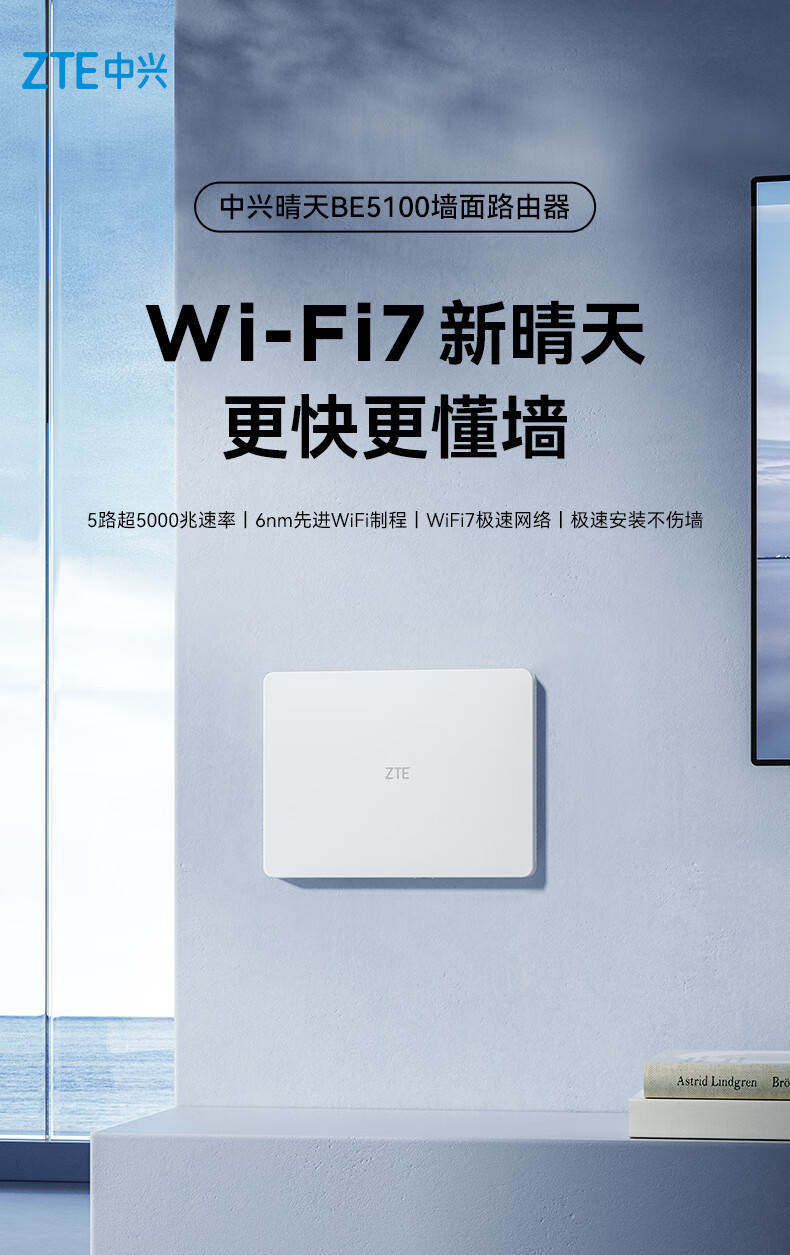中兴(ZTE)【晴天墙面路由器】BE5100 自研芯WiFi7 千兆双频 全屋组网 5颗信号放大器兼容WiFi6游戏加速