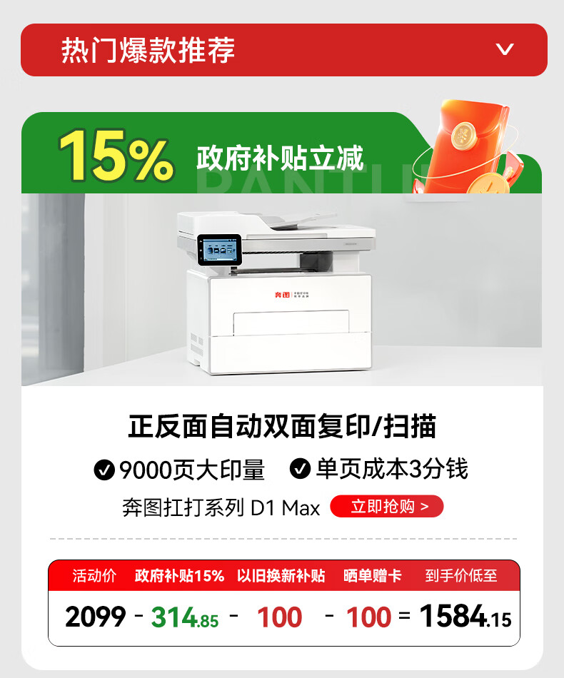 奔图(PANTUM)扛打系列D1 激光打印机办公家用 自动双面打印机 复印扫描一体机 手机无线单页3分钱