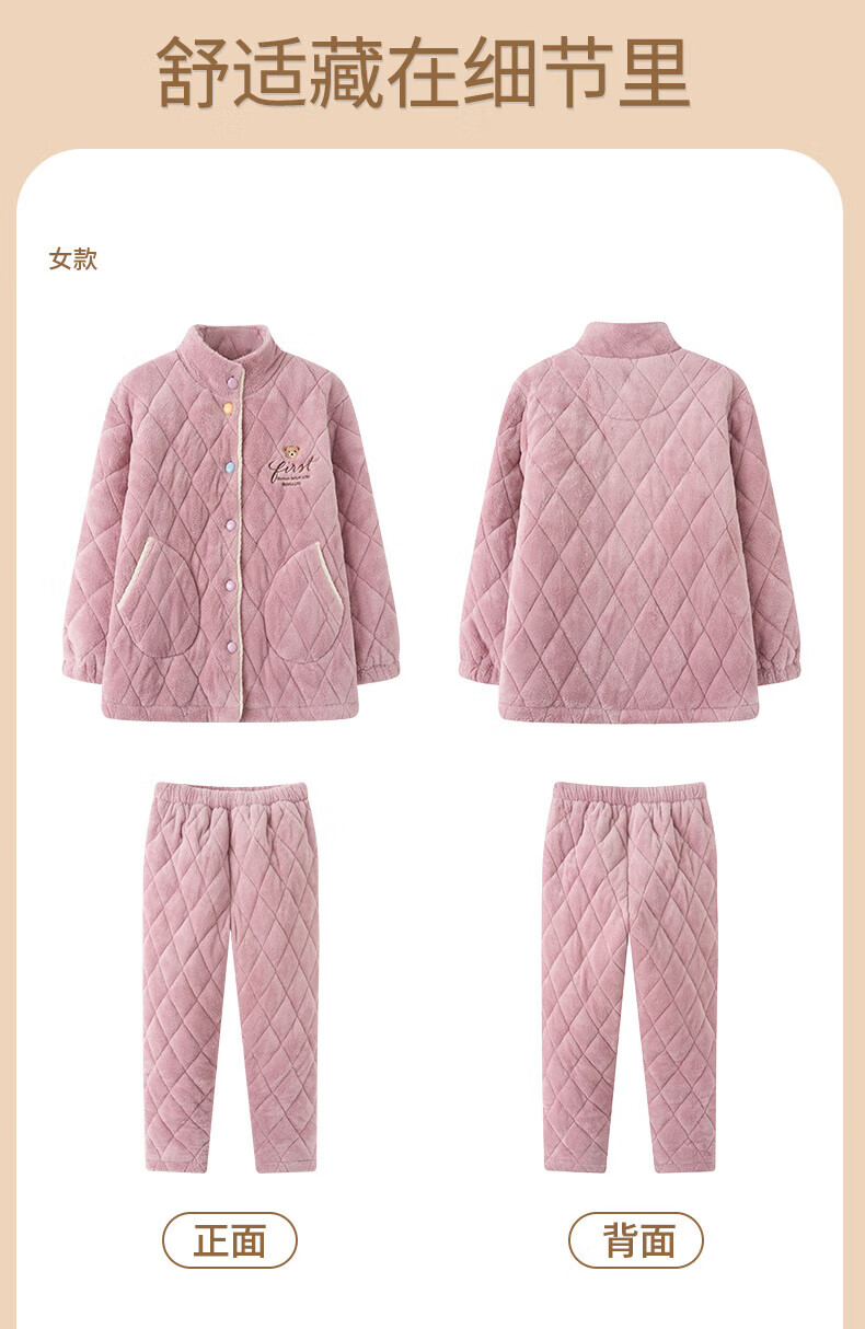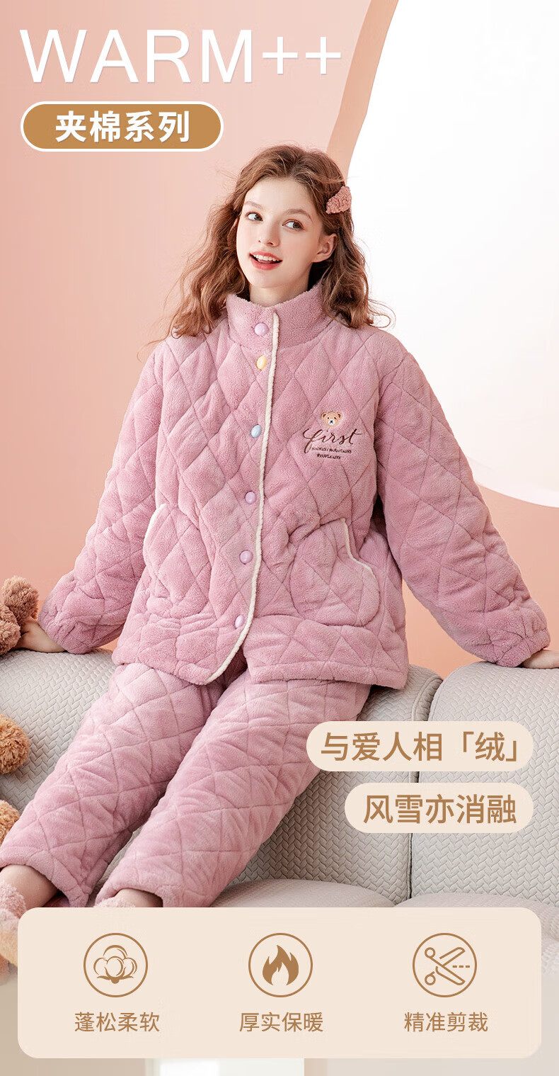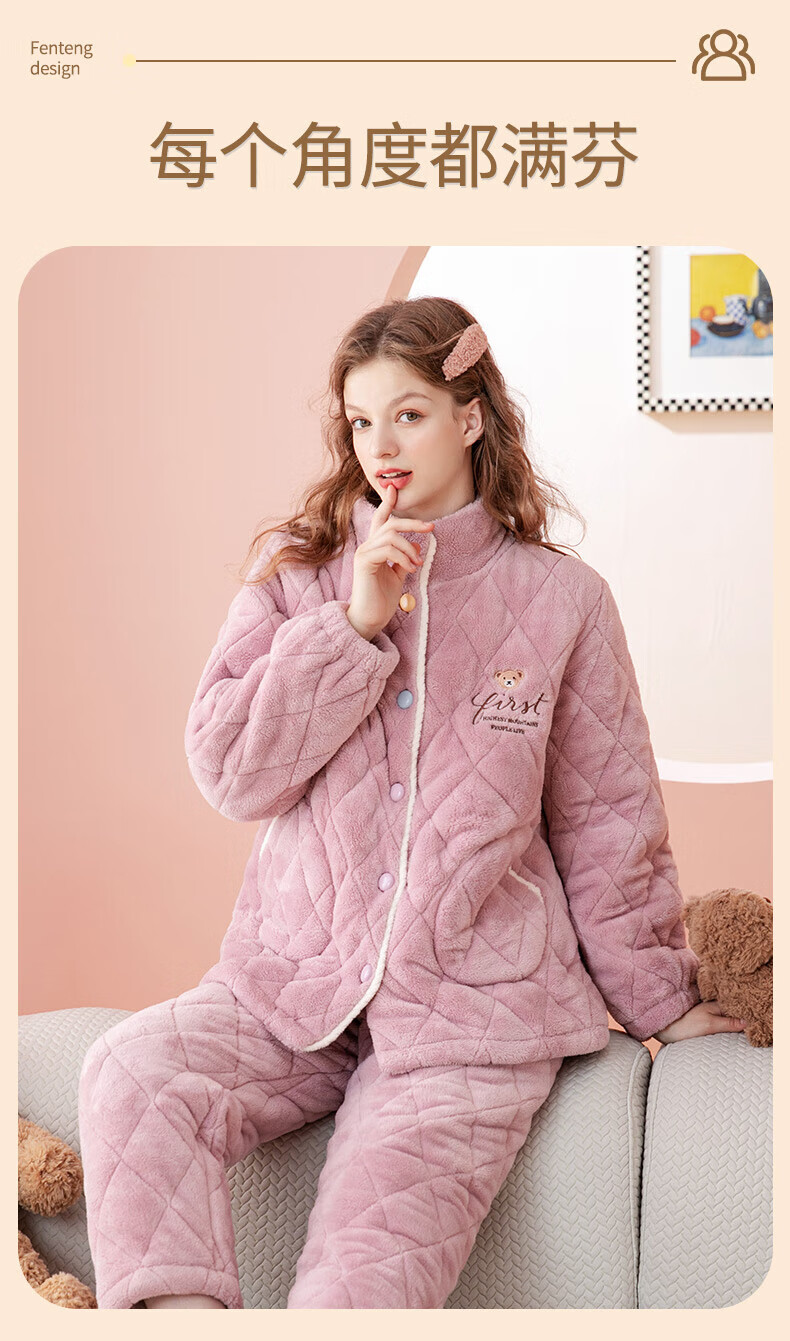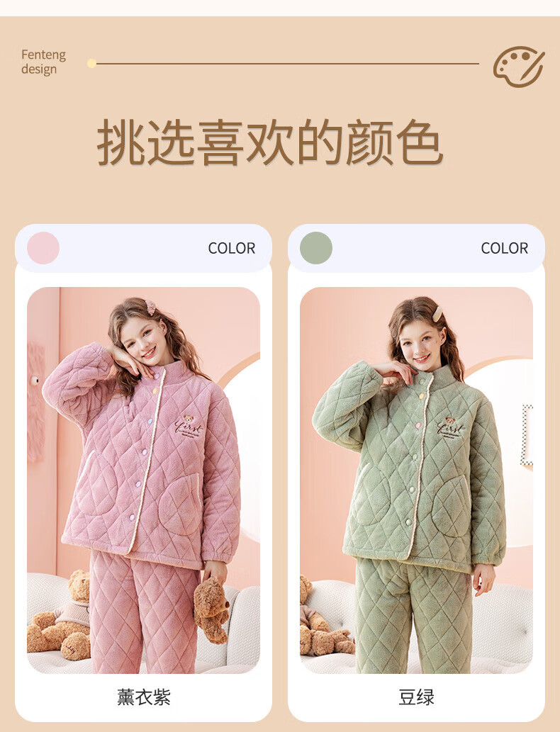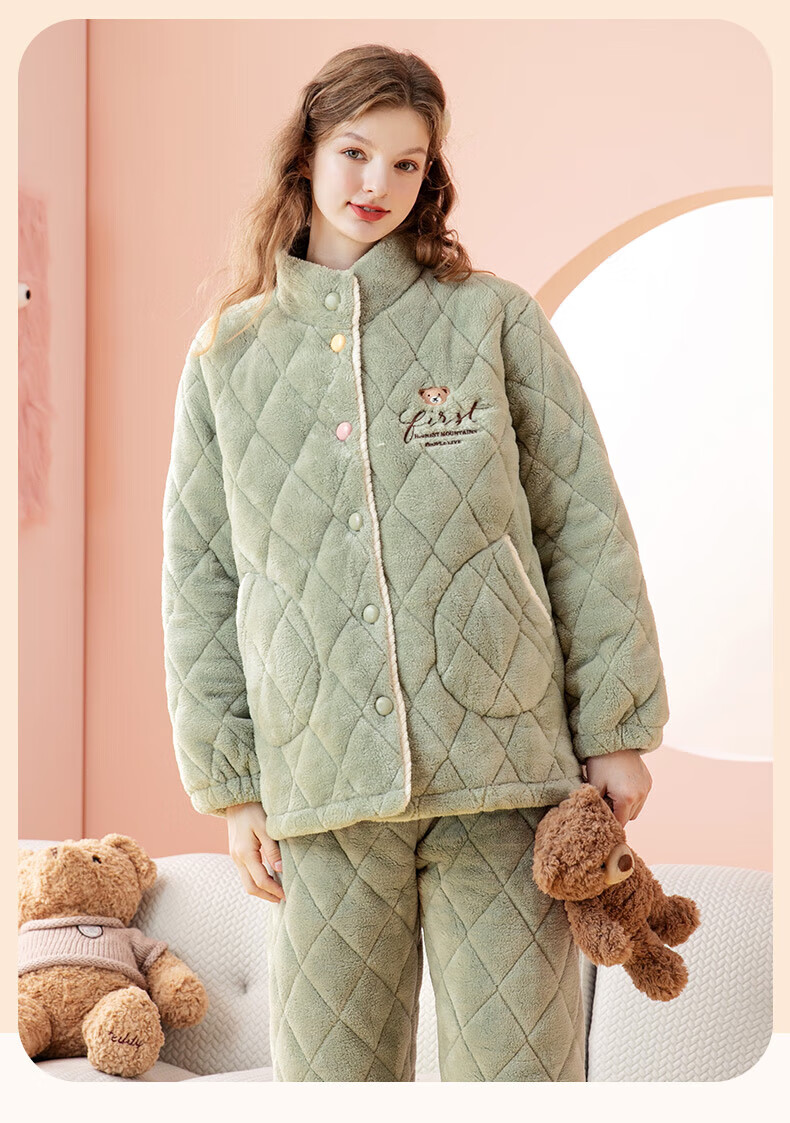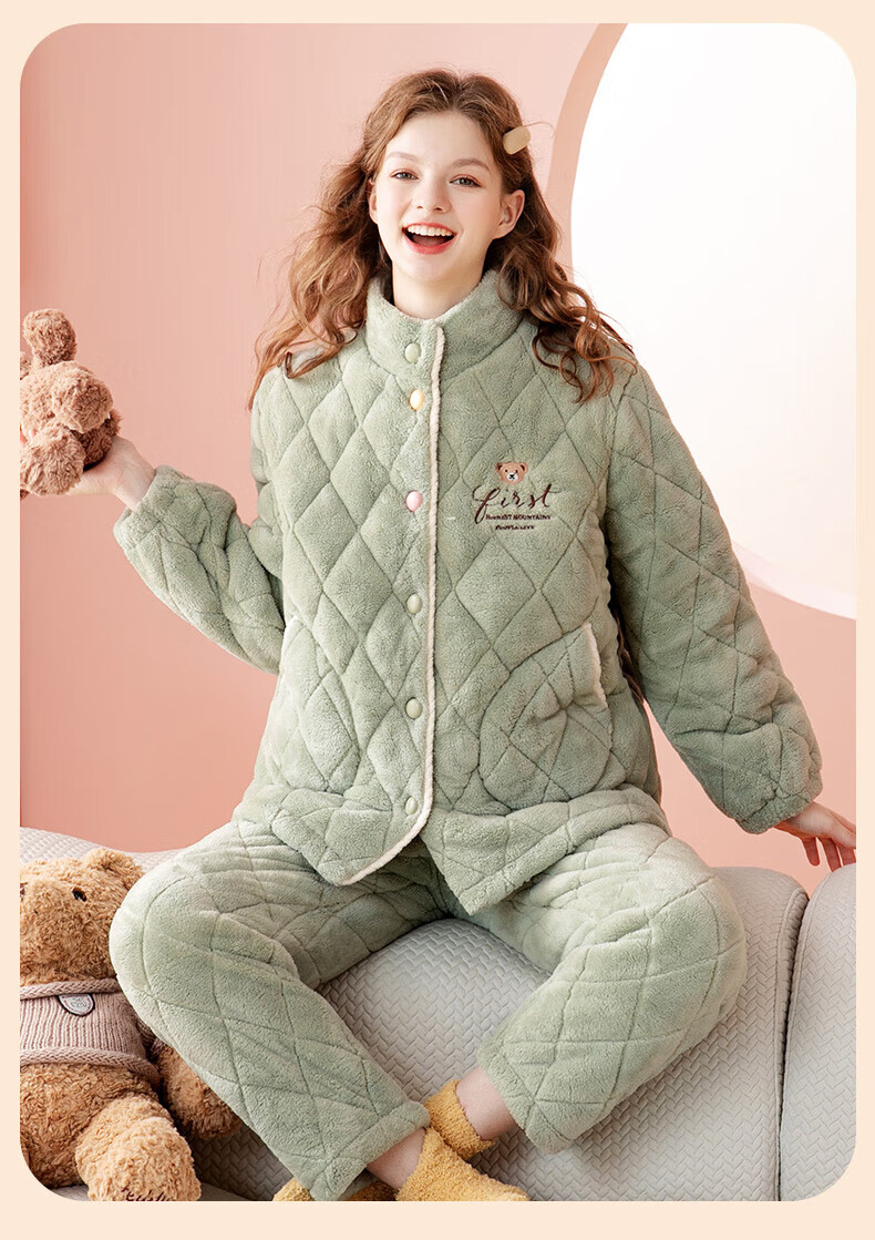 芬腾睡衣女秋冬温暖夹棉立领暖脖防静电绒软家居服睡衣套装 豆绿 M