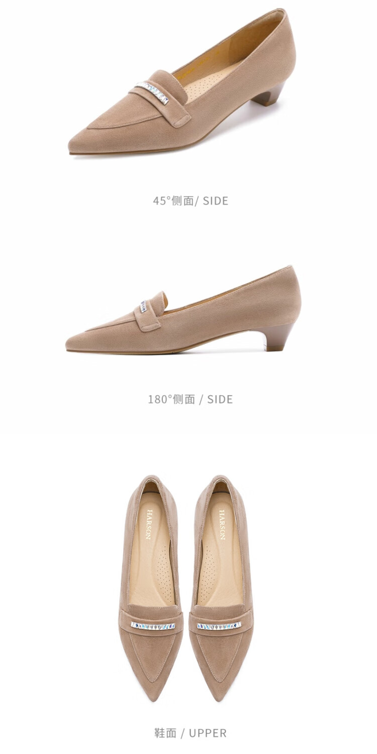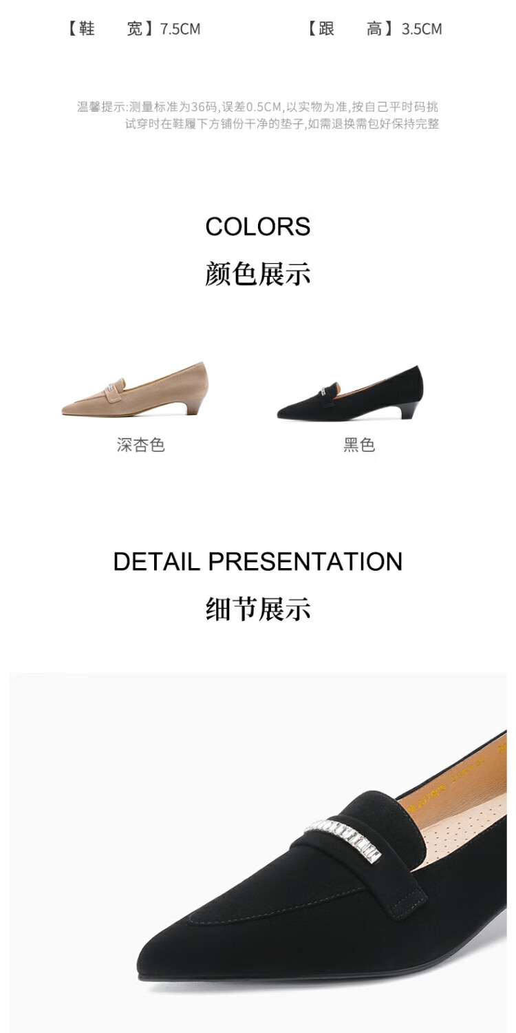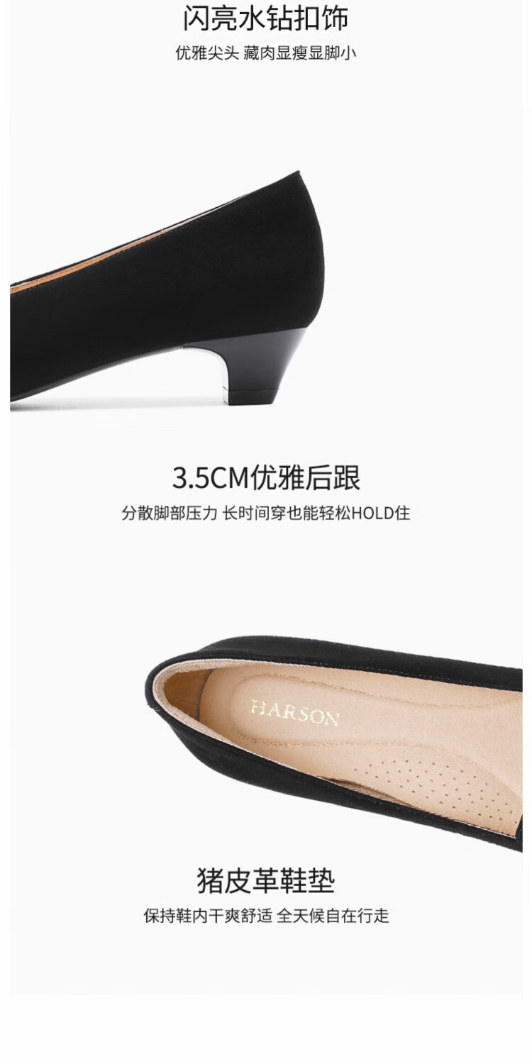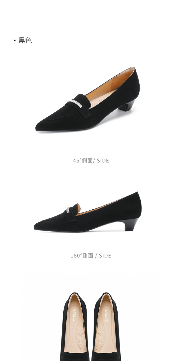 哈森尖头水钻中粗跟浅口单鞋通勤百搭女鞋2025秋季新款HL257905 黑色 羊反绒面革 34