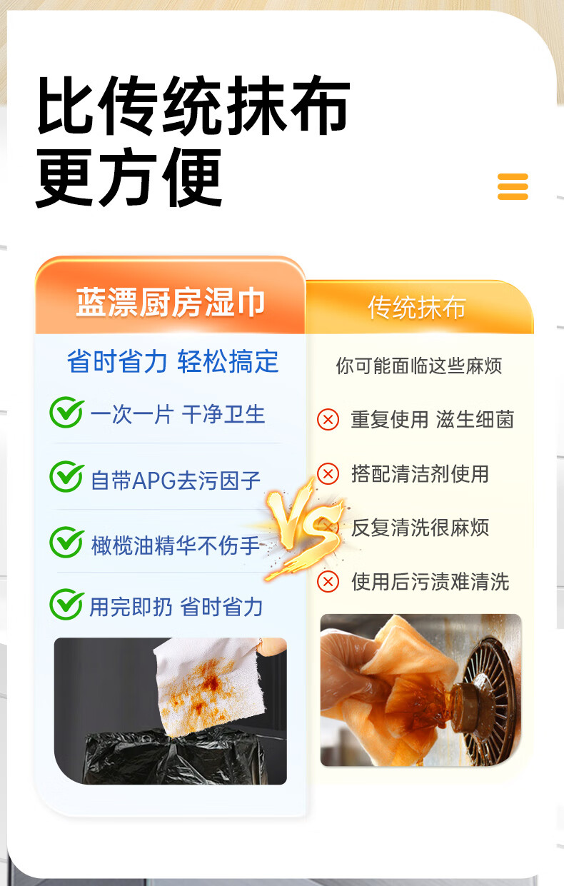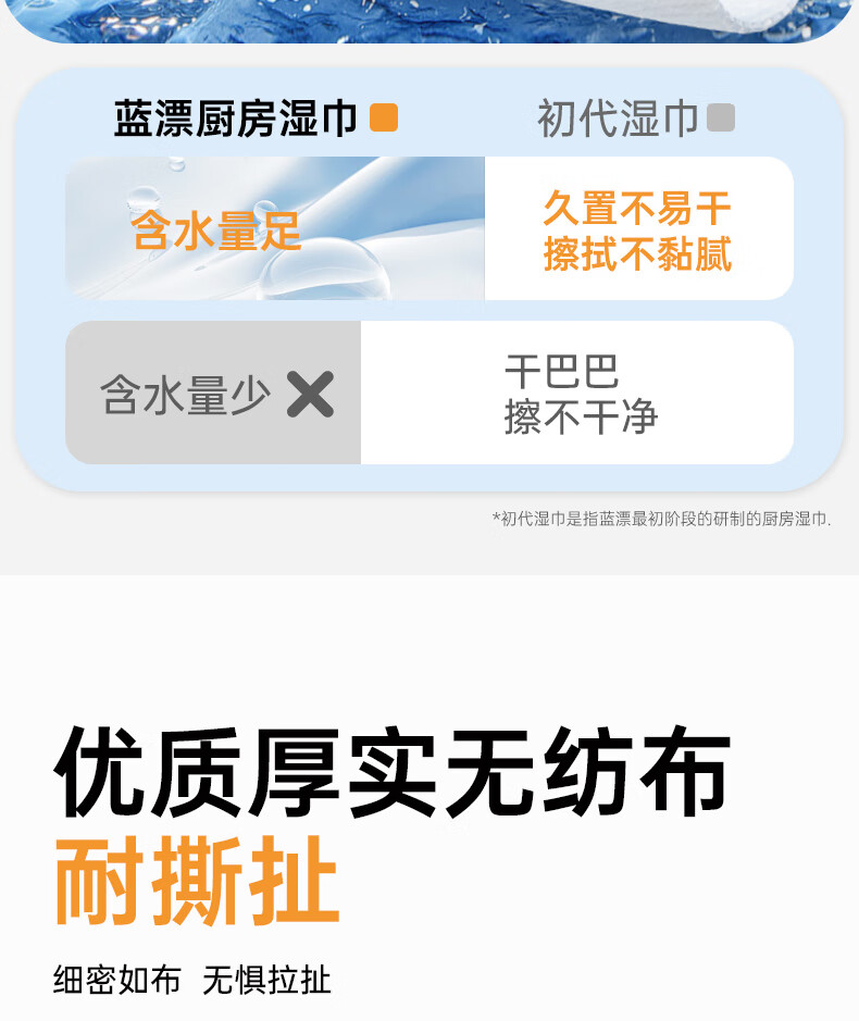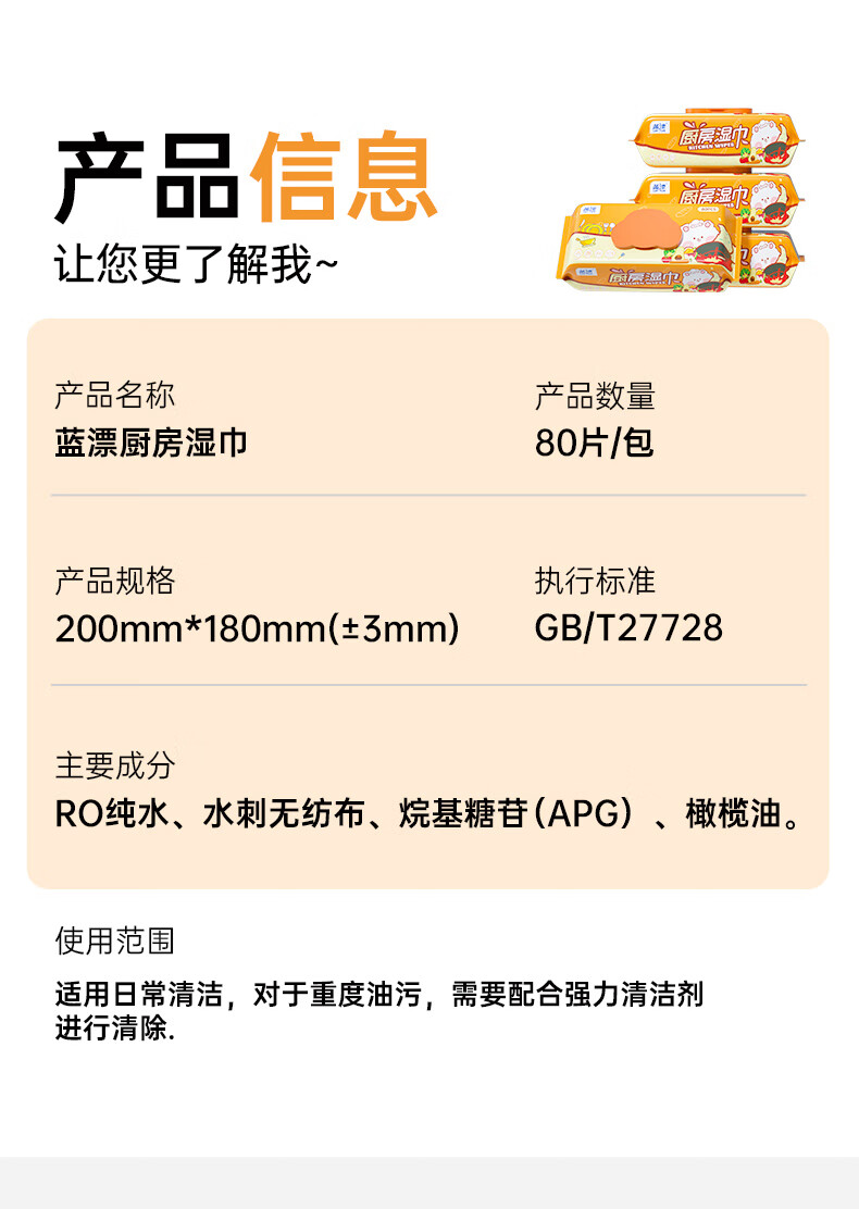 【20cm加长】蓝漂萌宠厨房湿巾去油去污渍去油污一次性清洁湿抹布 1层 80抽*1包