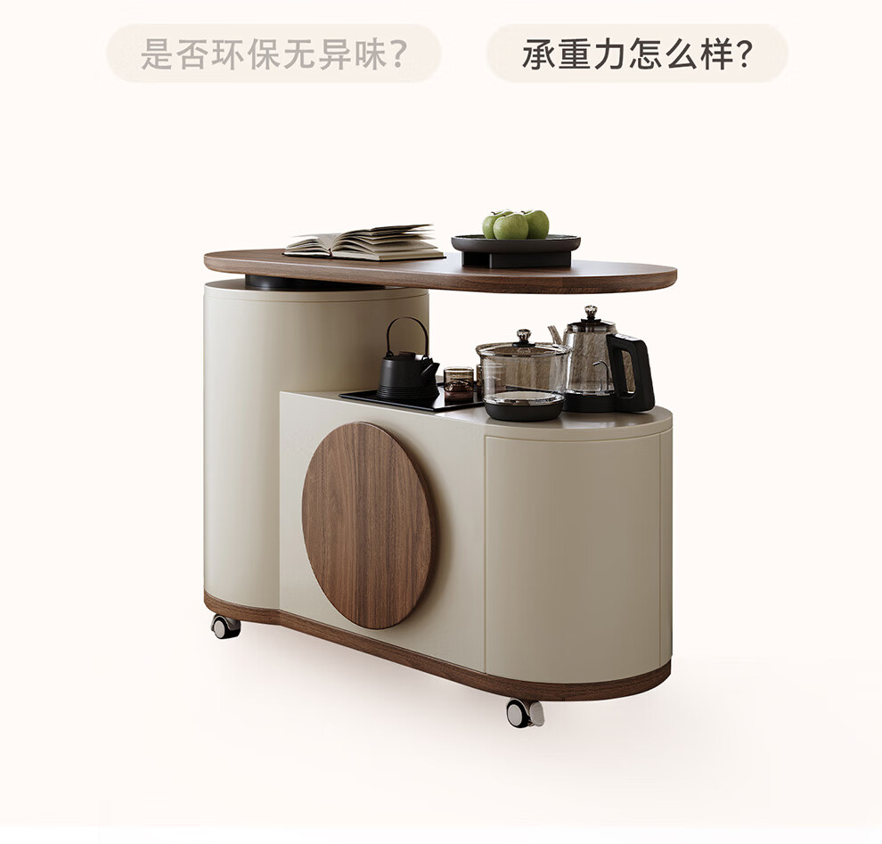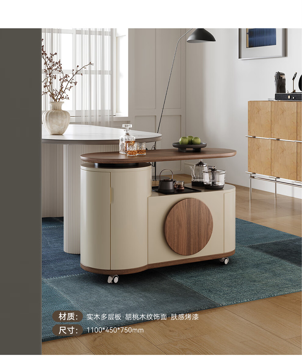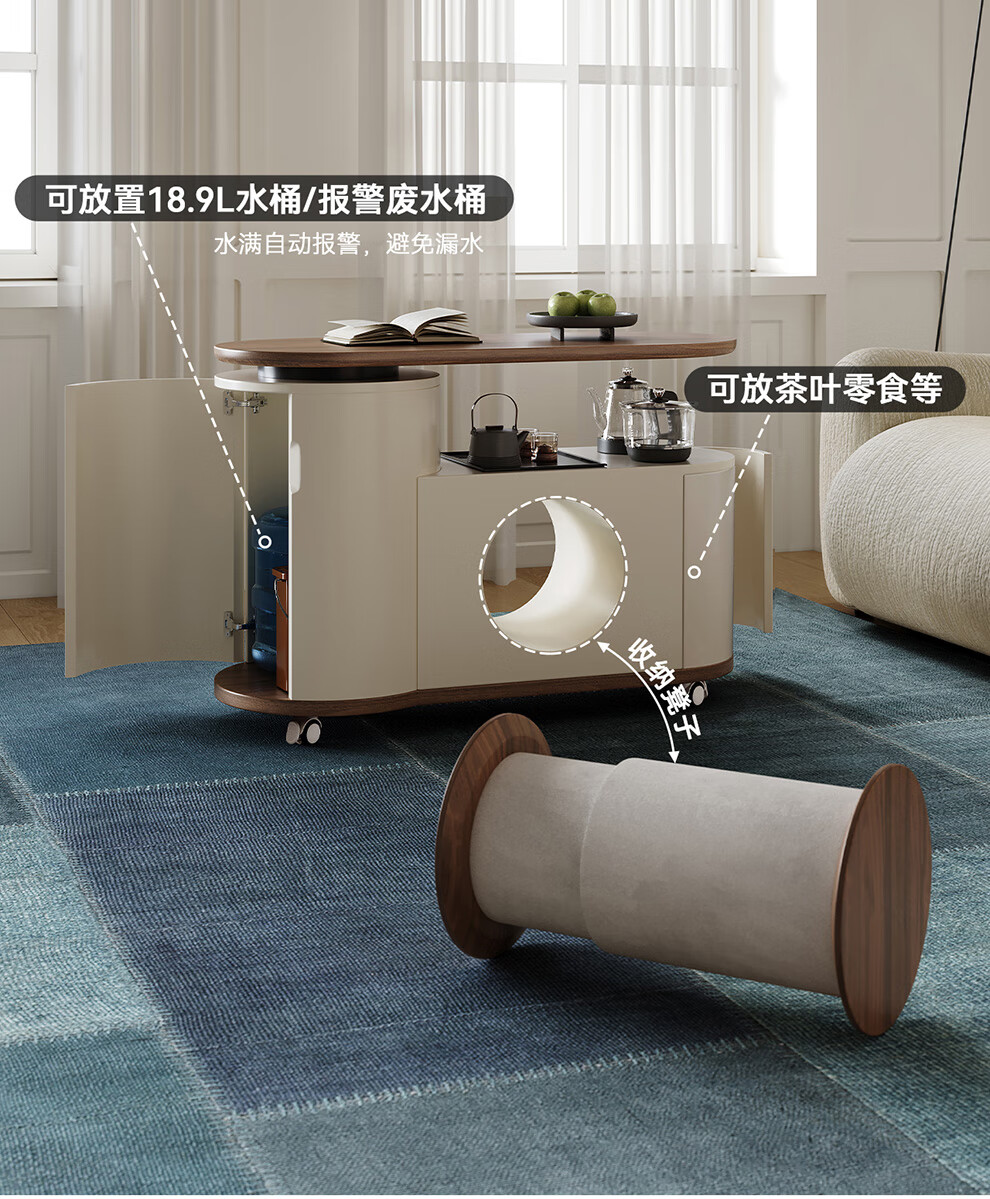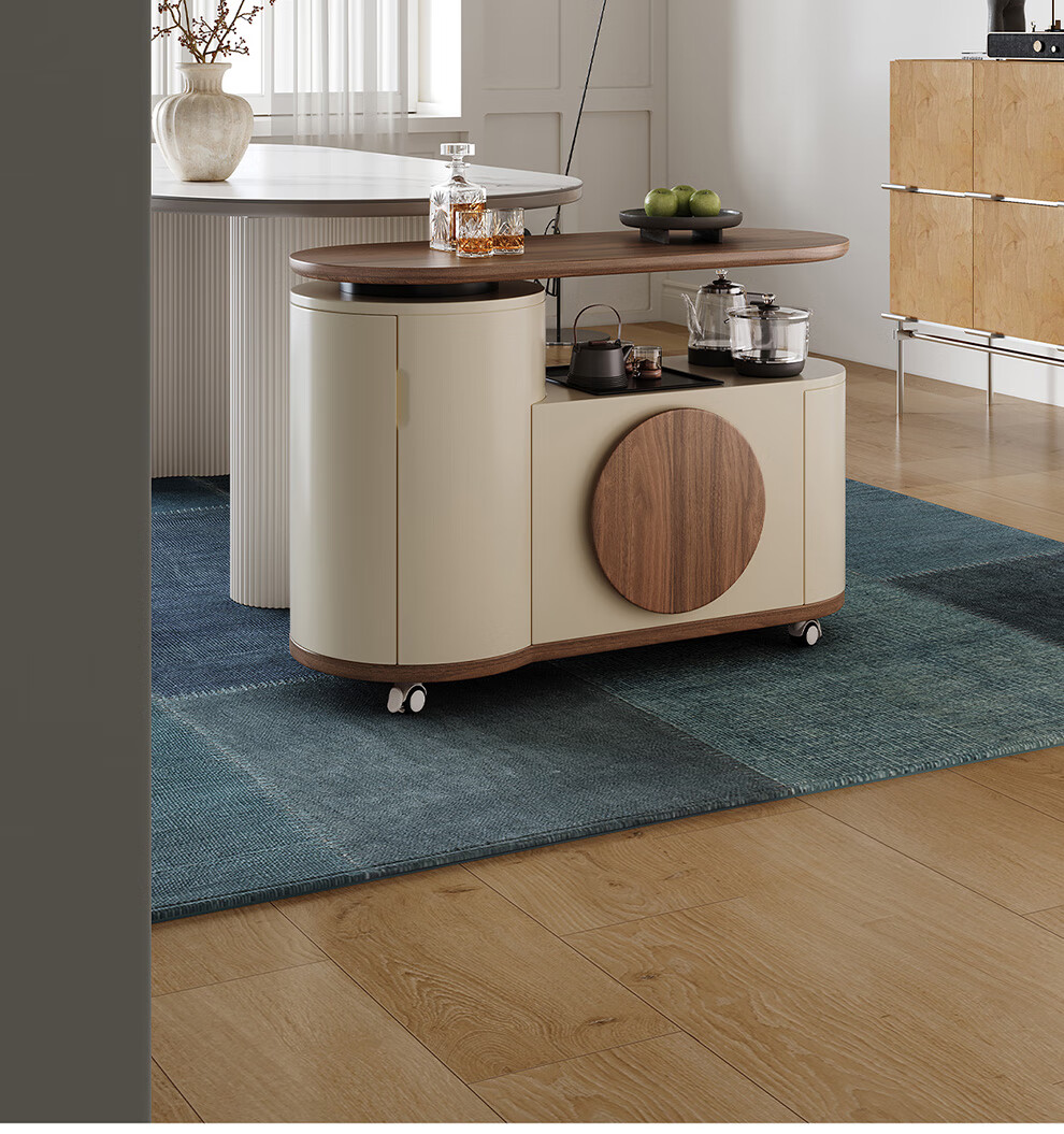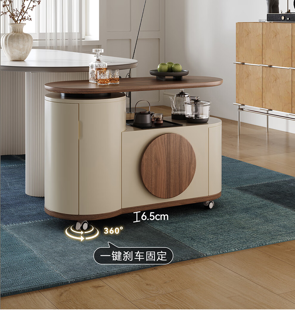 凡创佳品移动茶几茶台客厅小户型沙发边几中古奶油风实木旋转茶桌小推车 1.1m移动茶台-火山岩茶炉【带可收纳凳*2】