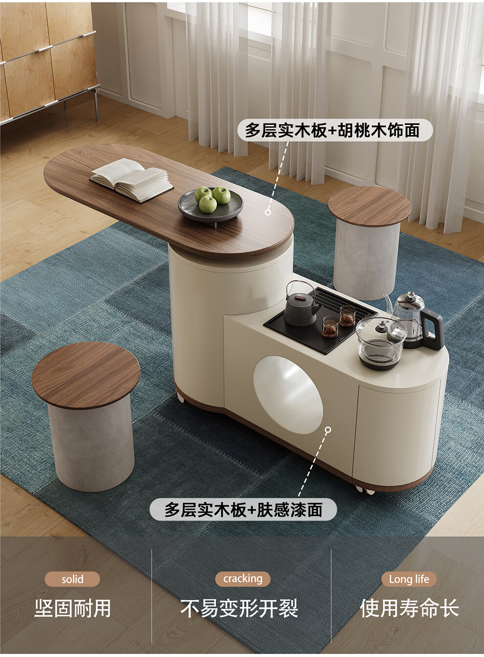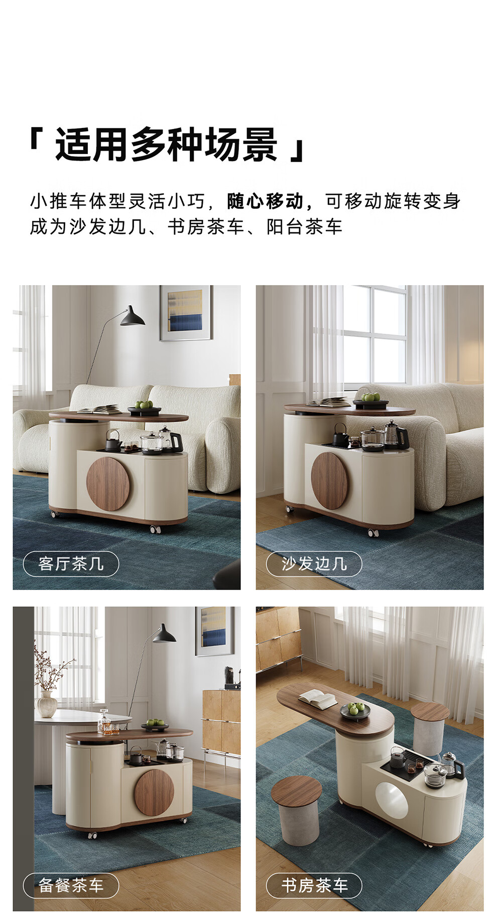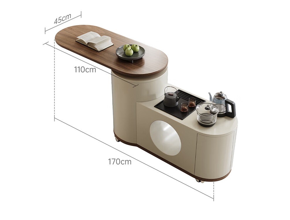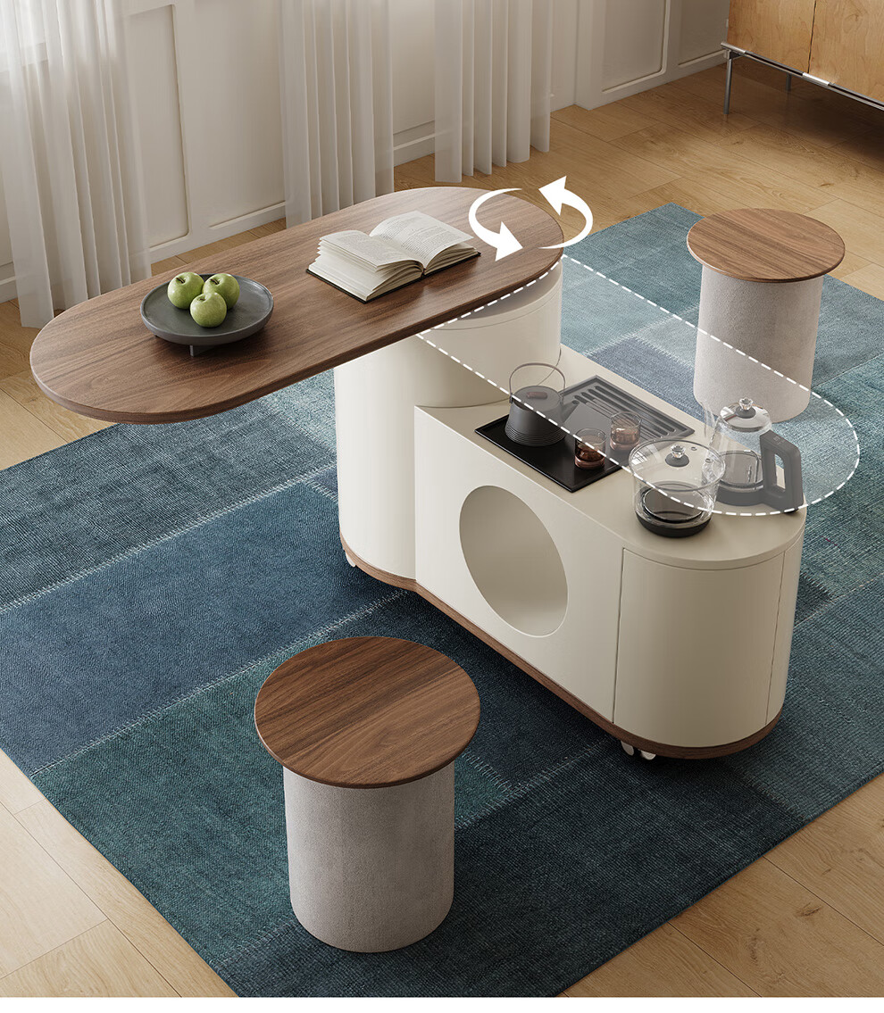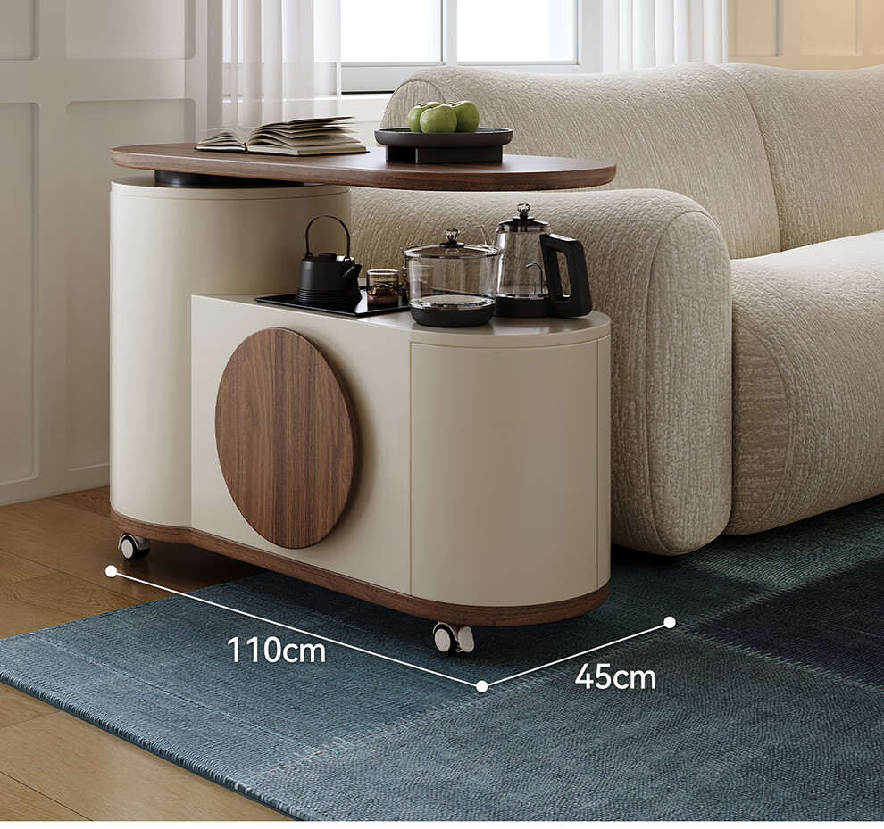 凡创佳品移动茶几茶台客厅小户型沙发边几中古奶油风实木旋转茶桌小推车 1.1m移动茶台-火山岩茶炉【带可收纳凳*2】