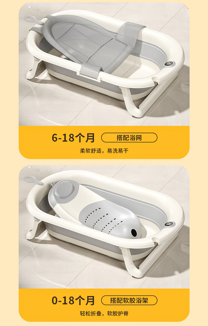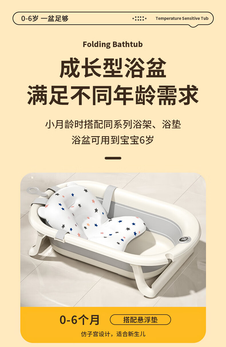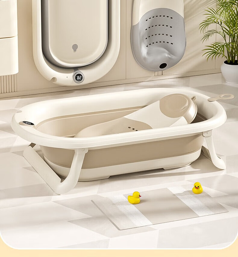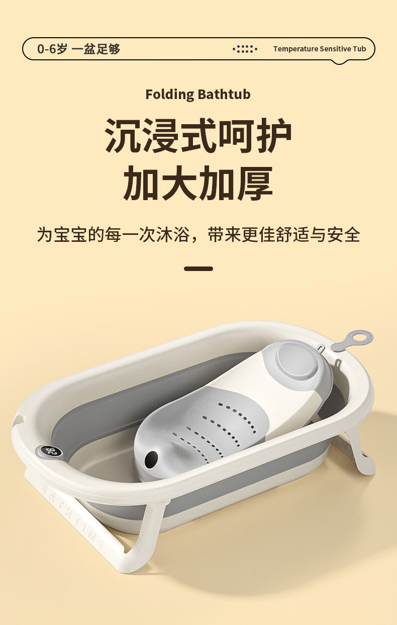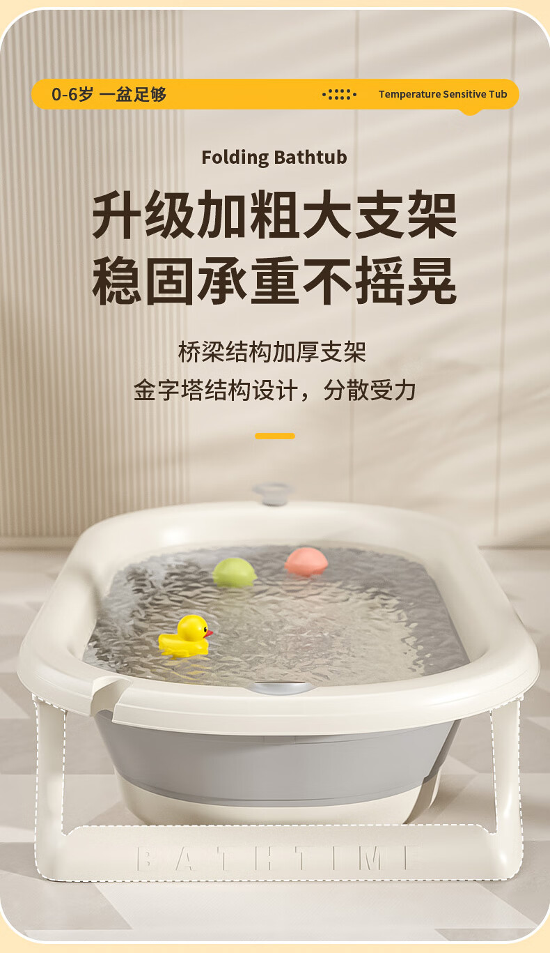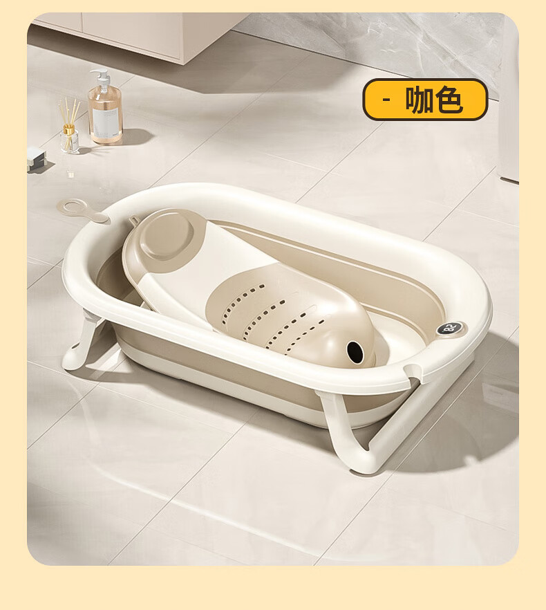 婴儿折叠浴盆新生婴幼儿宝宝大号坐躺托浴架可折叠洗澡盆儿童用品 【触屏感温】棕+3个盆+浴架+垫