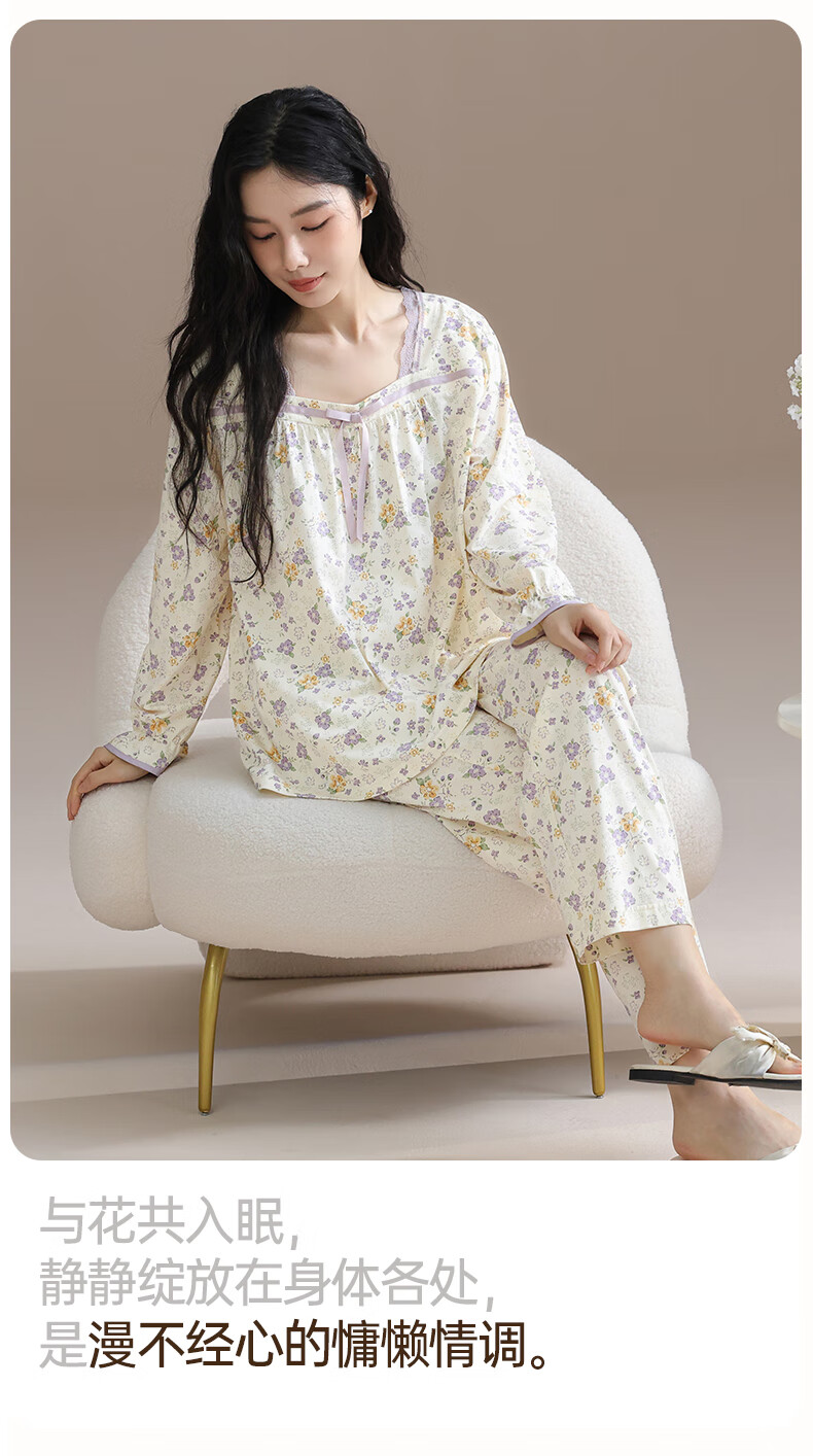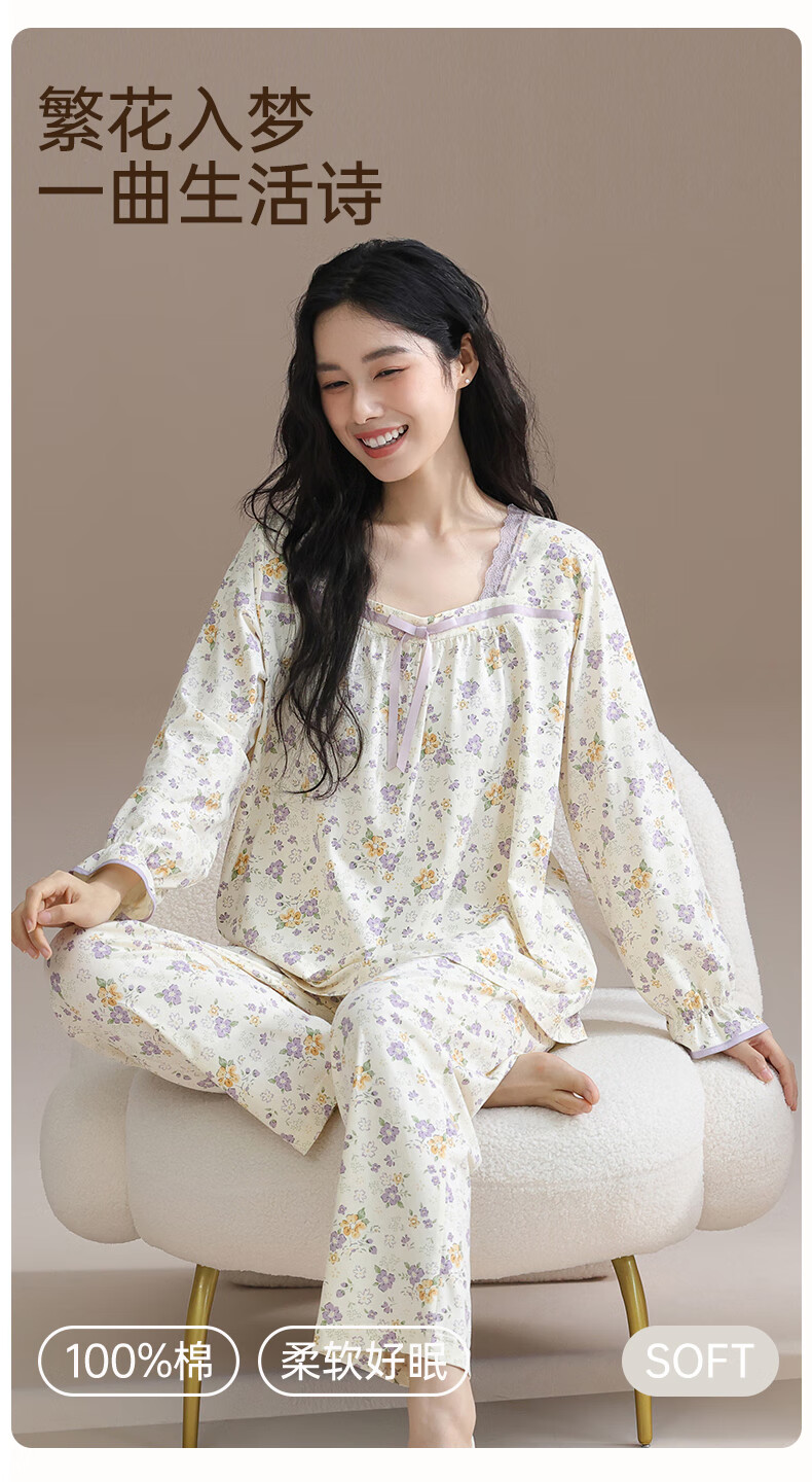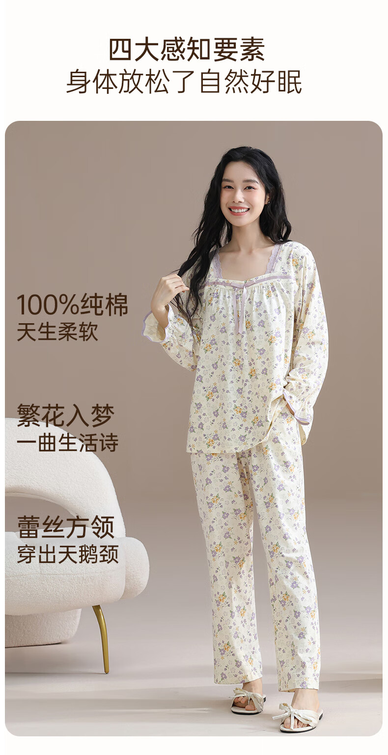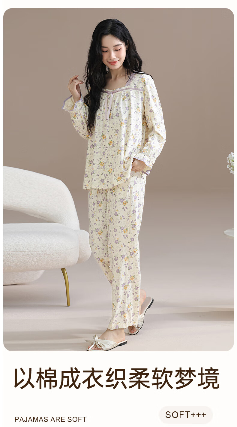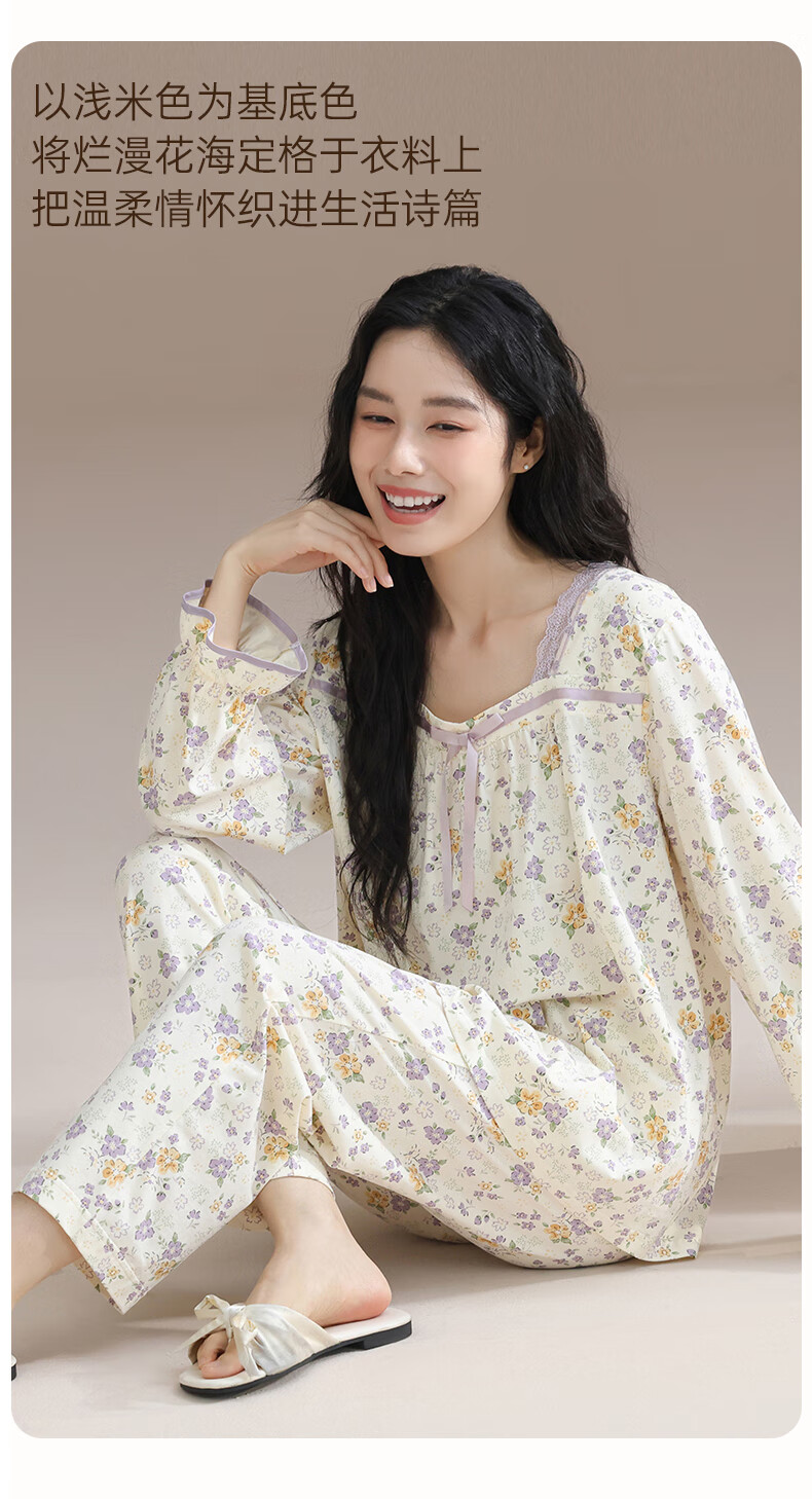 玛伦萨纯棉睡衣女春秋季2025新款可外穿长袖长裤小碎花女士家居服套装 米白底花 XL