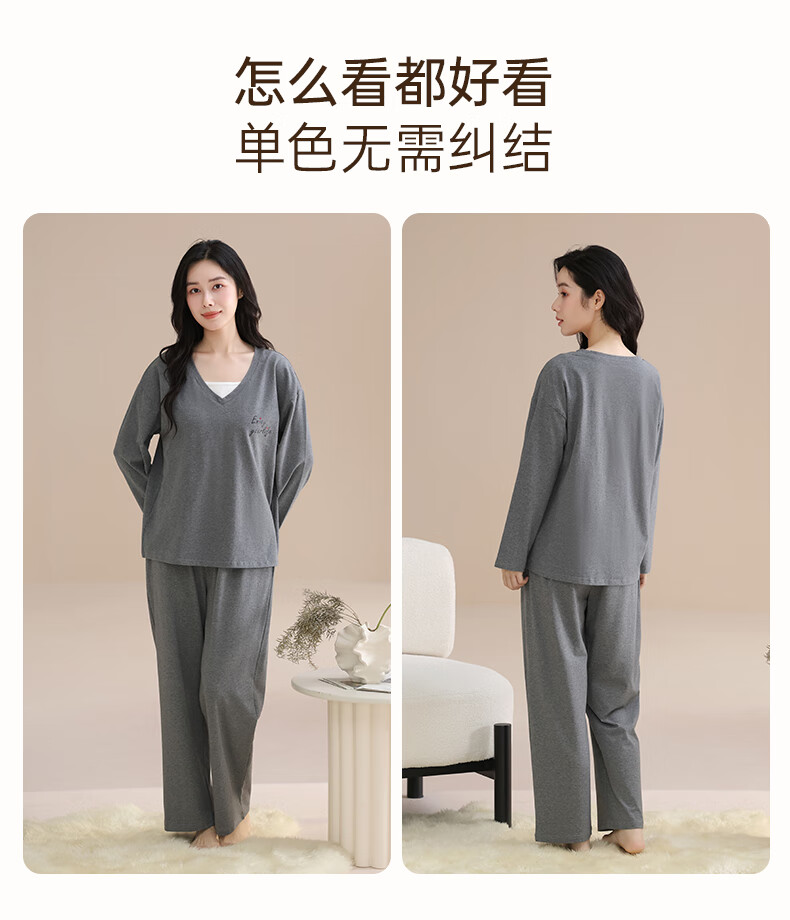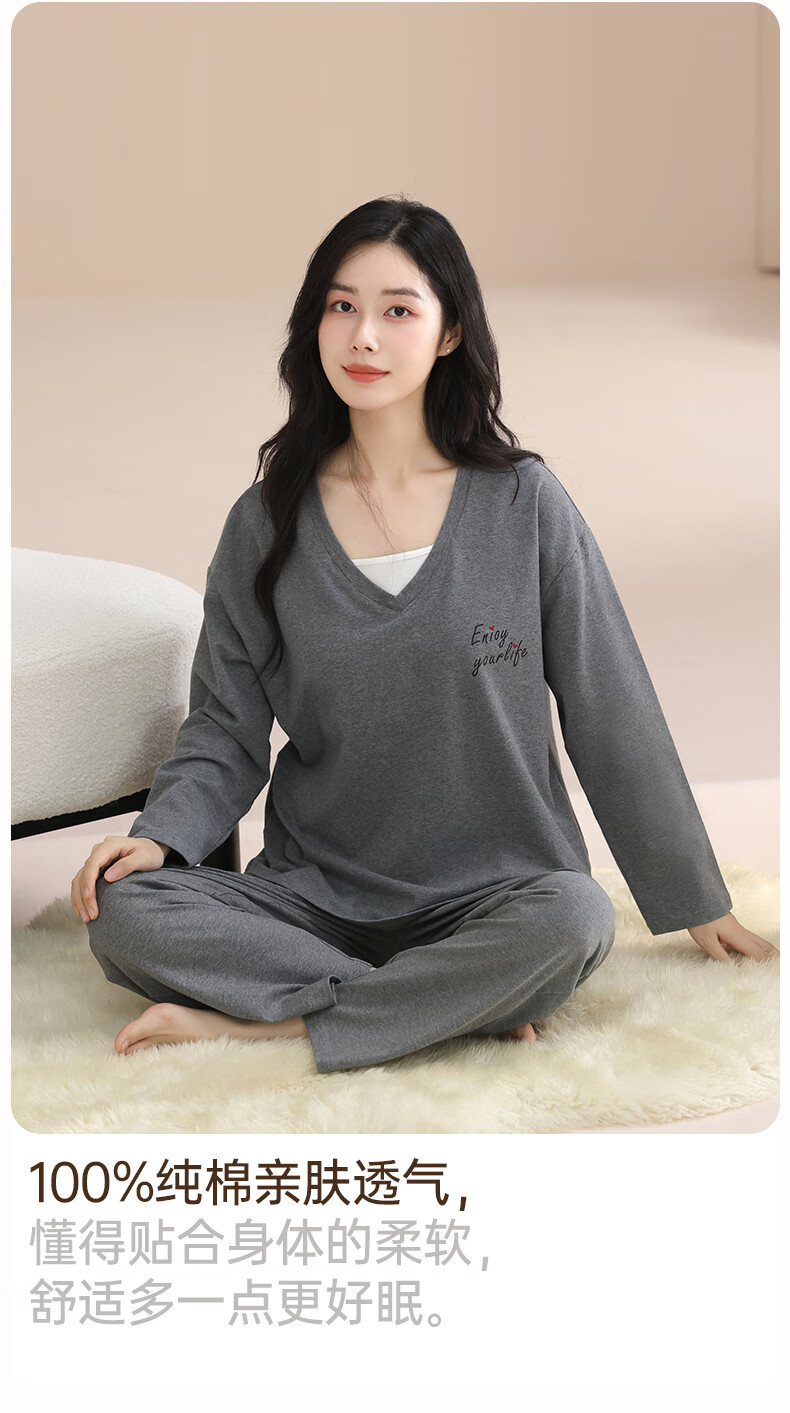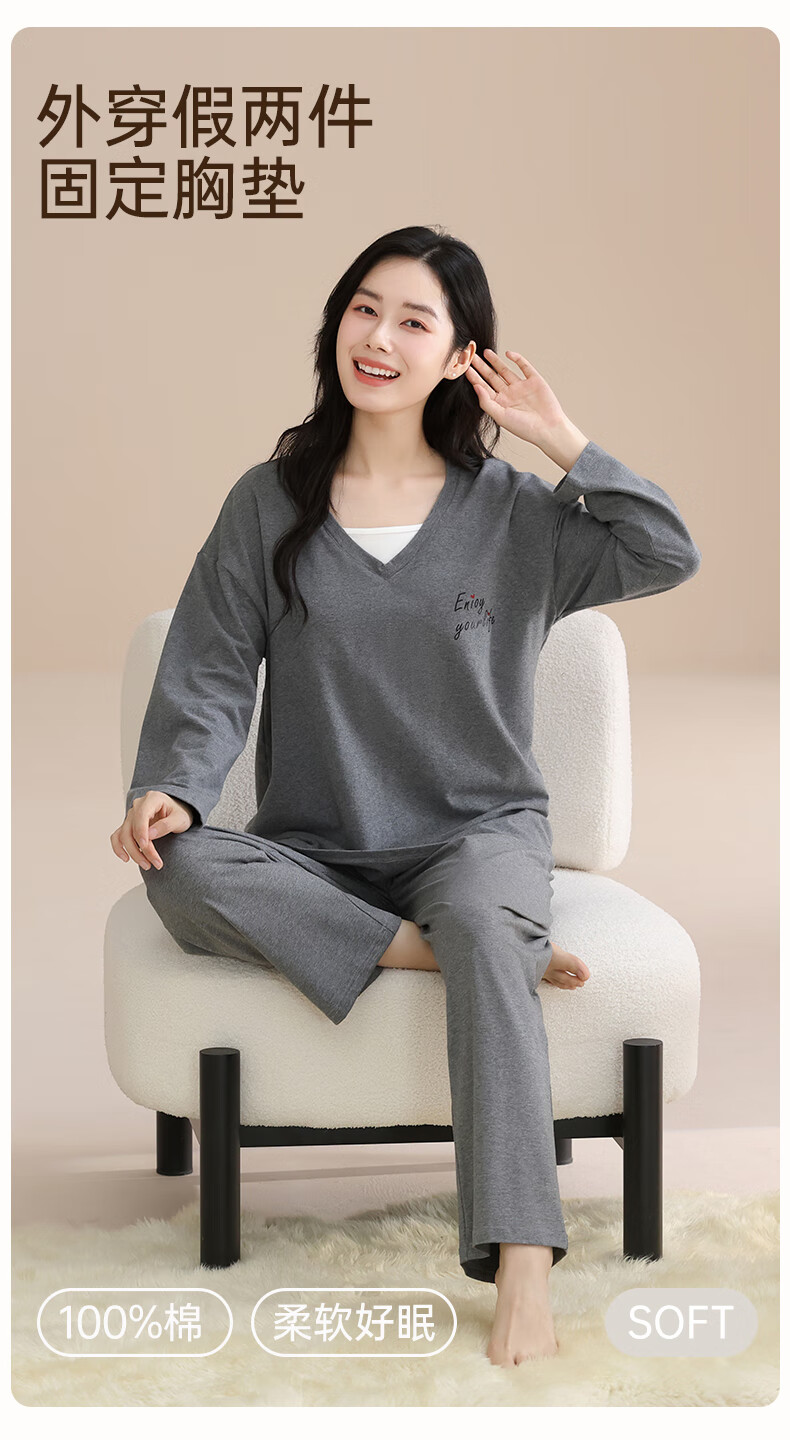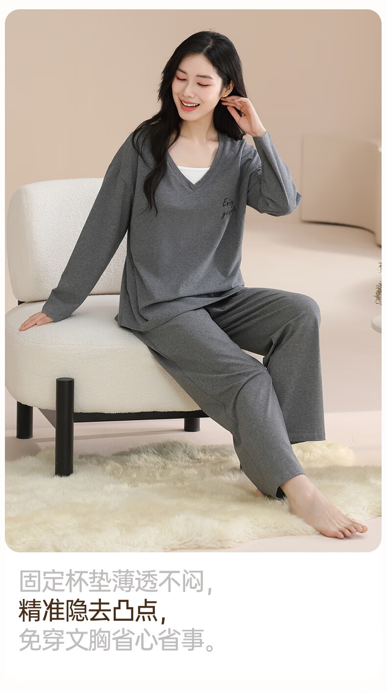 玛伦萨带胸垫睡衣女100%纯棉春秋季可外穿2025新款长袖长裤女士家居服 花灰 M