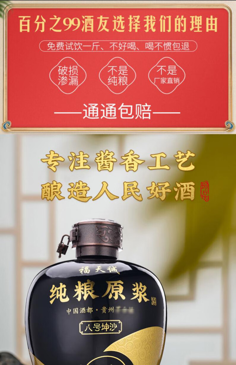 福天诚茅台镇纯粮食酱香型白酒53度十斤大坛高粱酒坤沙酒散装白酒泡酒 53度 5L 1坛 八号坤沙送酒提子