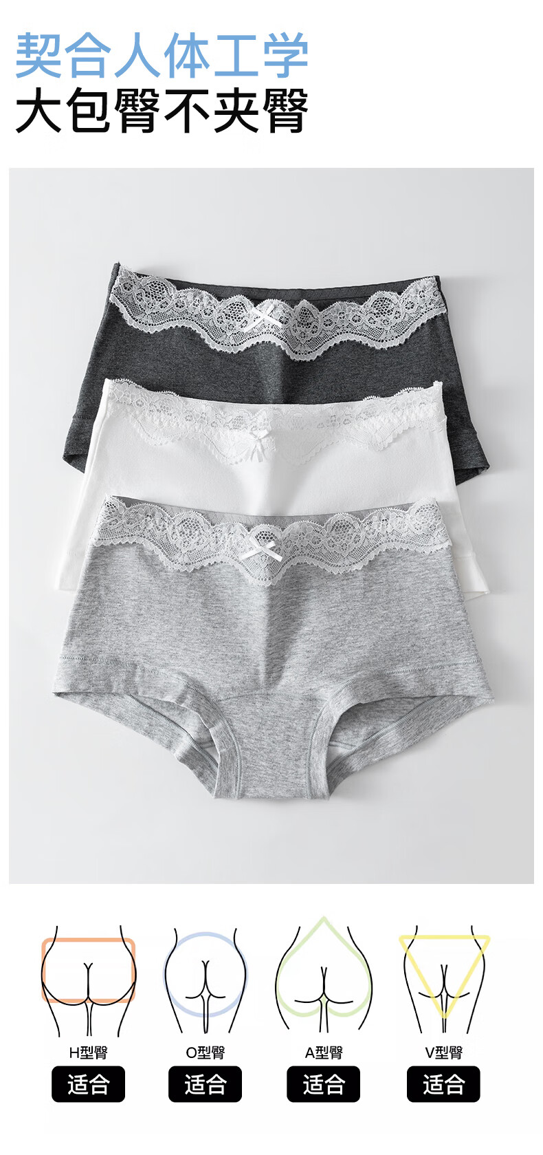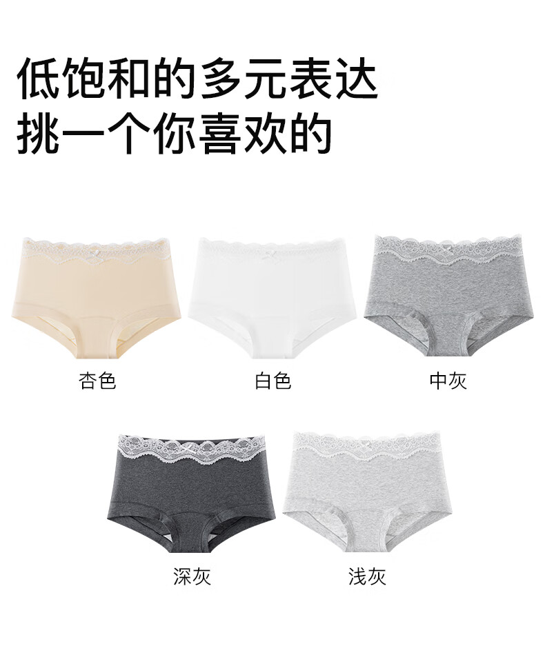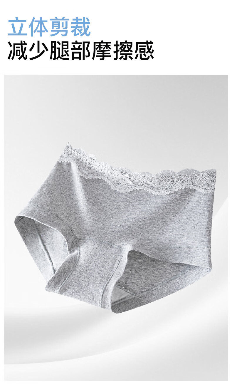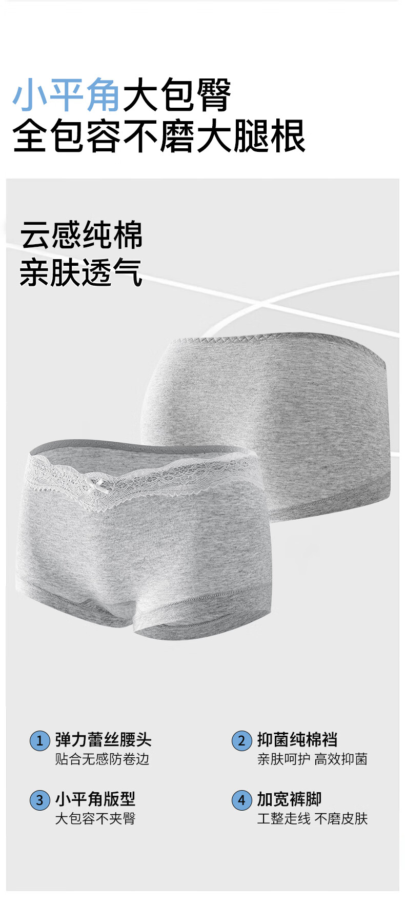 真维斯(Jeanswest)真维斯女士内裤女生纯棉亲肤宽松中腰抗菌裆少女蕾丝小平角短裤头 【4条】中灰+白色+杏色+深灰 M 80-100斤