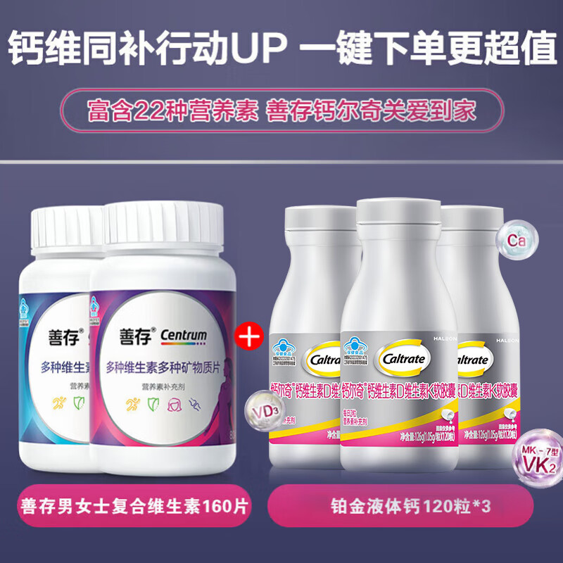 钙尔奇铂金液体钙120粒*3 男女士中老年钙片 补钙维生素D维生素k2