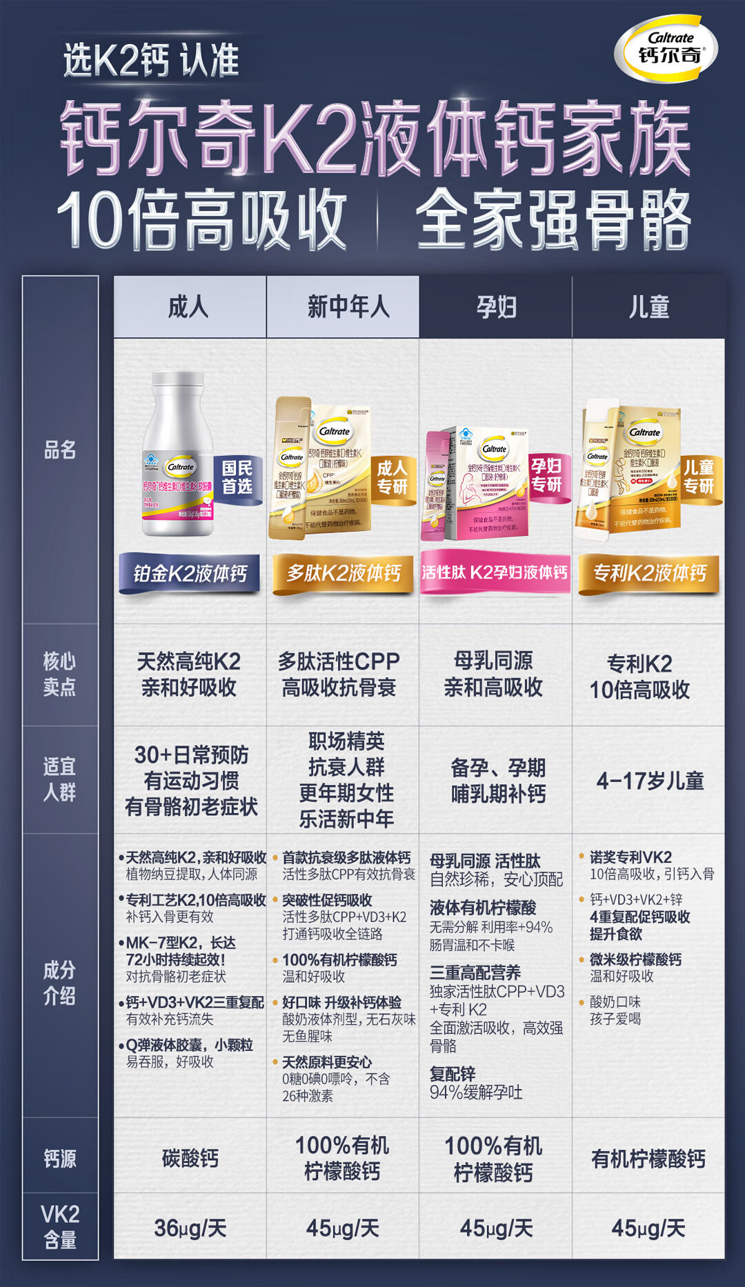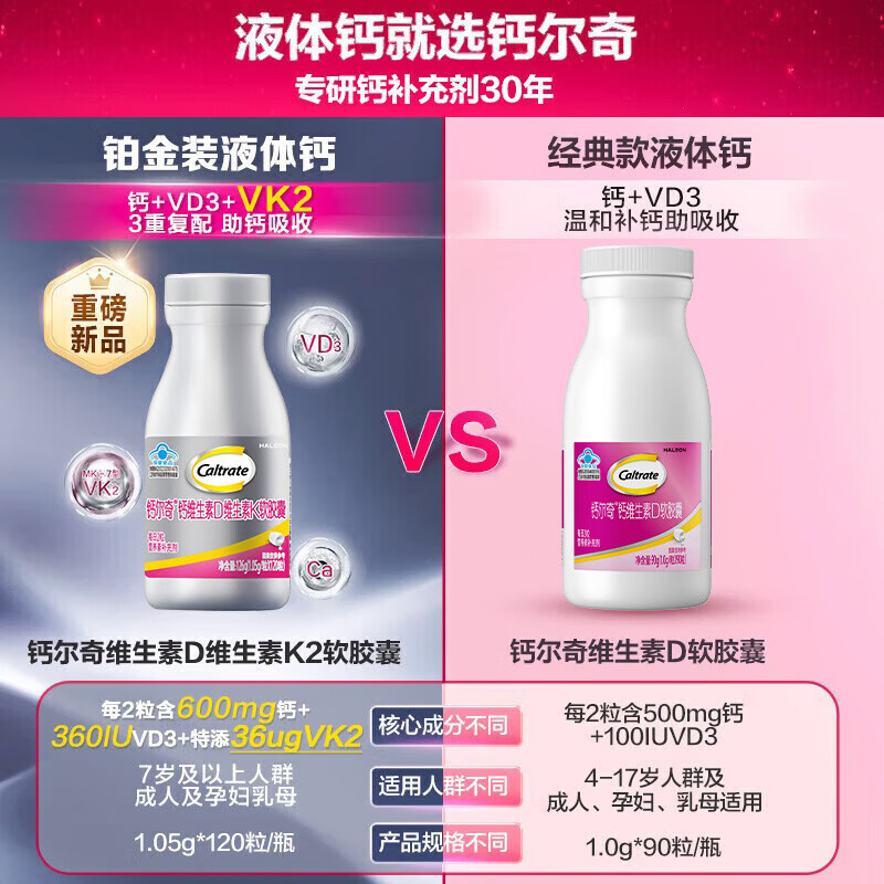 钙尔奇铂金液体钙120粒*3 男女士中老年钙片 补钙维生素D维生素k2