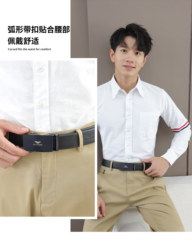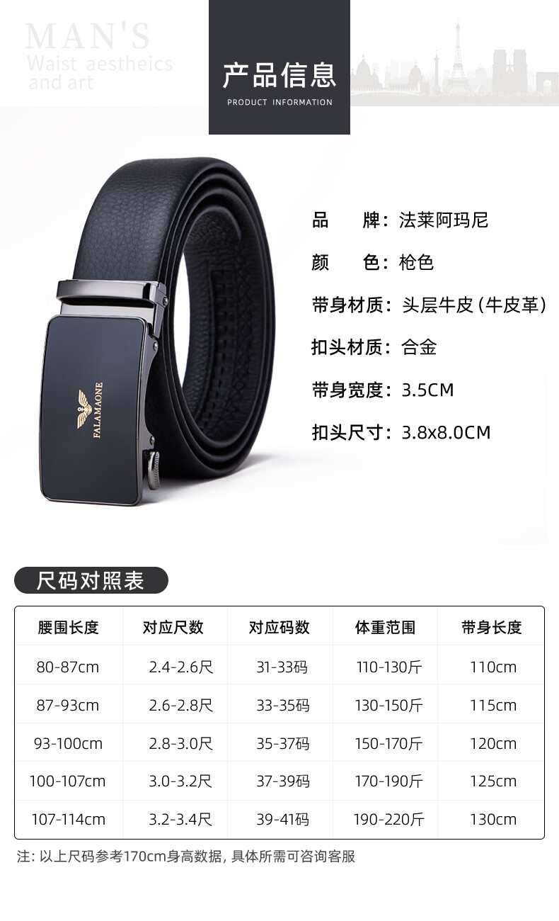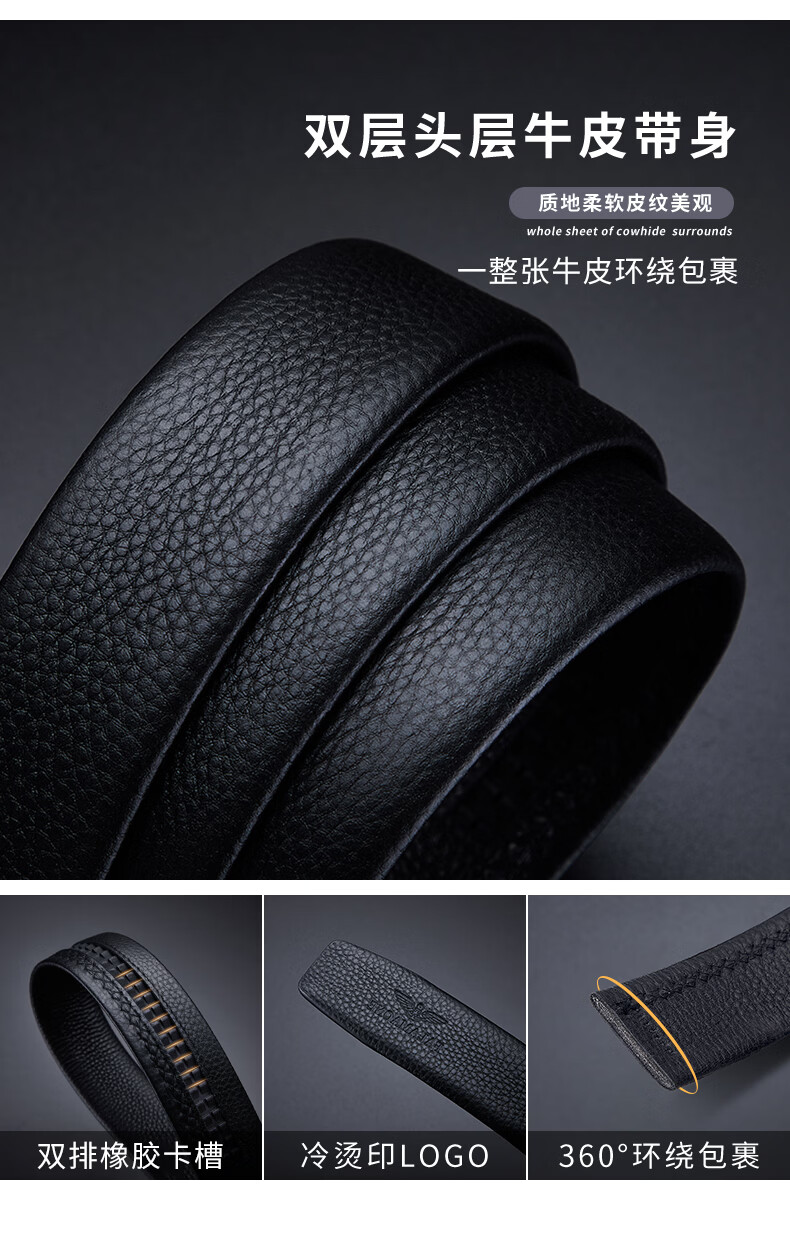 花花公子皮带男真皮不带头自动扣带条 头层牛皮无头带身 头层牛皮黑色带身 3.5CM