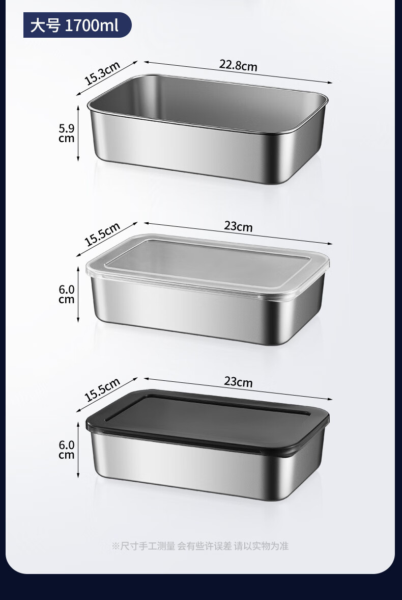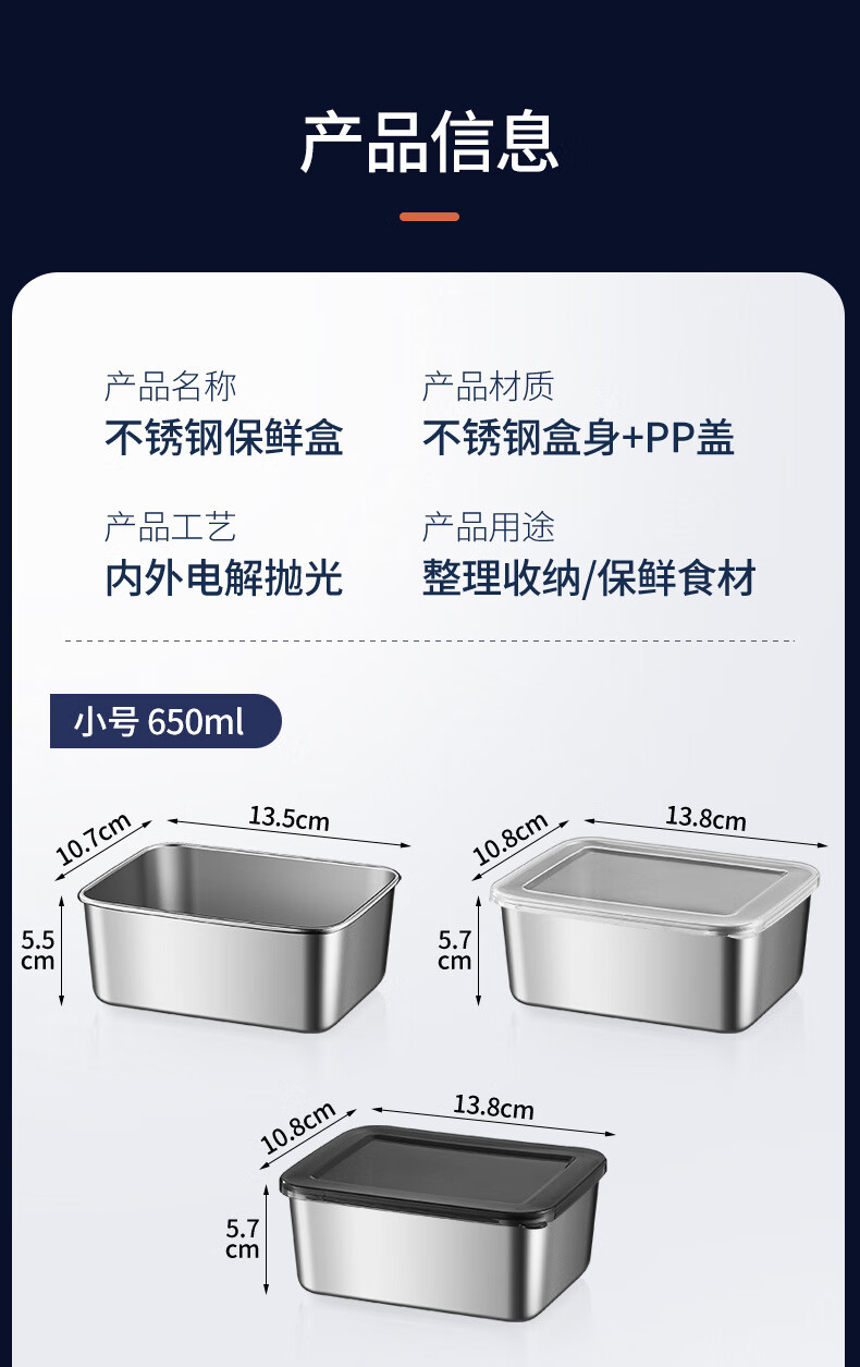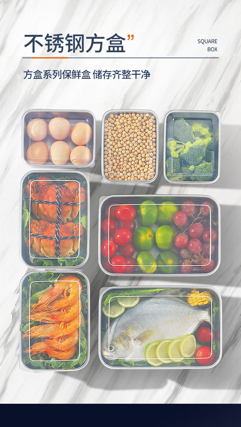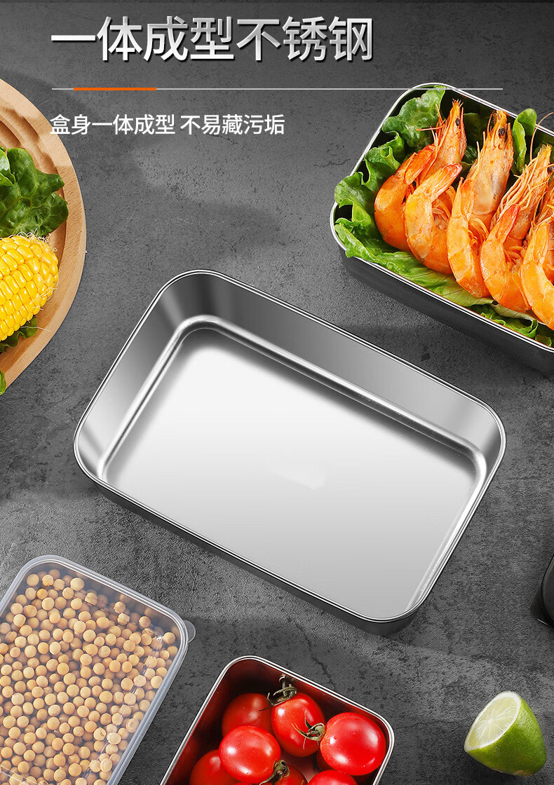 【工厂直发】不锈钢长方形保鲜盒带盖密封午餐备菜盘食品冰箱收纳 方型304小号盒【带盖】 银色