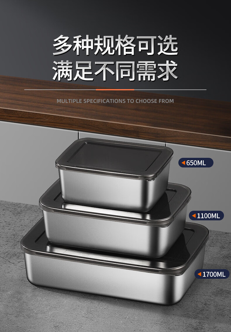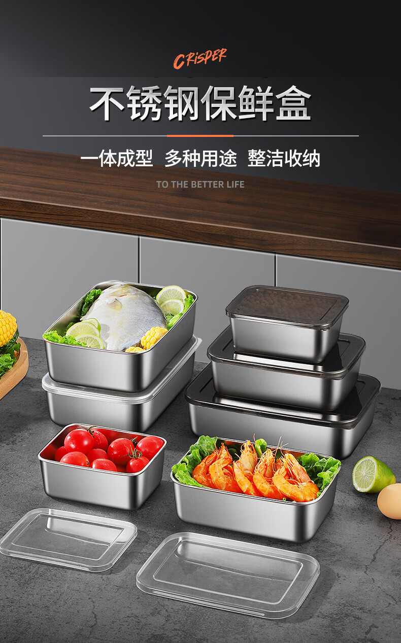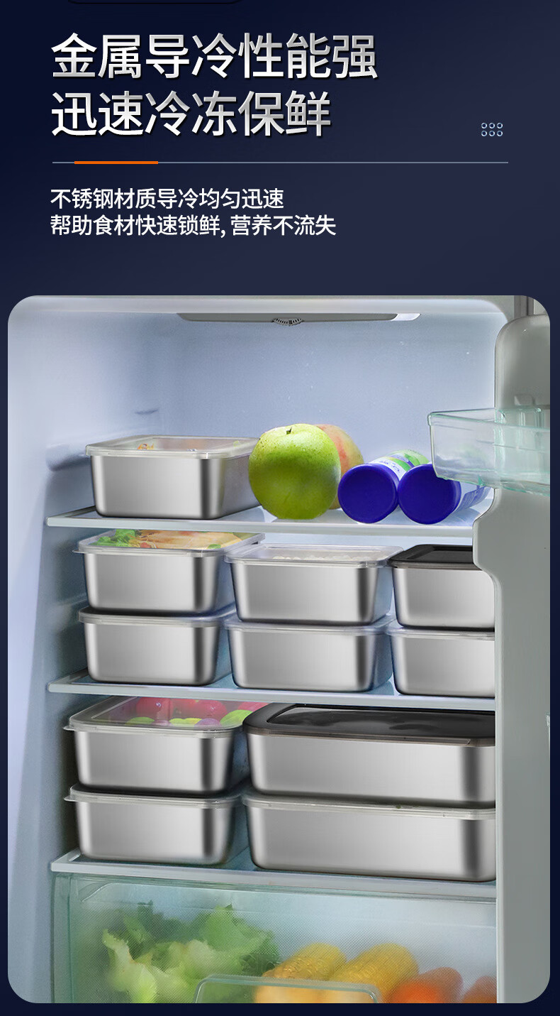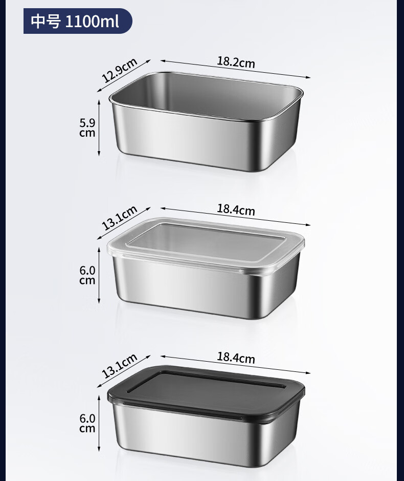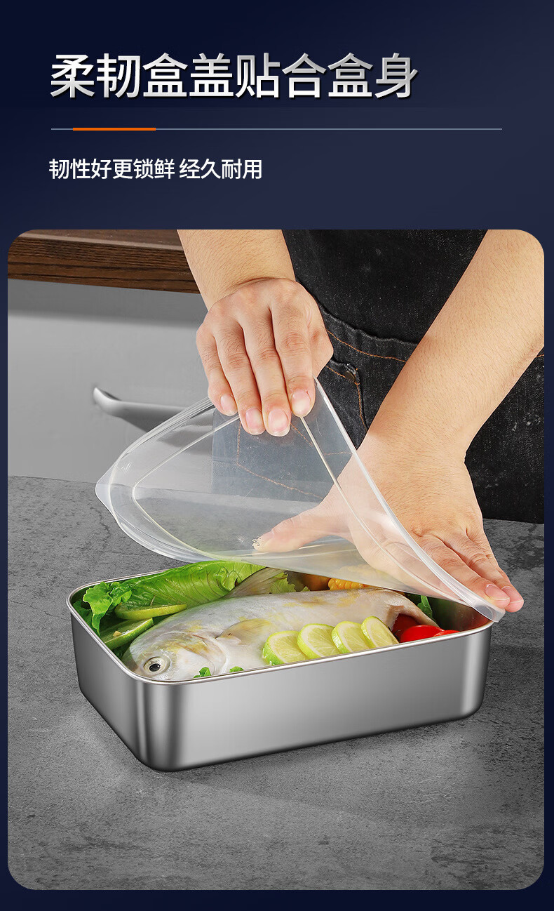 【工厂直发】不锈钢长方形保鲜盒带盖密封午餐备菜盘食品冰箱收纳 方型304小号盒【带盖】 银色