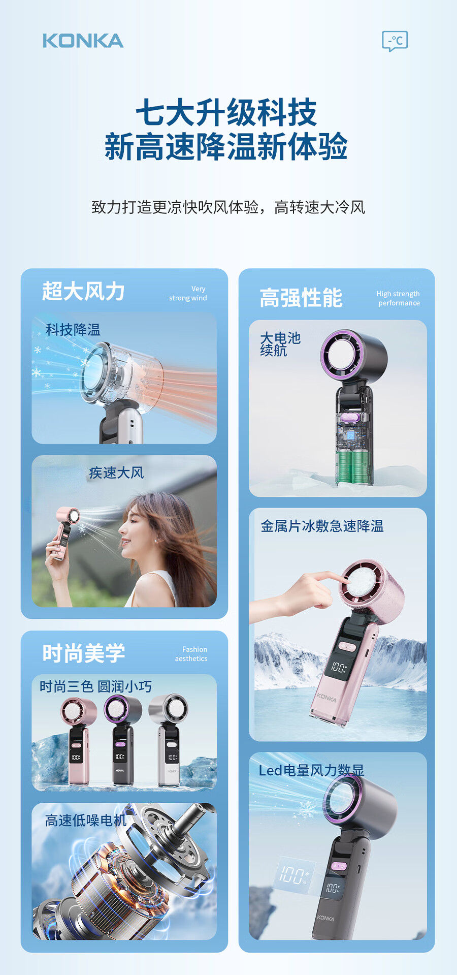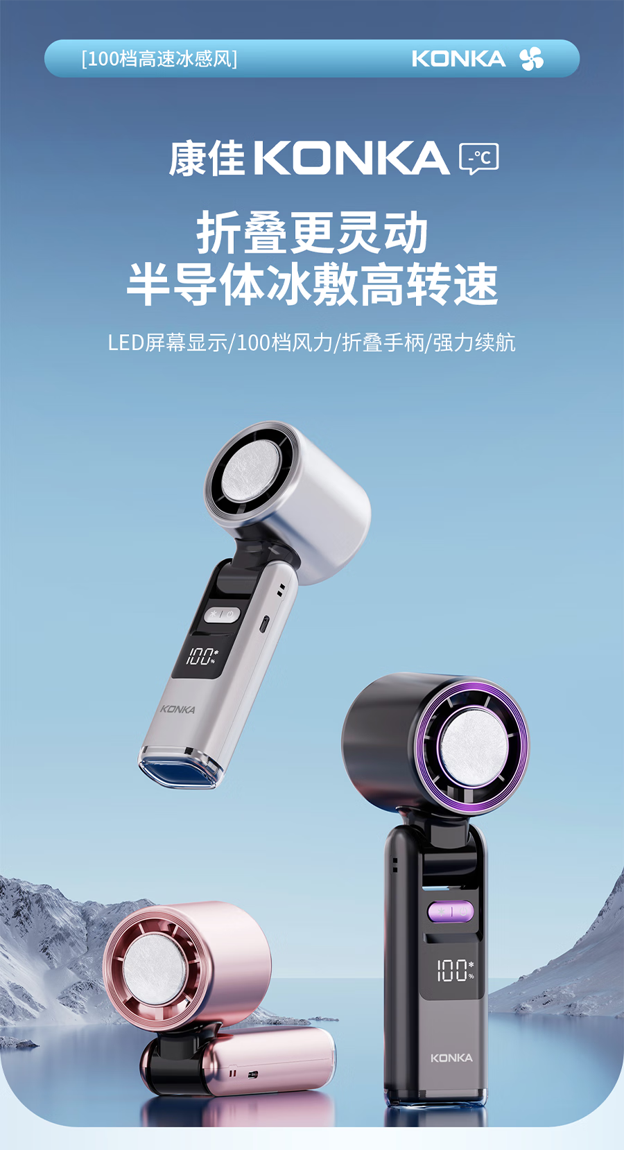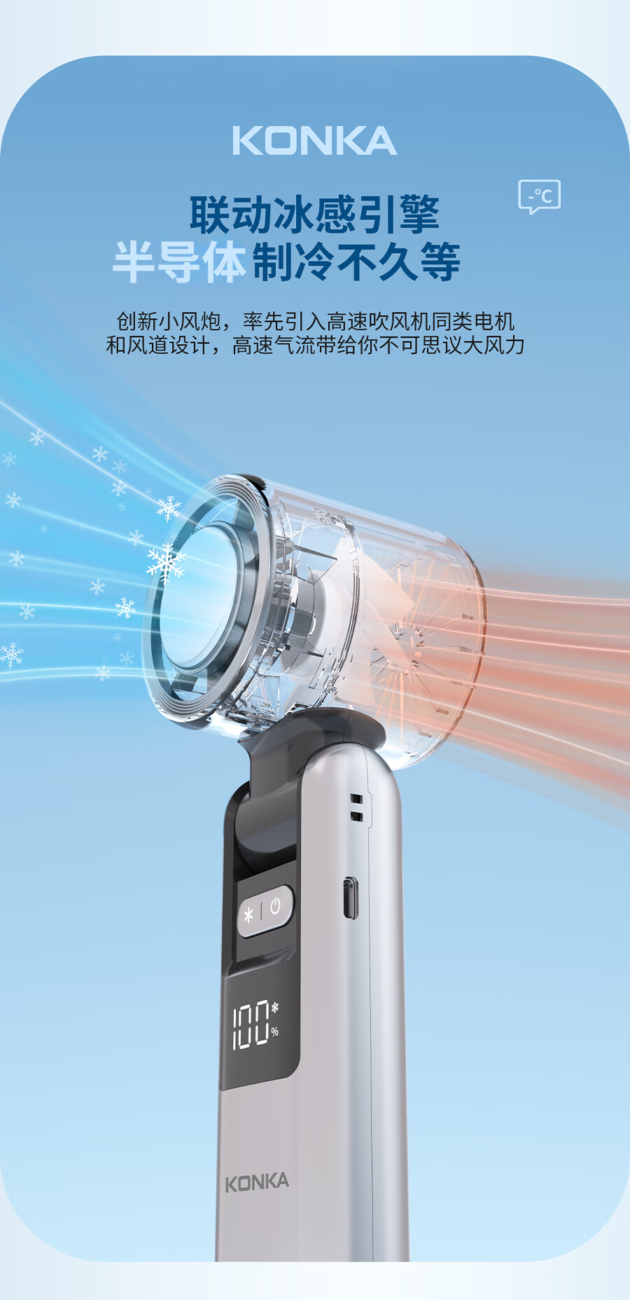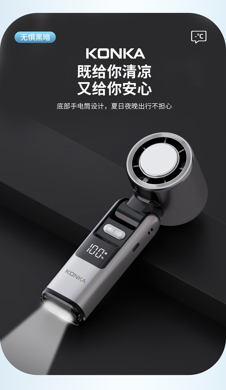 康佳手持小风扇USB充电式便携户外半导体制冷可折叠桌面户外100档高速大风力强劲降温神器 白色 高速100档+制冷+底部LED照明+可折叠+挂绳
