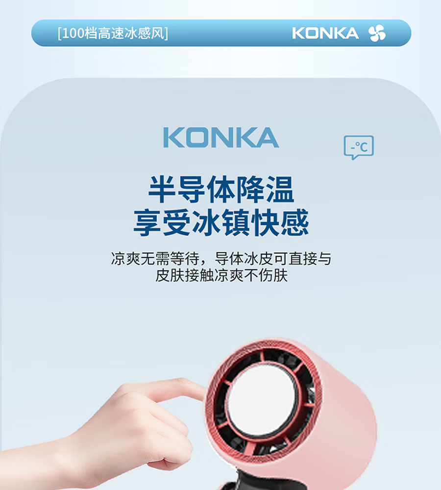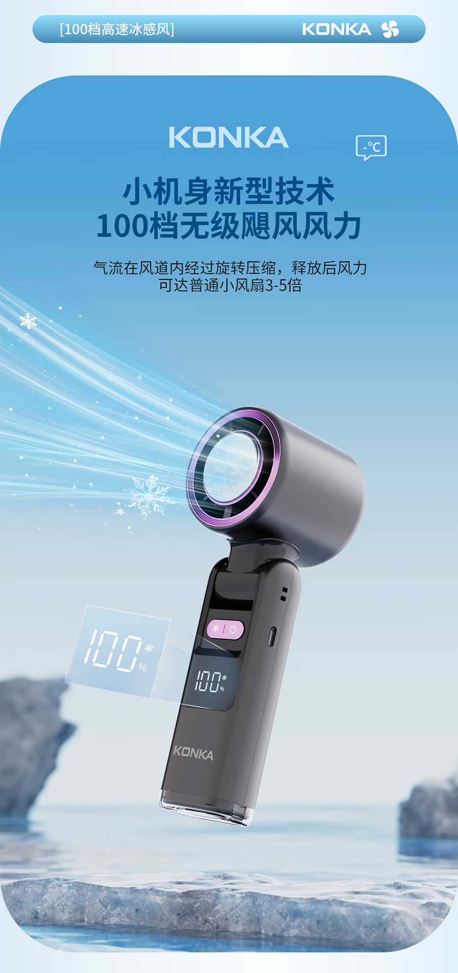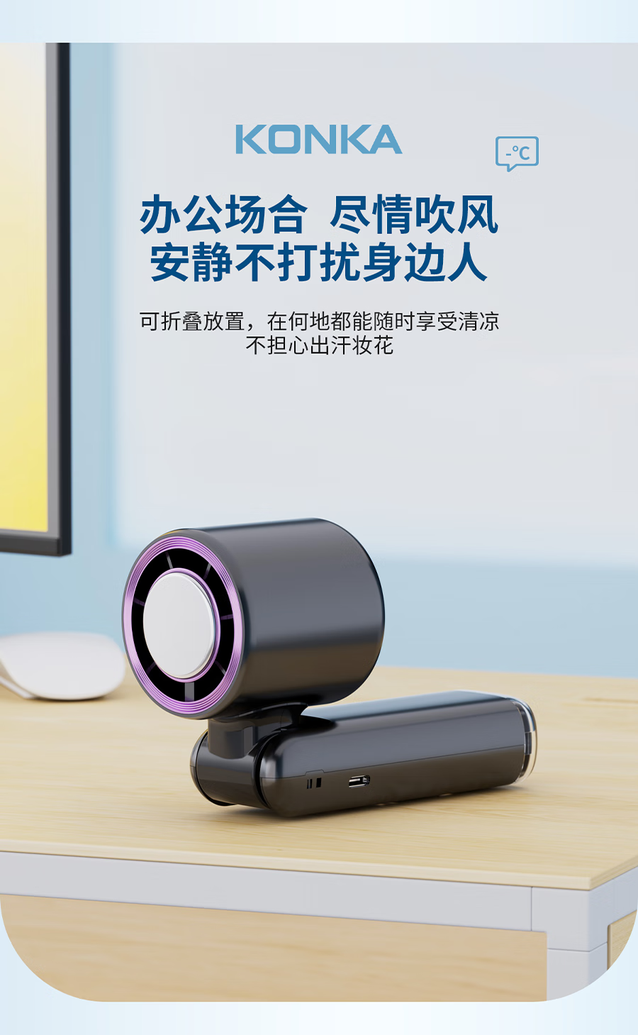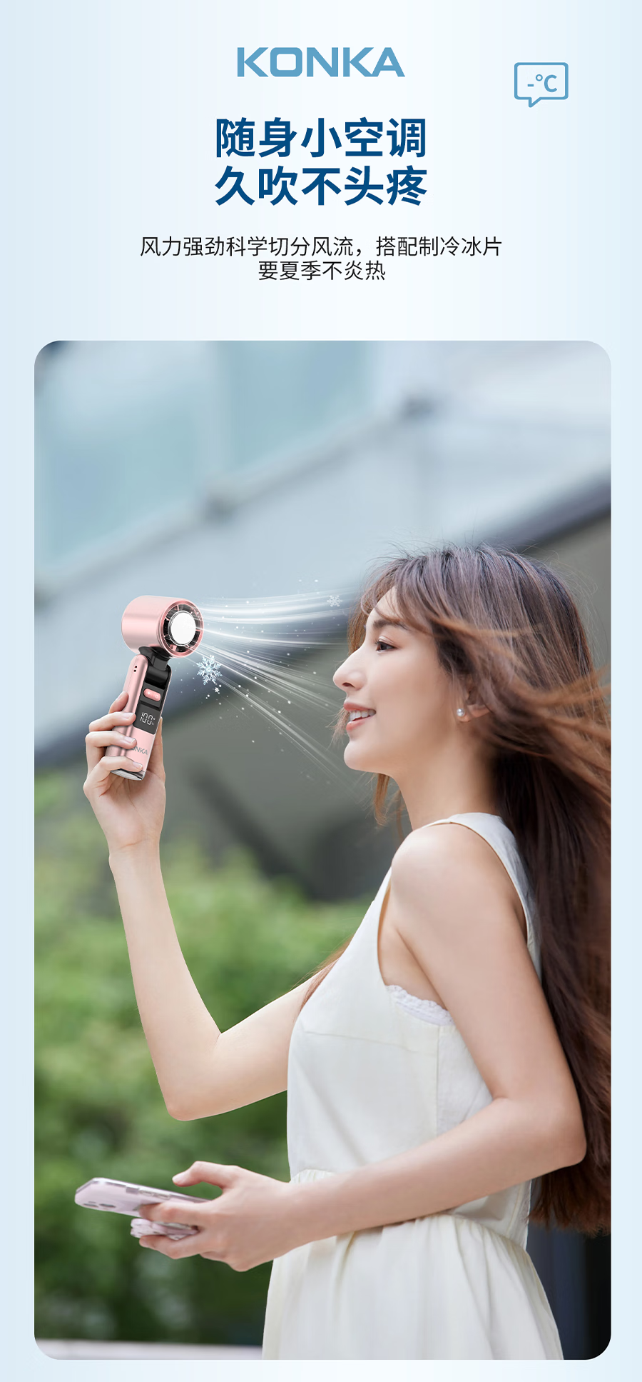 康佳手持小风扇USB充电式便携户外半导体制冷可折叠桌面户外100档高速大风力强劲降温神器 白色 高速100档+制冷+底部LED照明+可折叠+挂绳