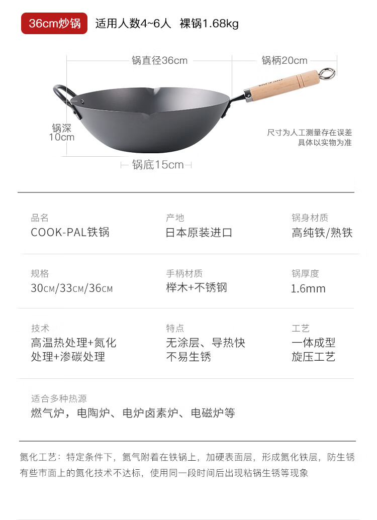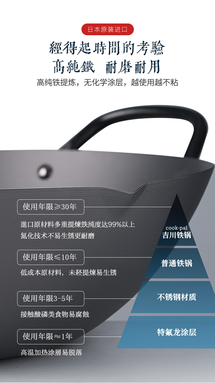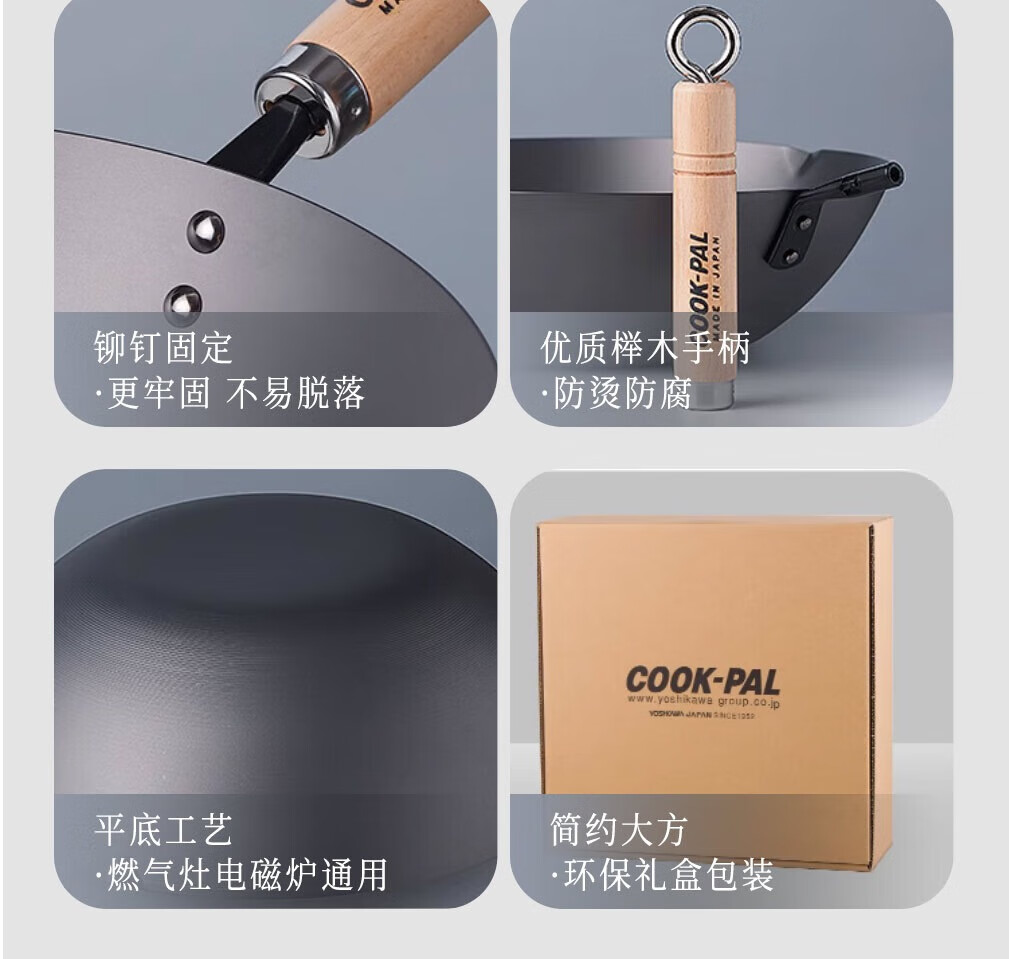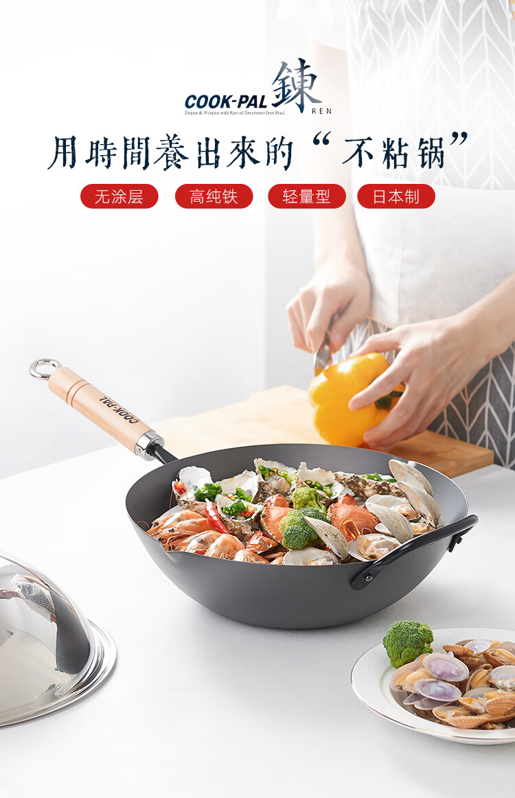 COOK-PAL吉川日本原装进口炒锅铁锅无涂层不粘锅熟铁氮化锅家用炒菜锅 锅+原装盖+原装铲+20cm雪平锅(关注店铺赠木筷) 36cm