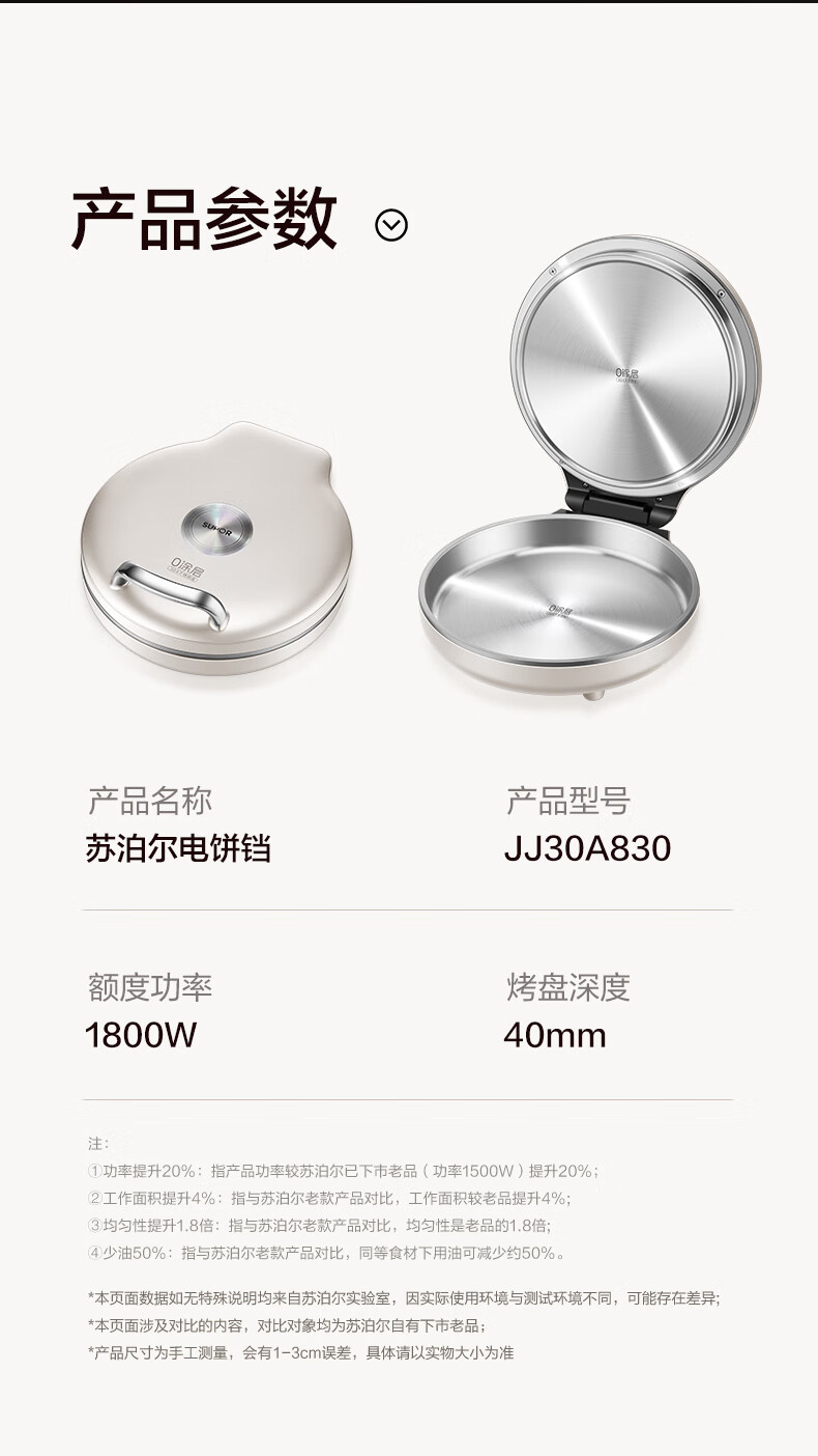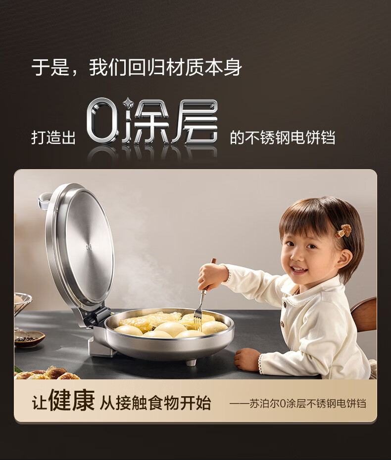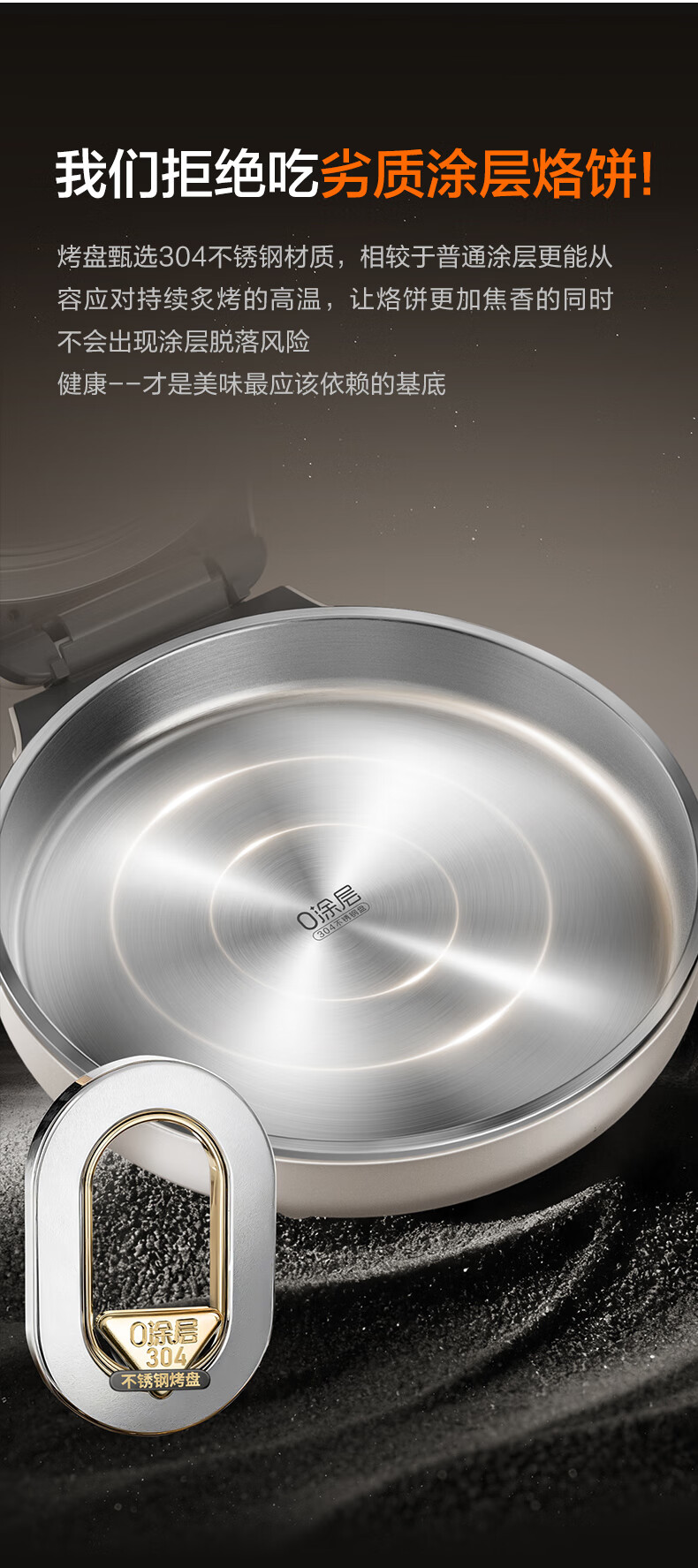 苏泊尔(SUPOR)电饼铛 0涂层304不锈钢 电饼档家用 煎饼锅烤肉锅 烙饼锅早餐机煎烤机 40mm加深 JJ30A830