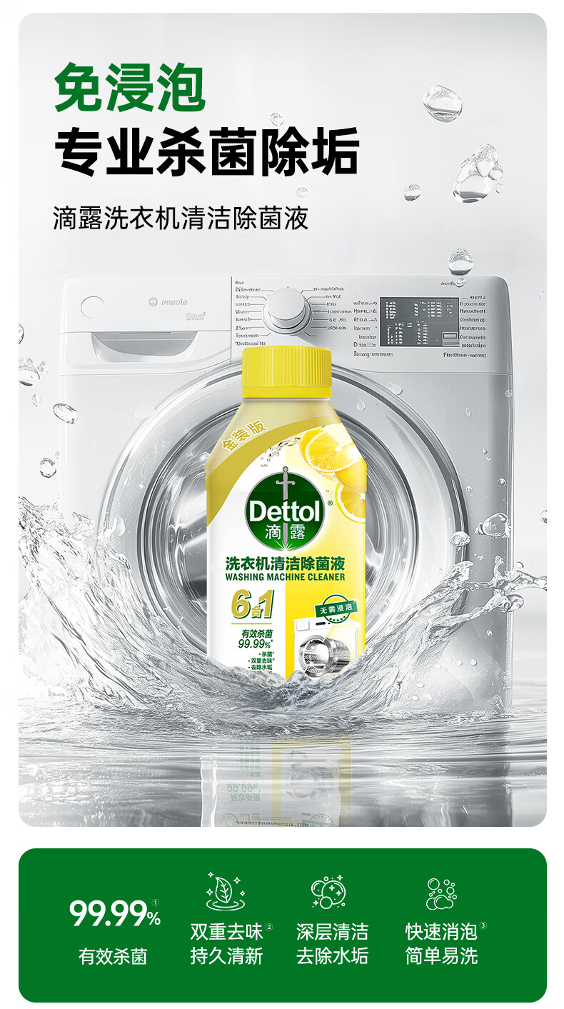 滴露(Dettol)洗衣机清洗剂滚筒波轮洗衣机消毒杀菌清洁剂250ml金装版柠檬