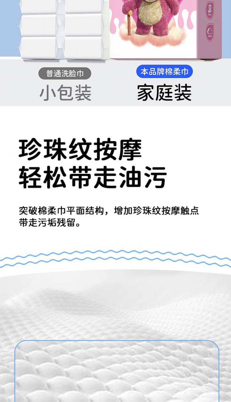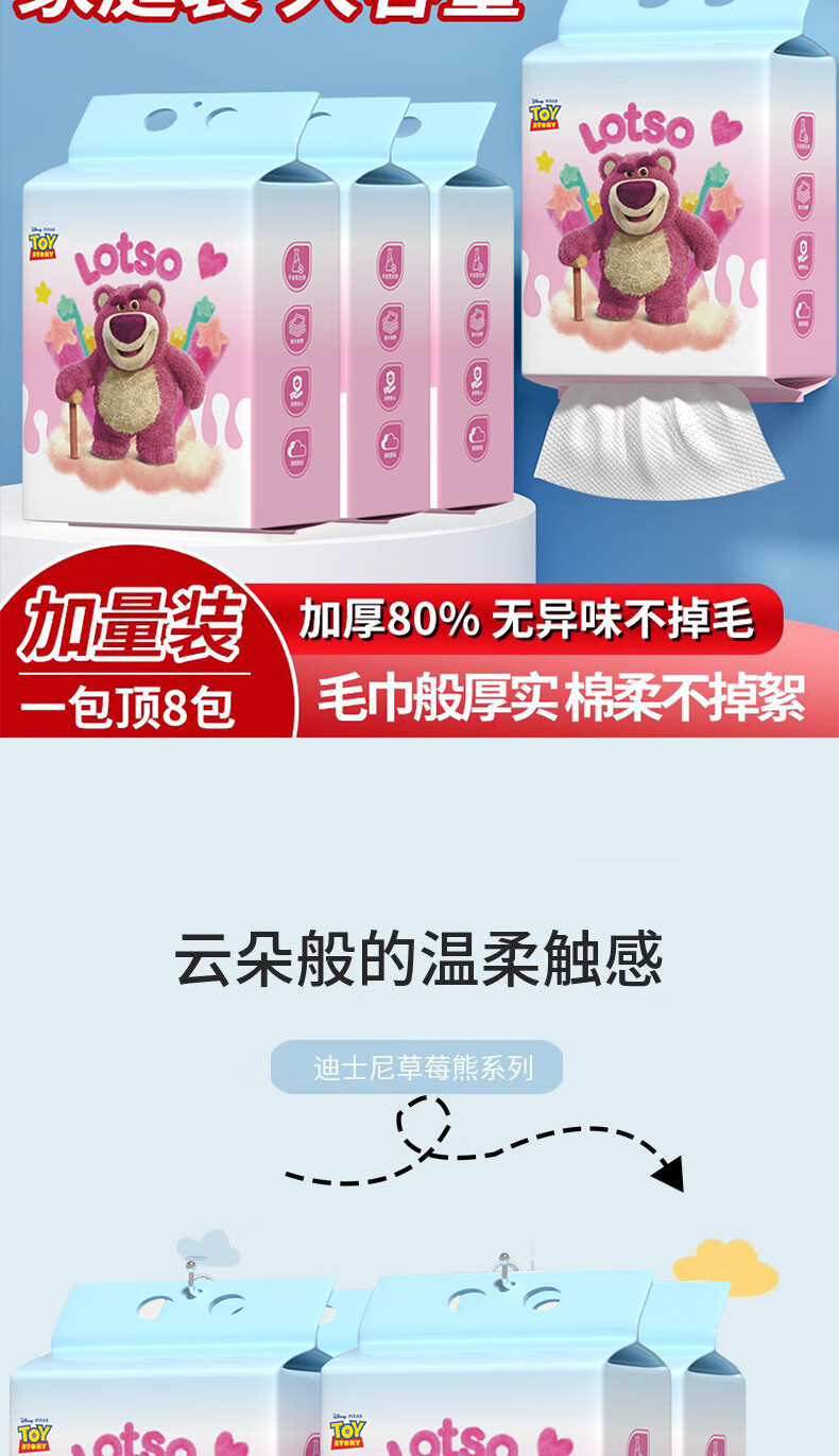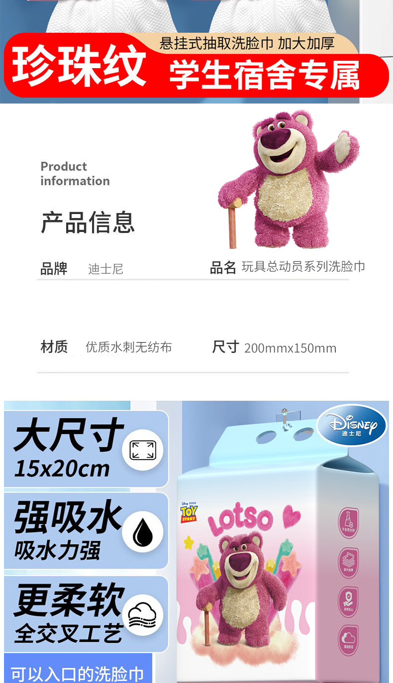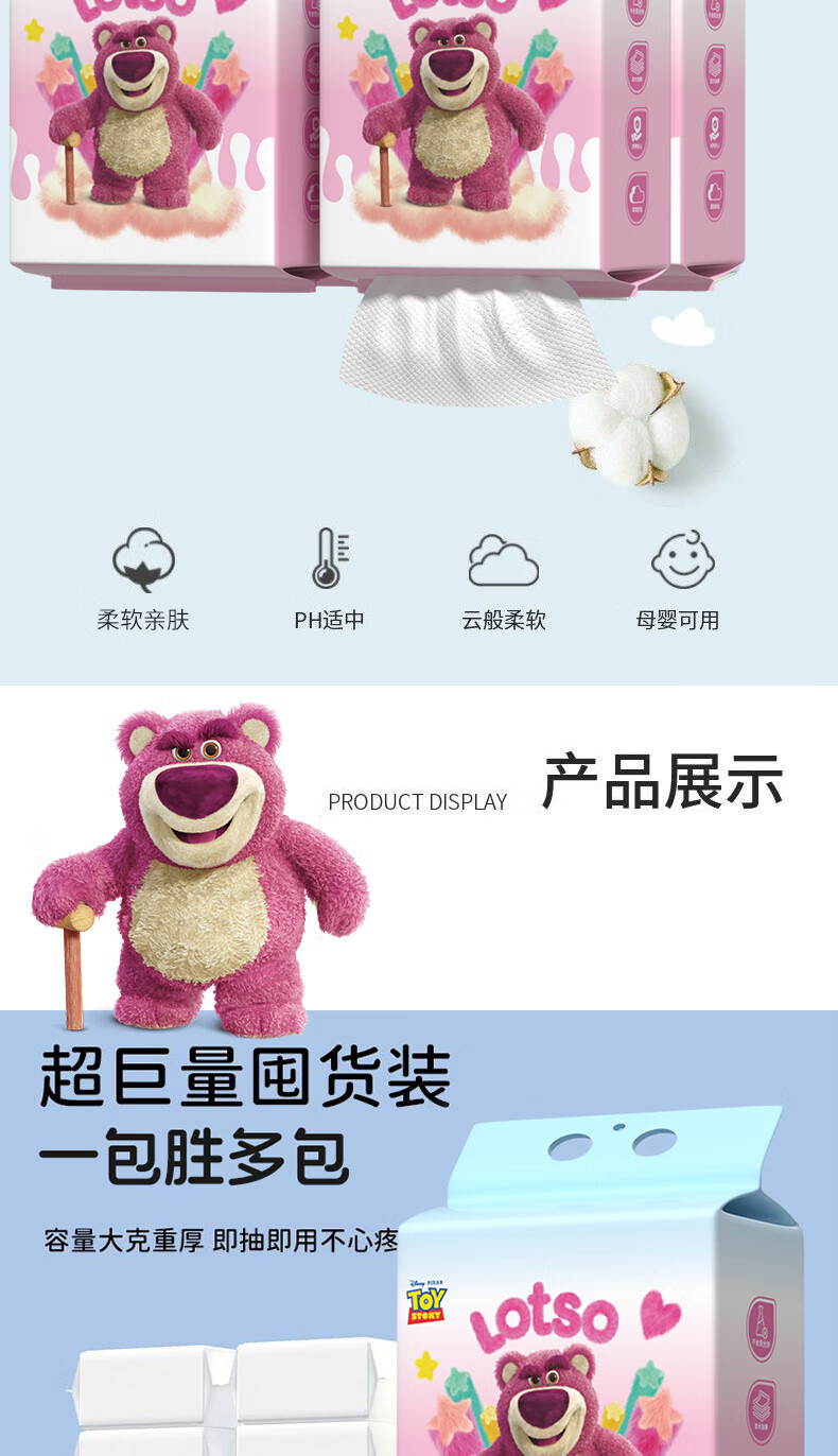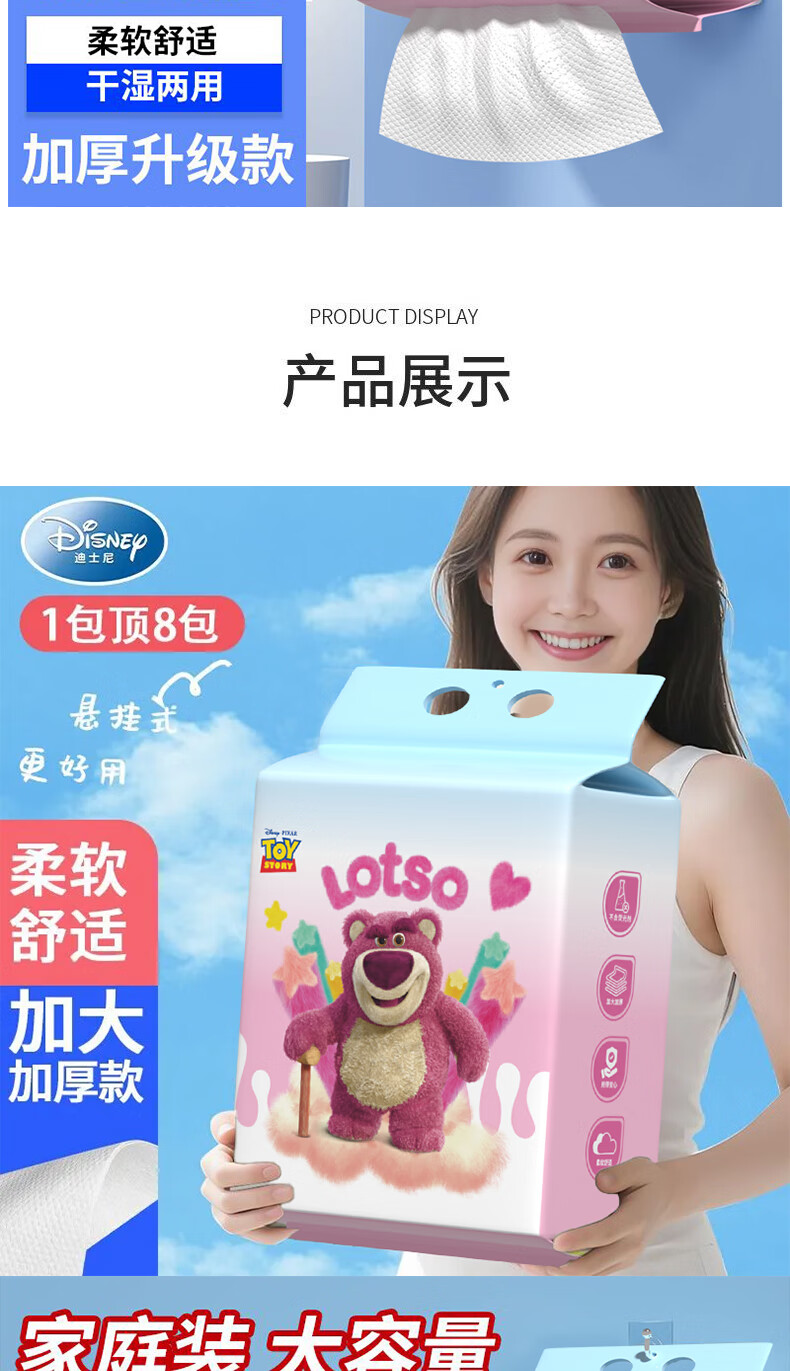 迪士尼草莓熊悬挂式洗脸巾加大加厚干湿两用棉柔巾100抽/提 厚款 1提 100抽