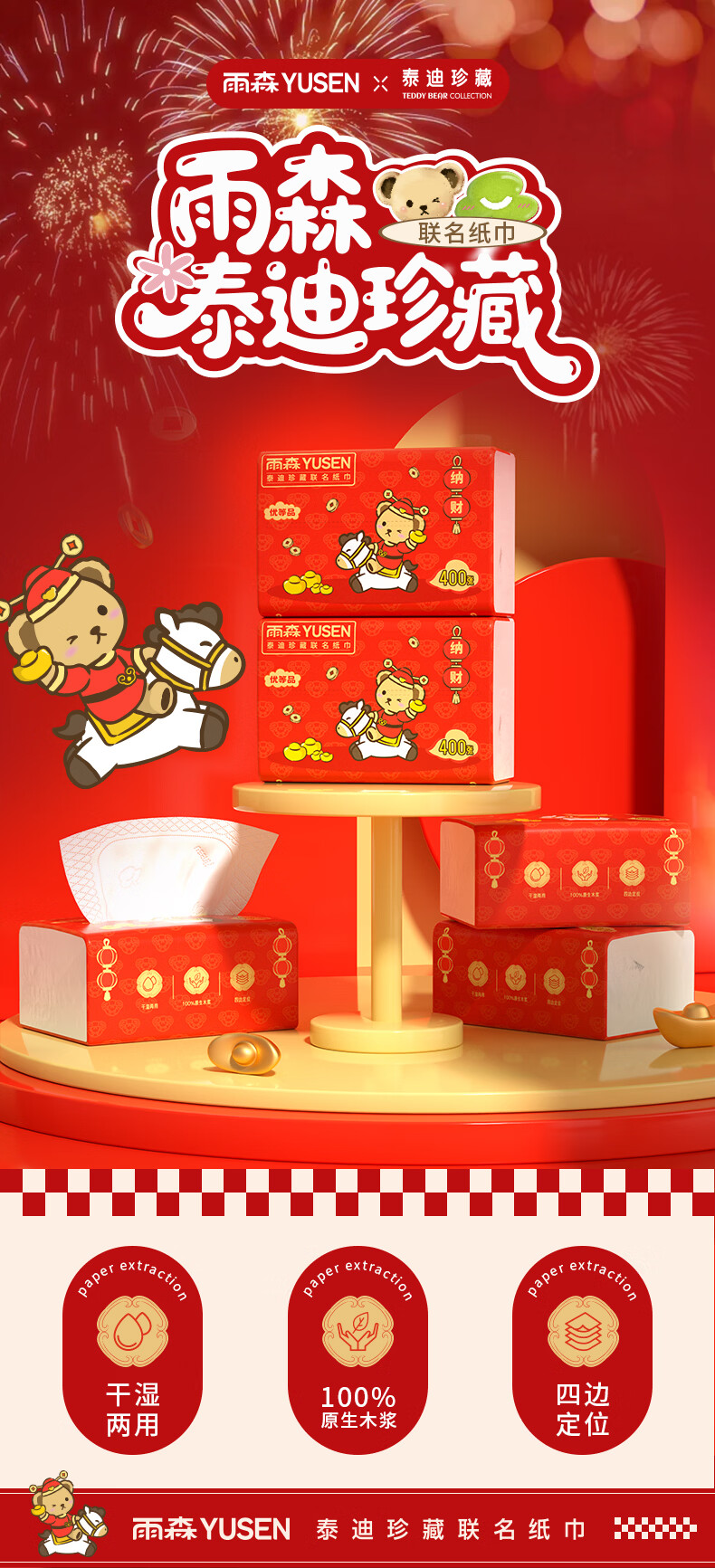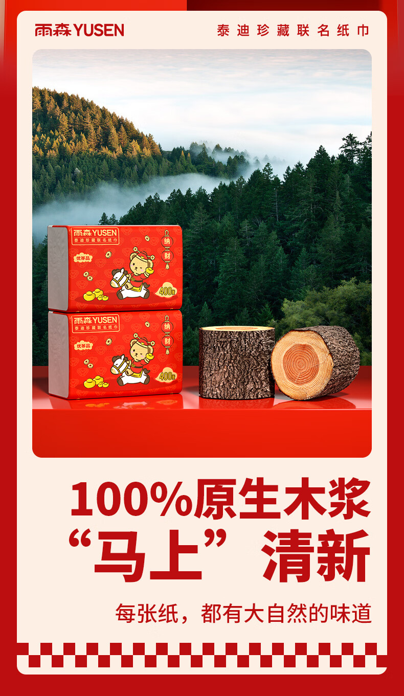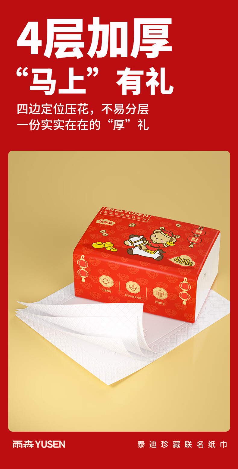 雨森泰迪联名珍藏抽纸400张100%原生木浆纸巾家用纸抽4层加厚餐纸 4层 100抽*12包