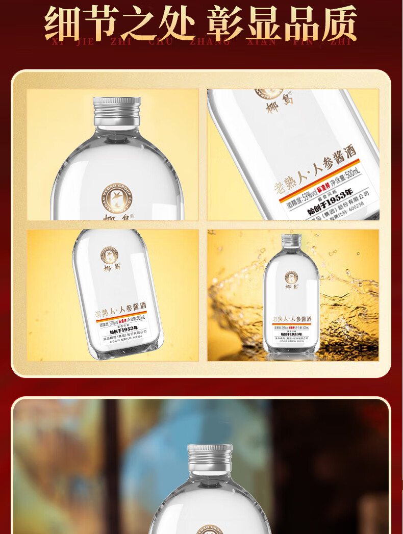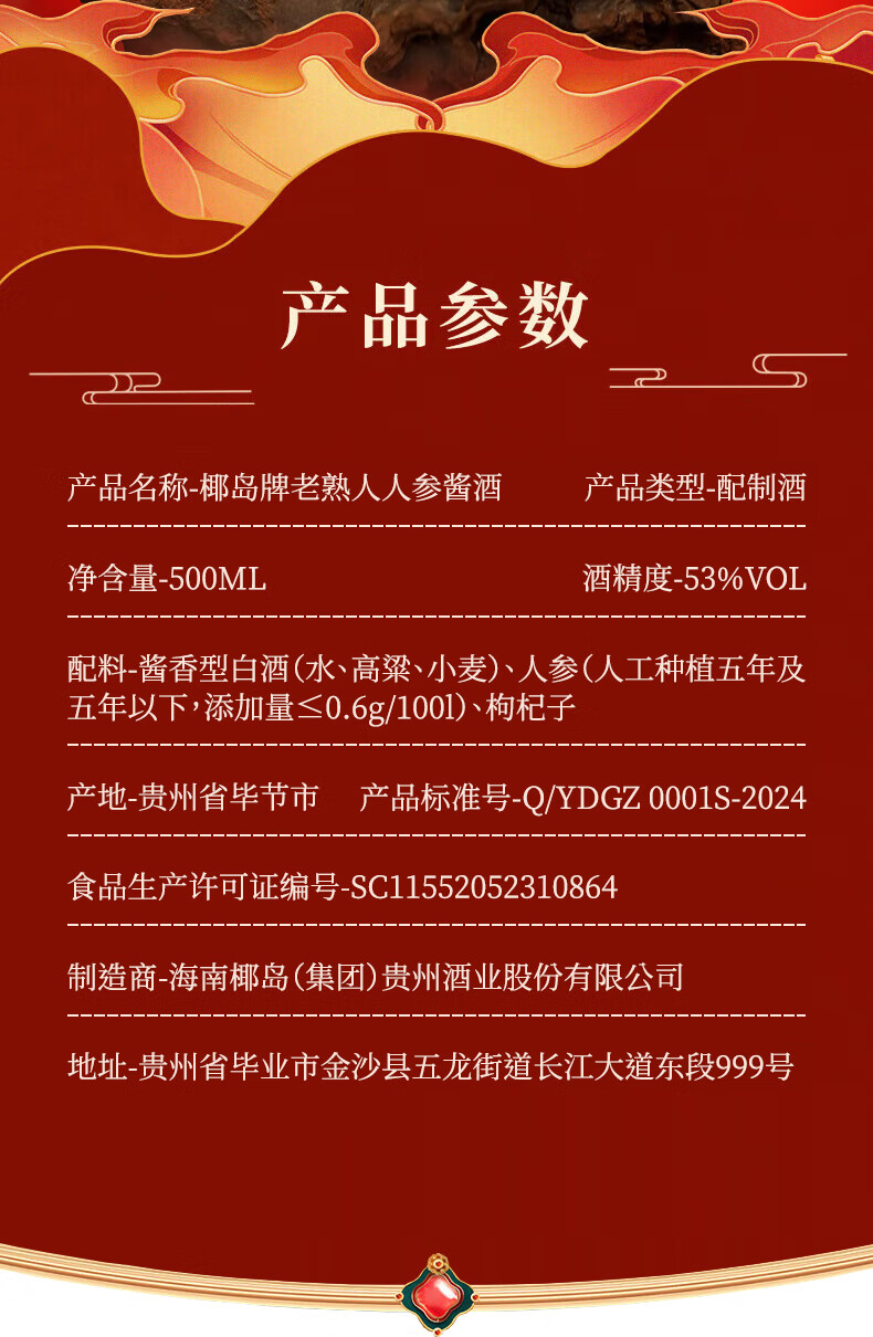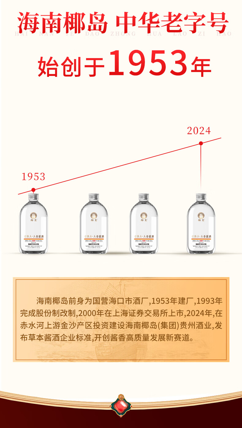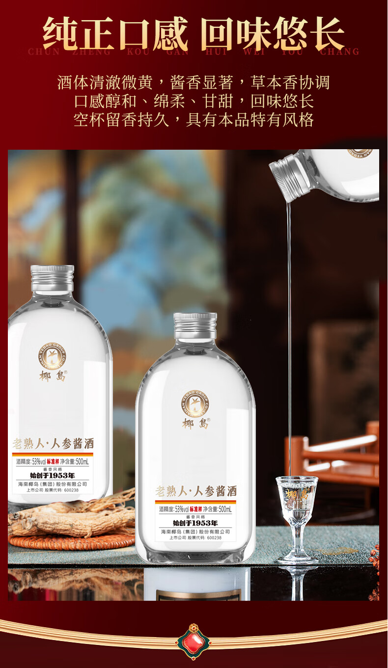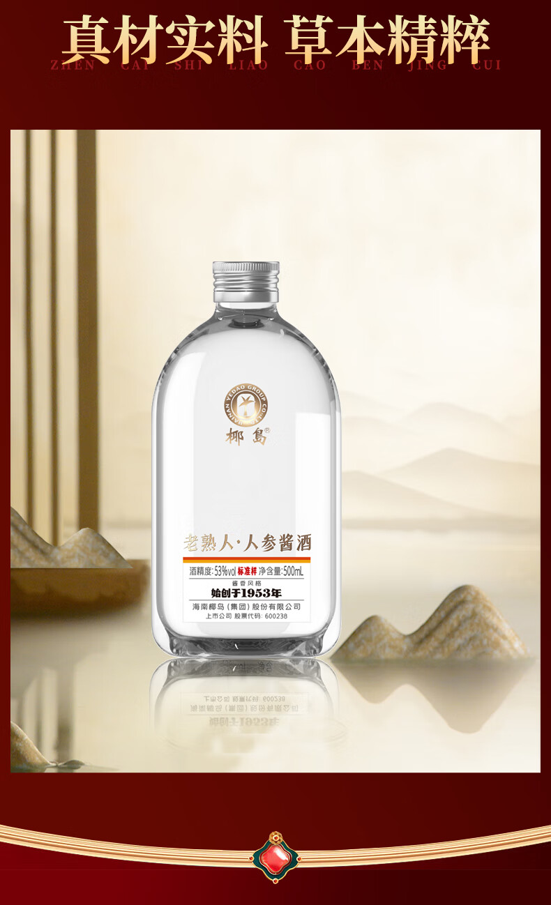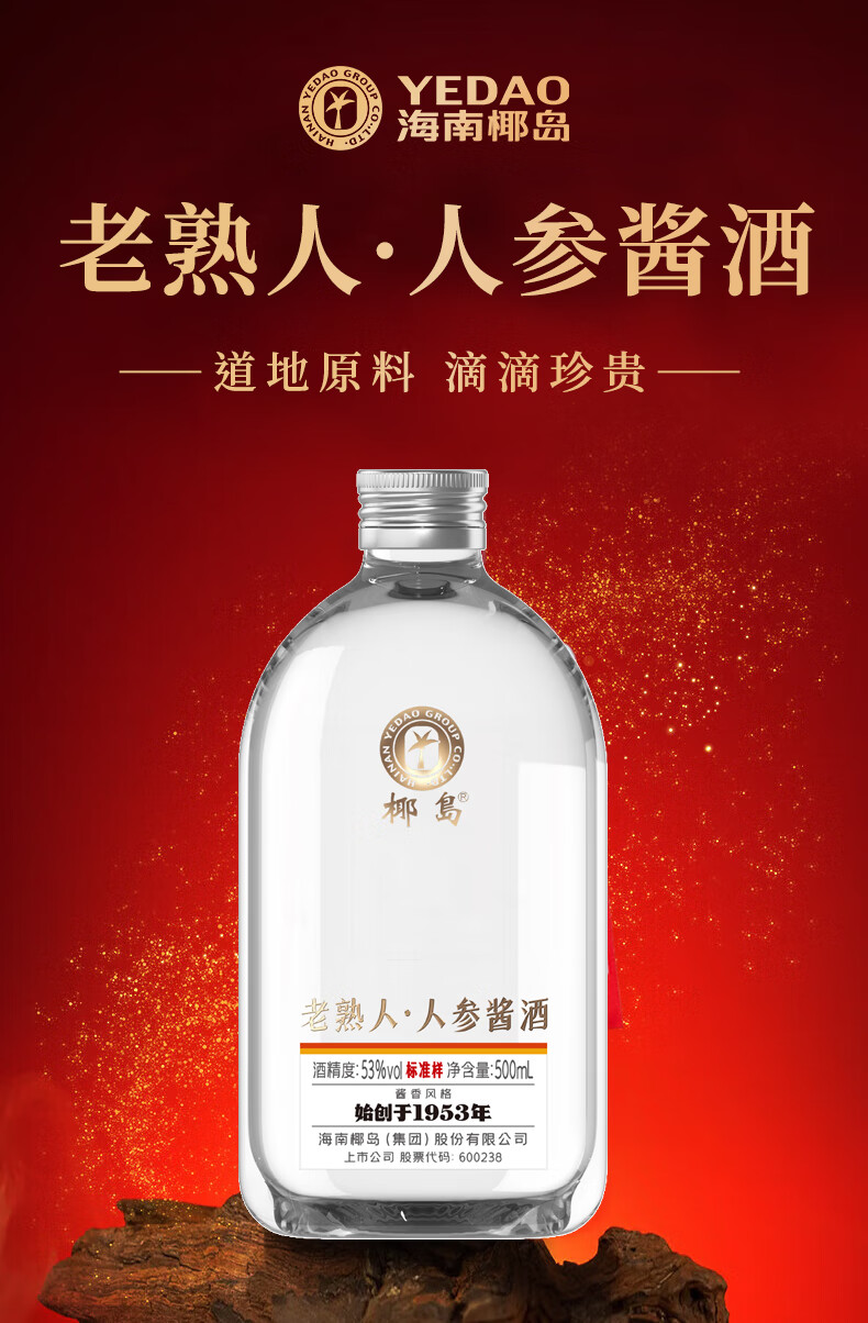 椰岛(YEDAO)老熟人人参酱酒 贵州酱香型白酒基酒 粮食酿造养生酒光瓶口粮酒 53度 500mL 1瓶 单瓶装