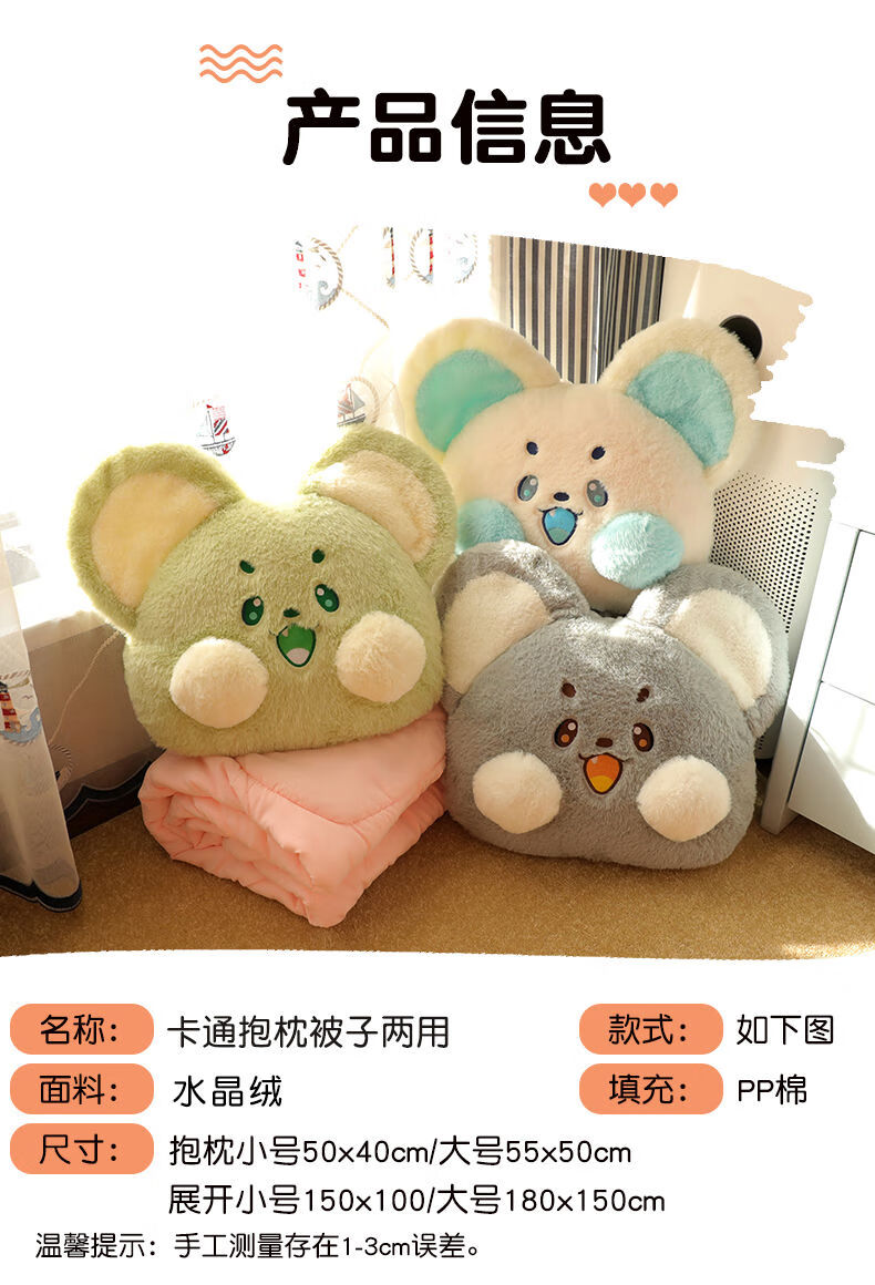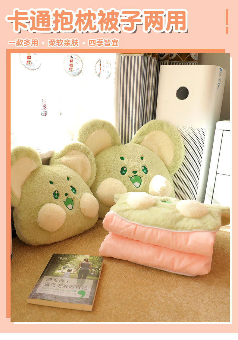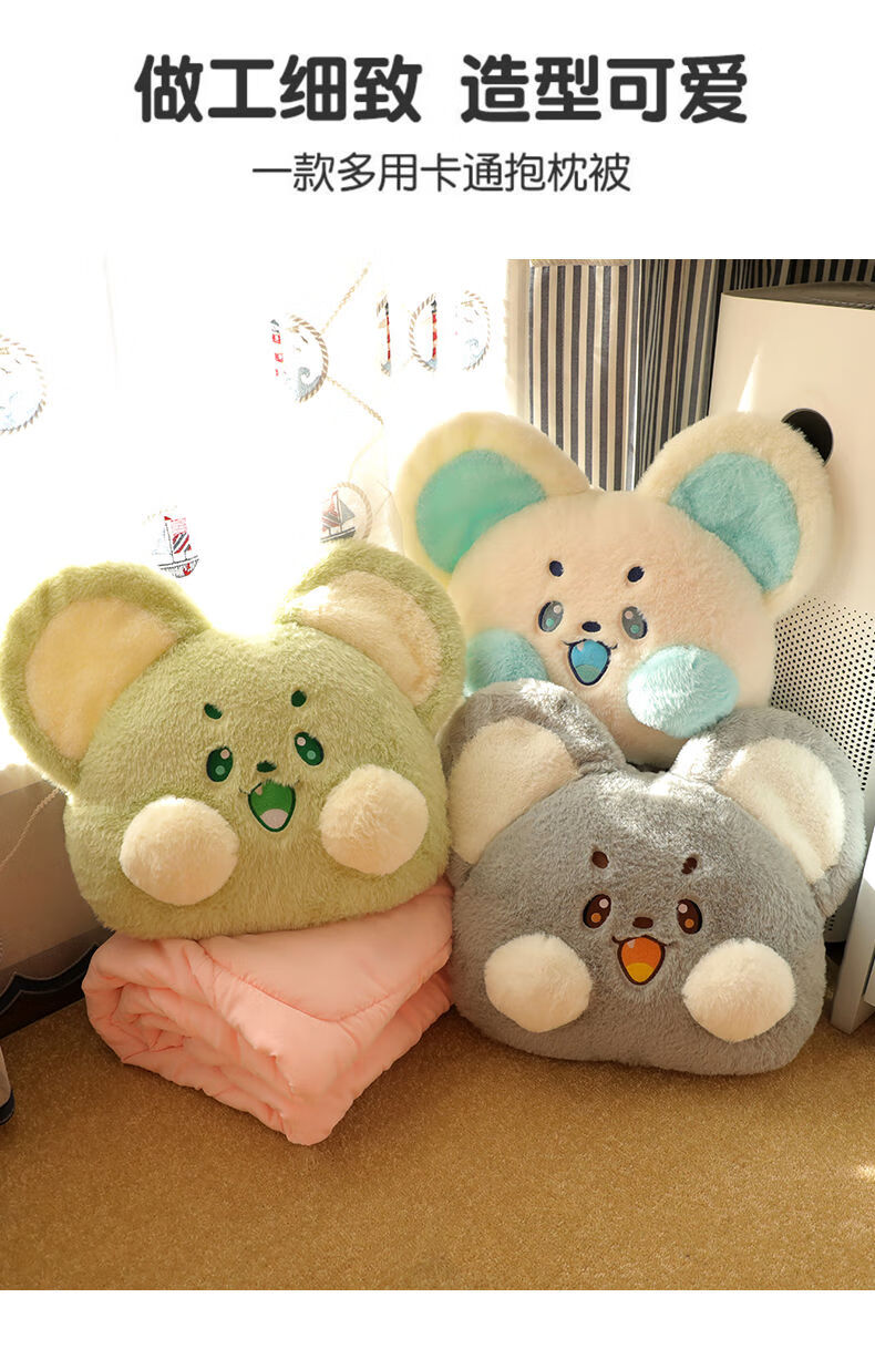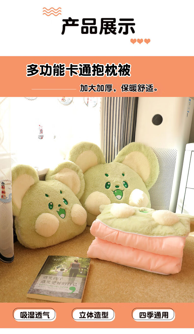 山头林村冬季加厚抱枕被子两用二合一折叠汽车载枕头被办公室午睡毯子靠枕 抹茶-萌鼠 大号抱枕55*45cm展开被子1点5*1点8米
