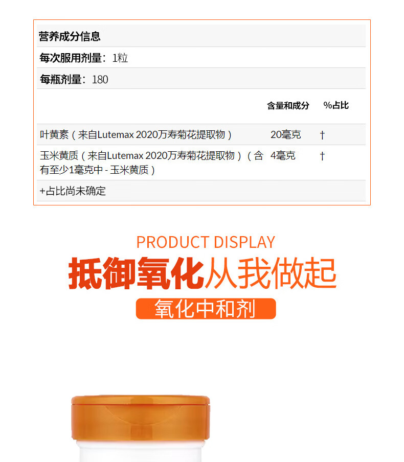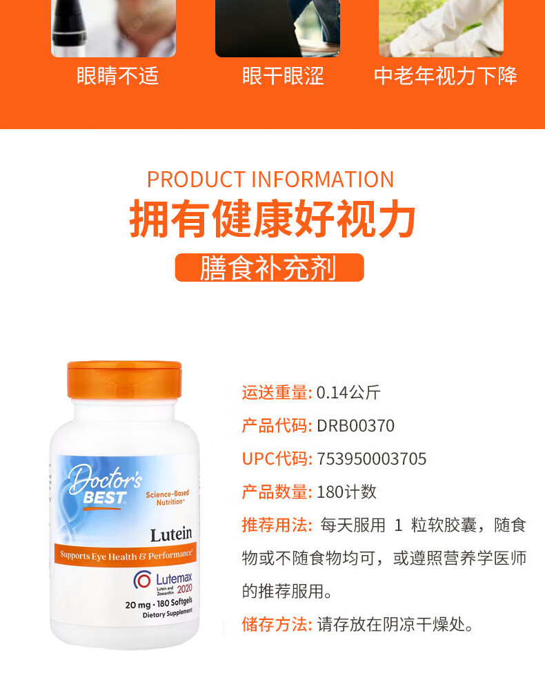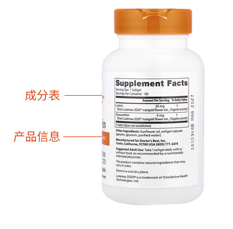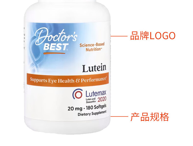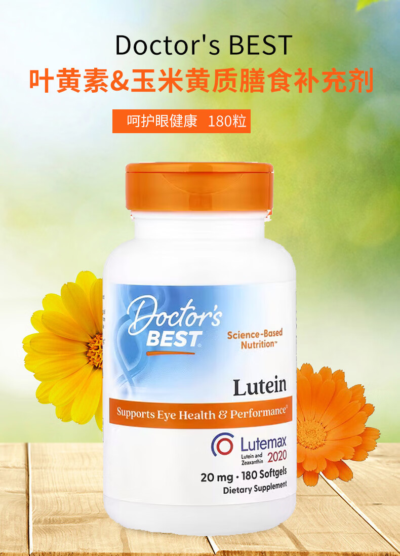 Doctor's best叶黄素软凝胶 保护视力缓解干涩配方健康 20毫克 180粒*1瓶