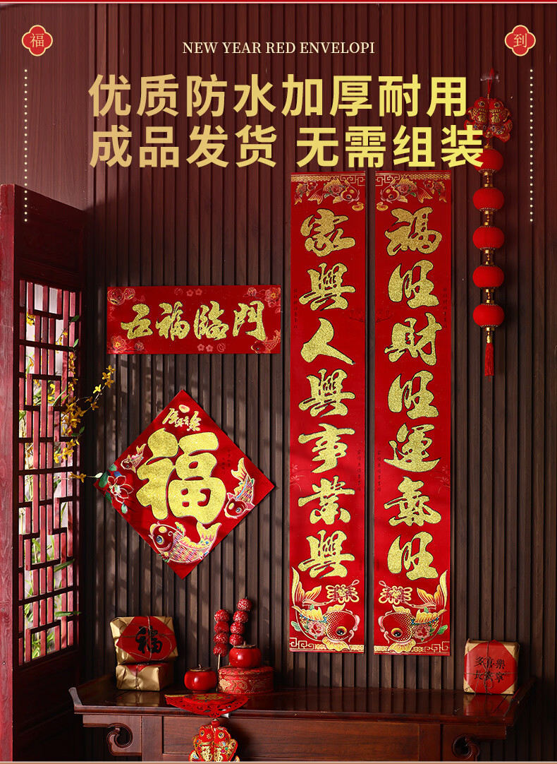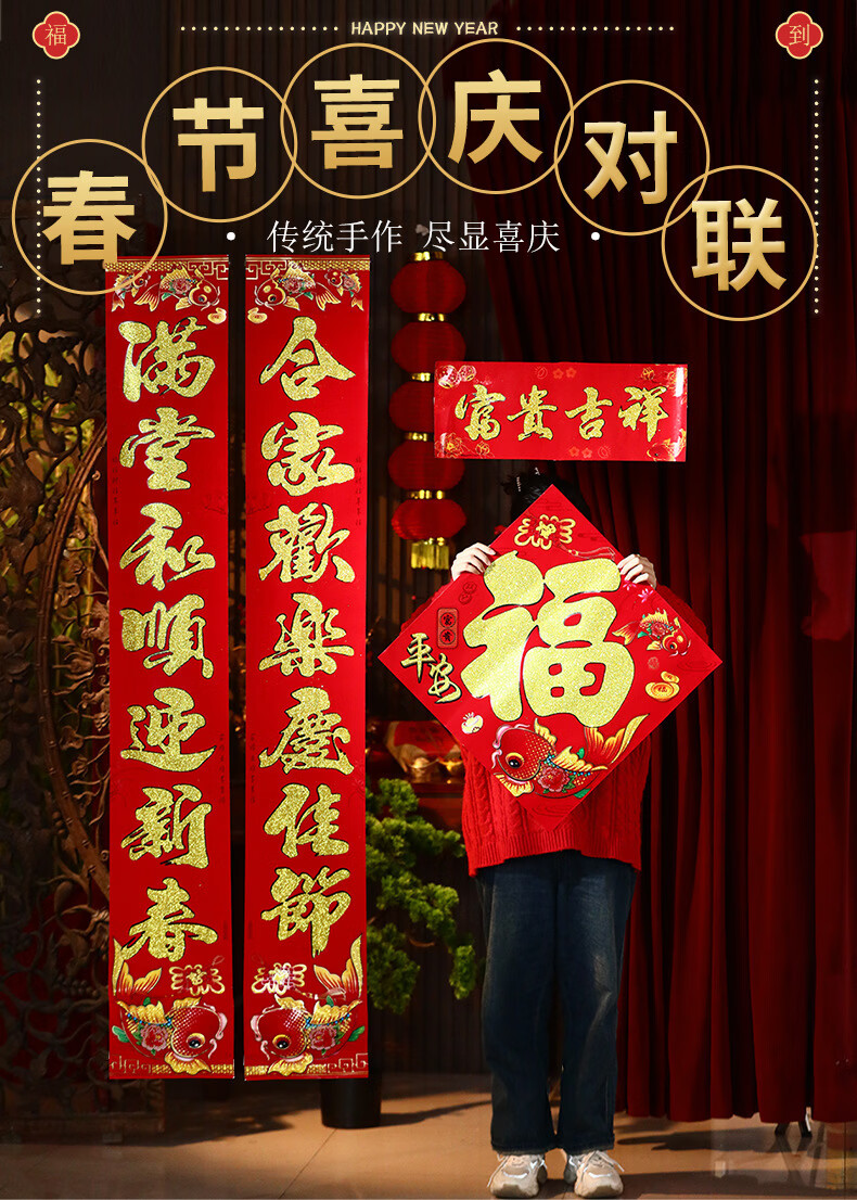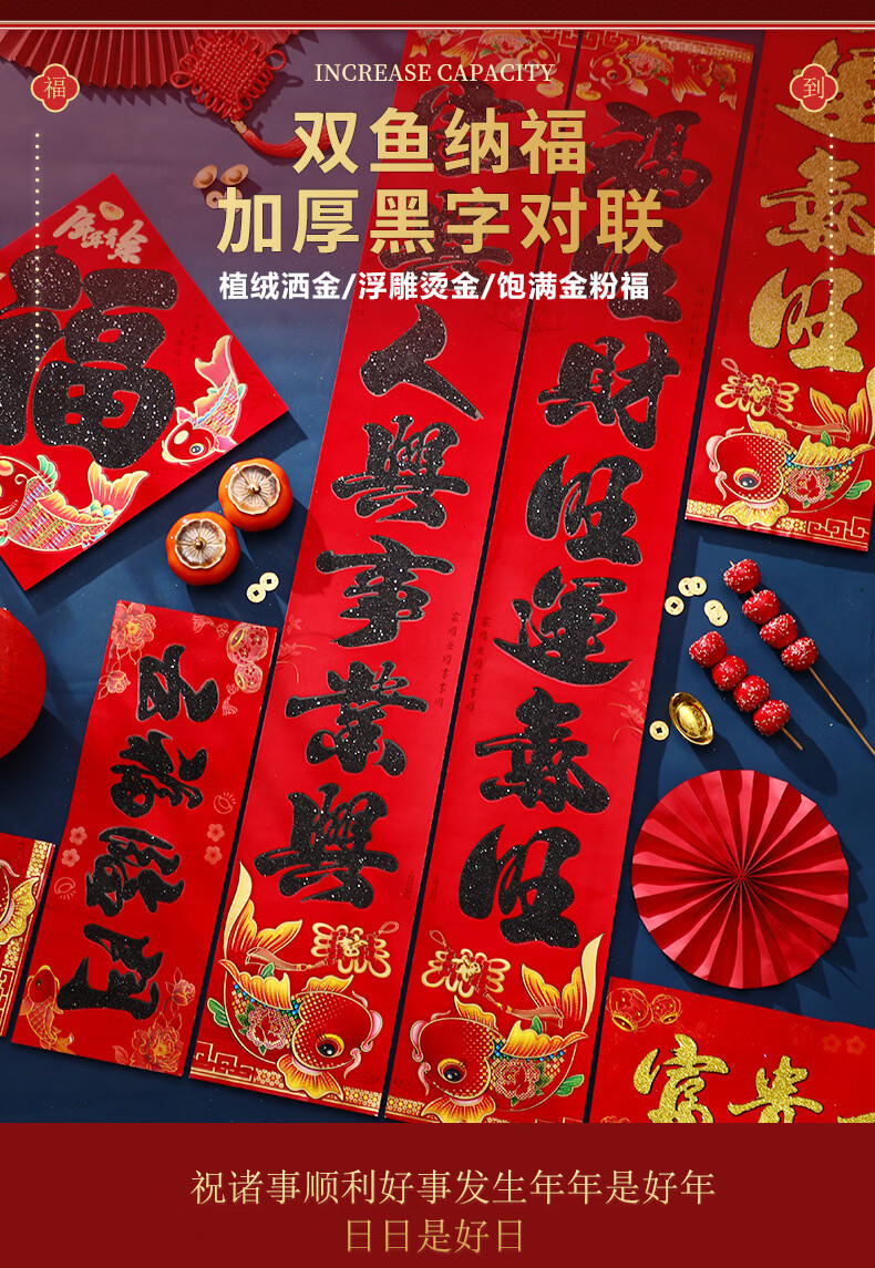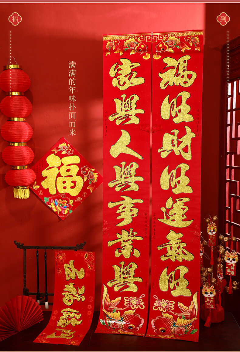 恬舒植绒对联撒粉福字2026马年春节福字农村门贴新年大门春节福字装饰 植绒对联-金字【送同款植绒福字两张】 8米-新春如意接鸿福,佳节平安添福贵
