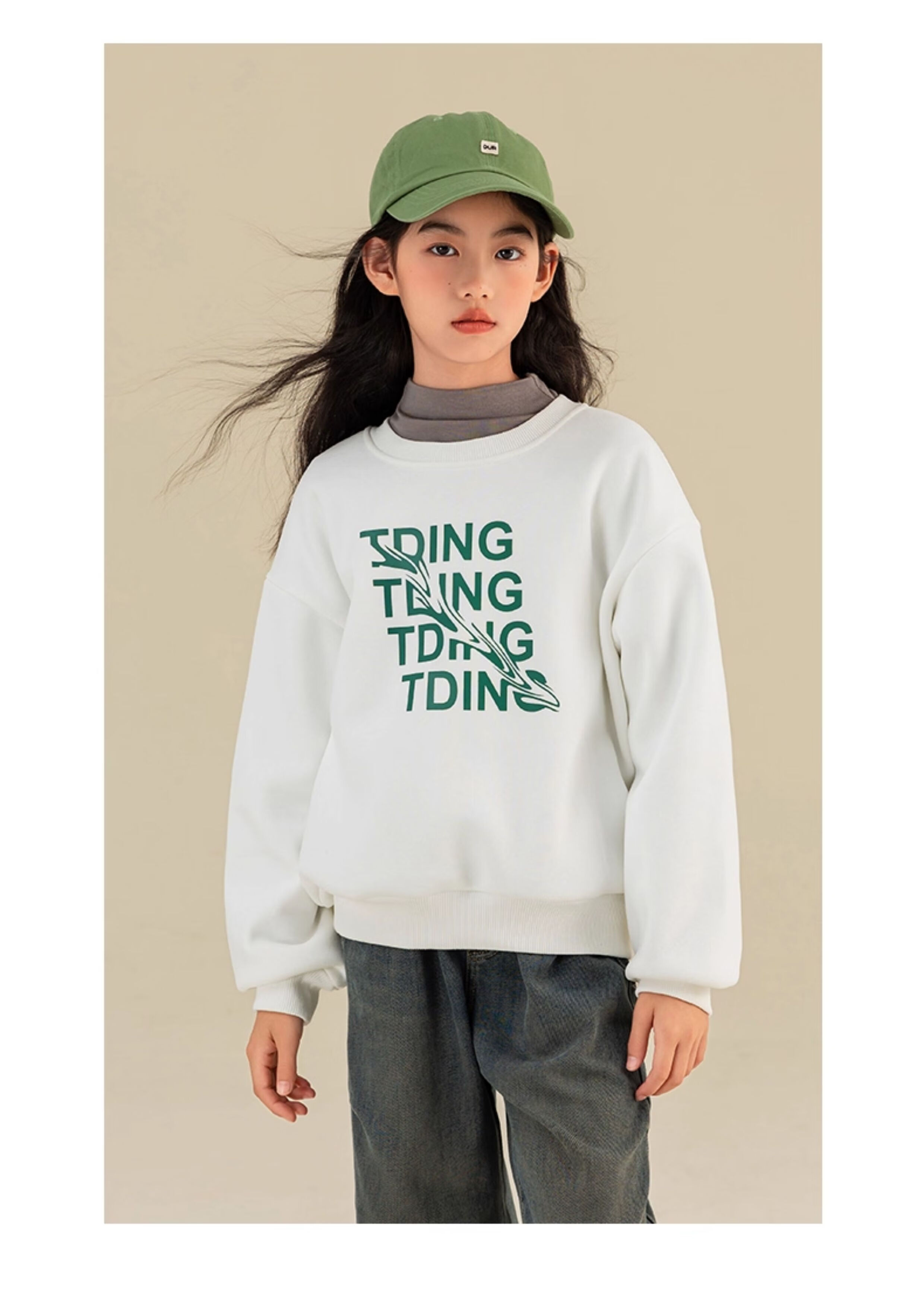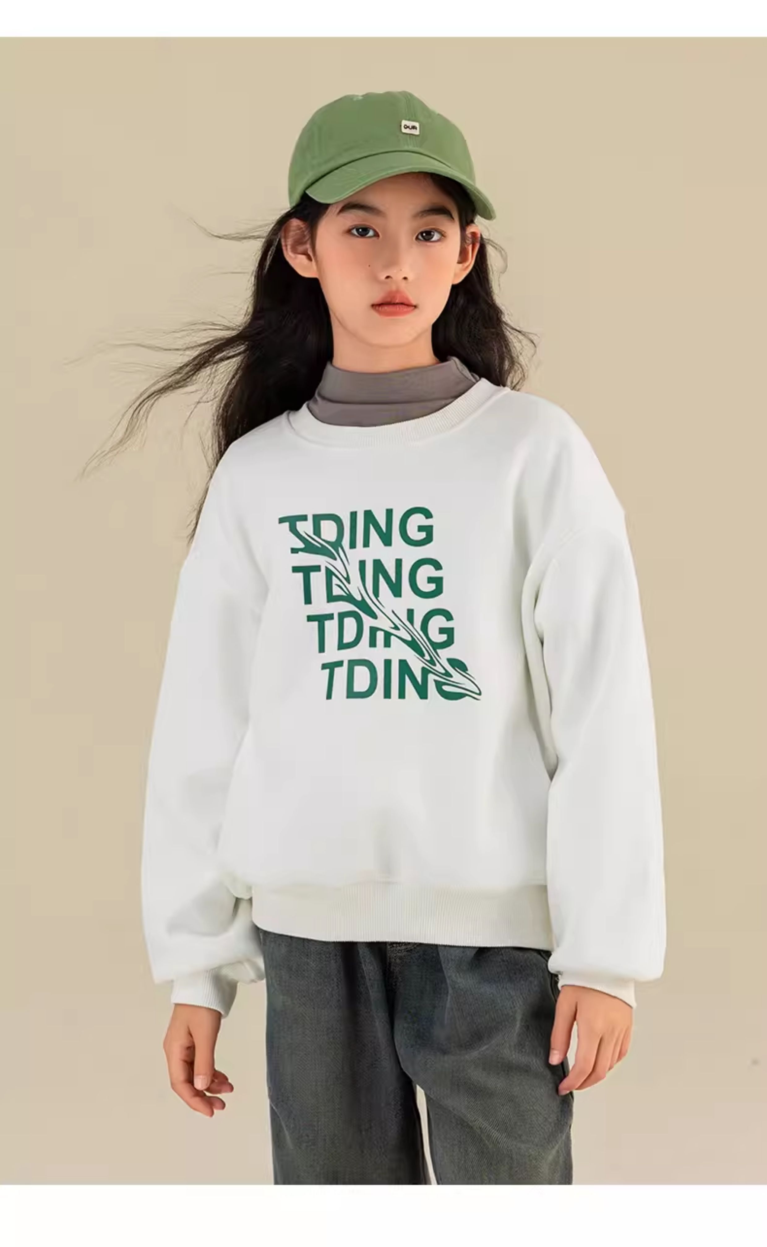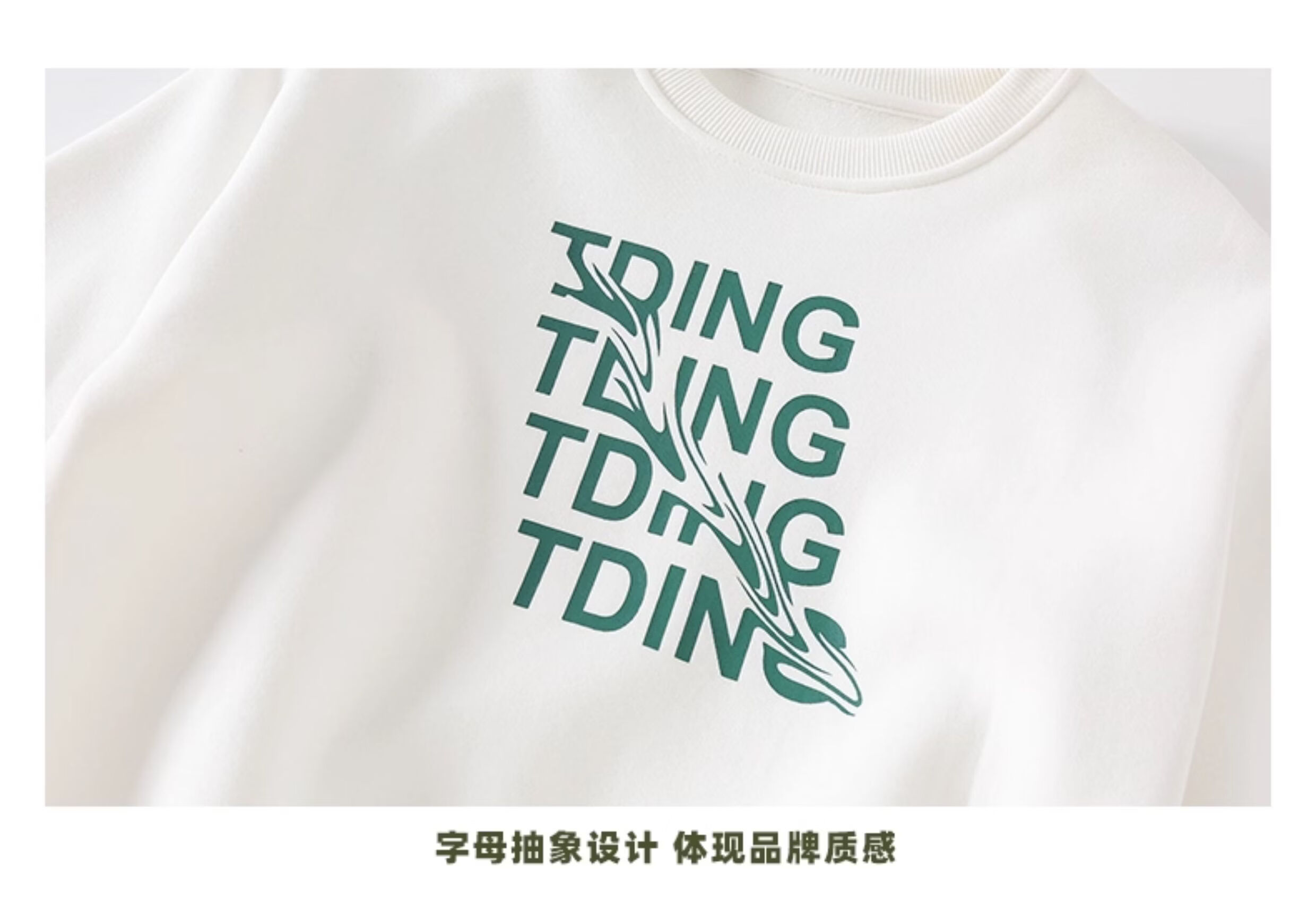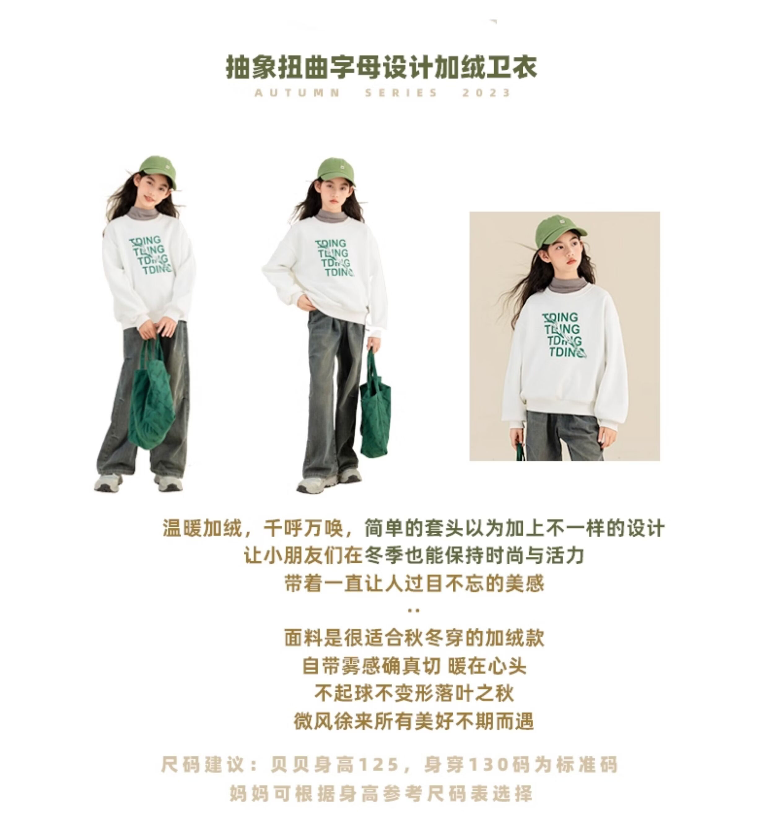 淘町女童卫衣一体绒秋冬中大童休闲百搭波浪字母设计圆领加绒打底 白色 160