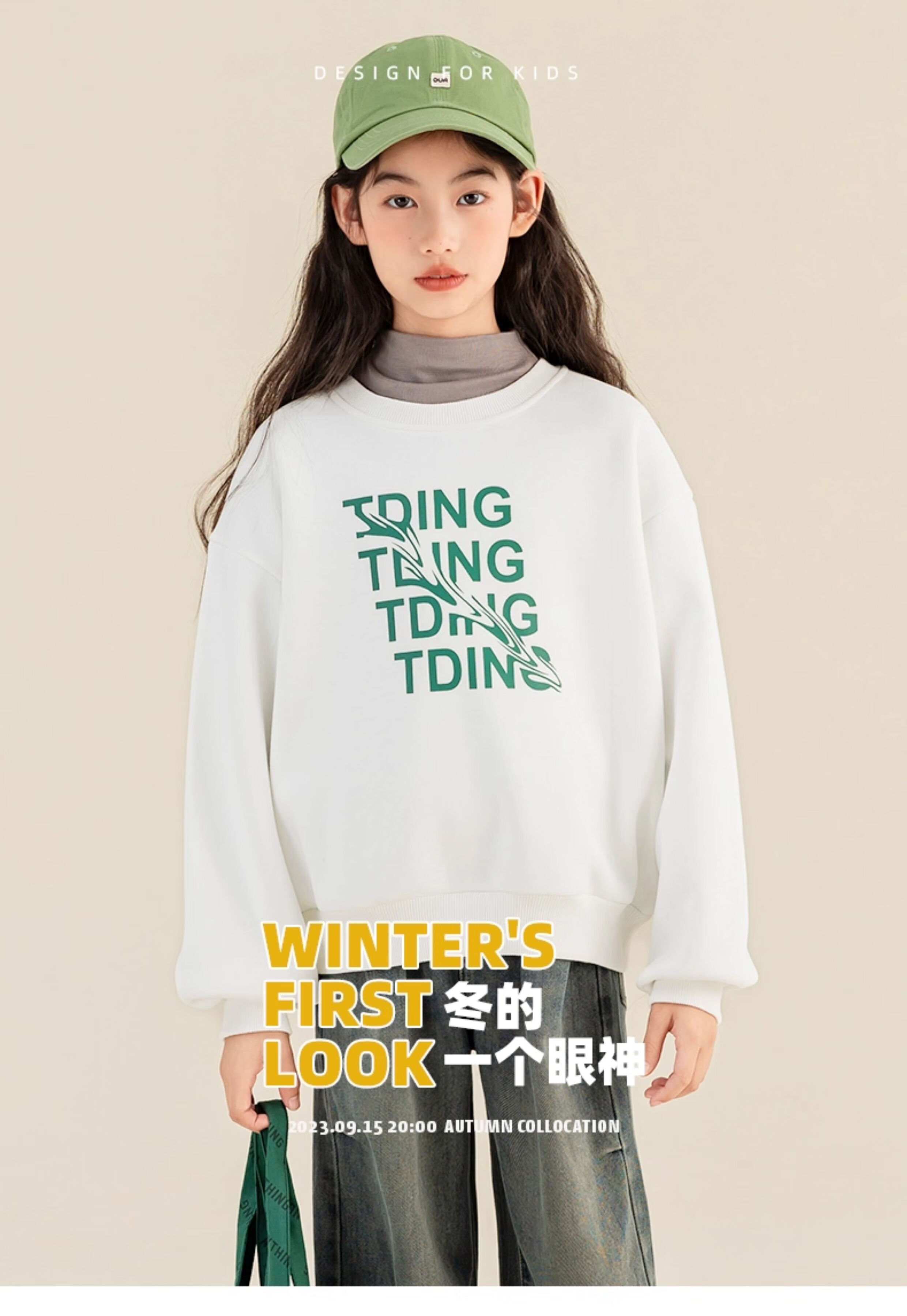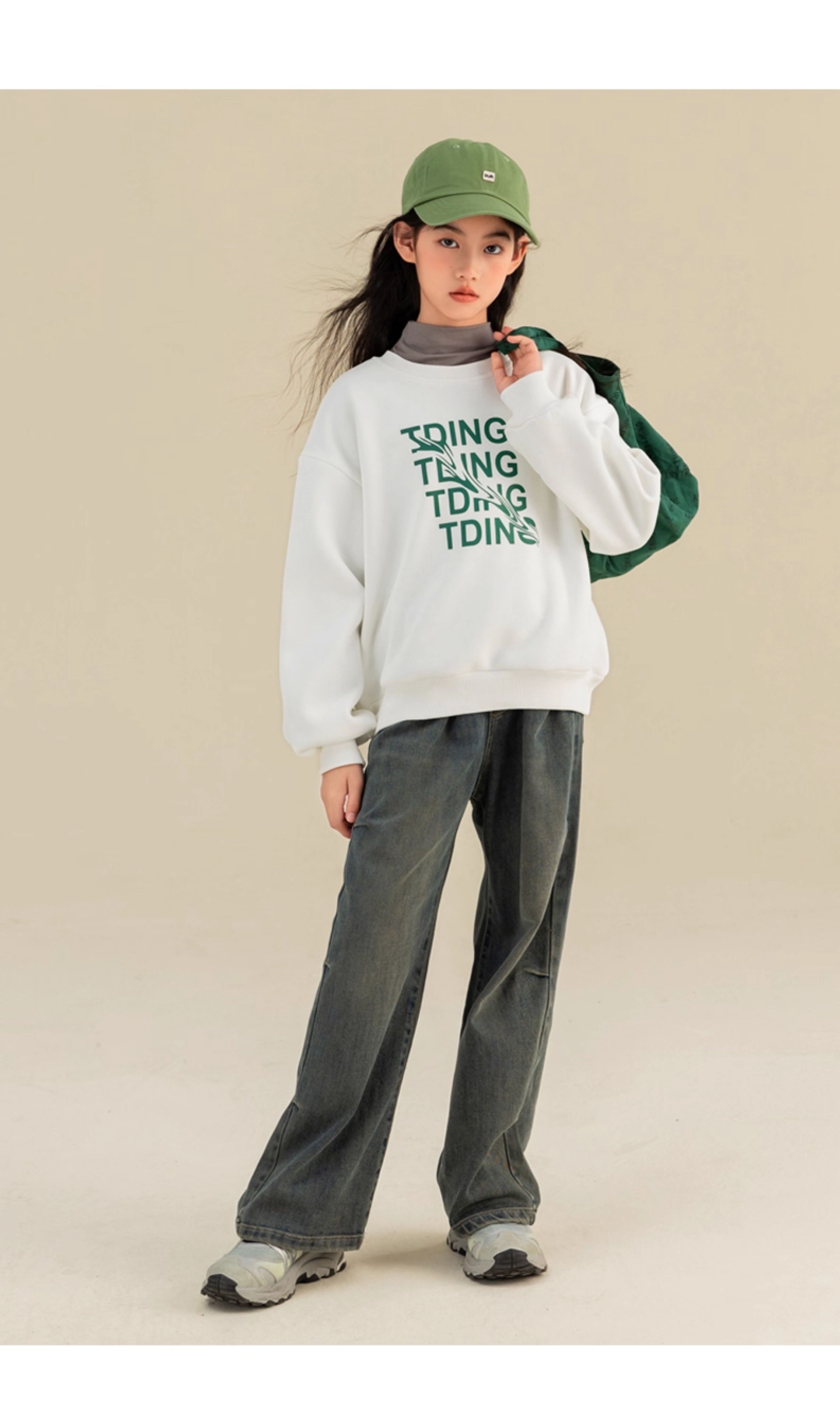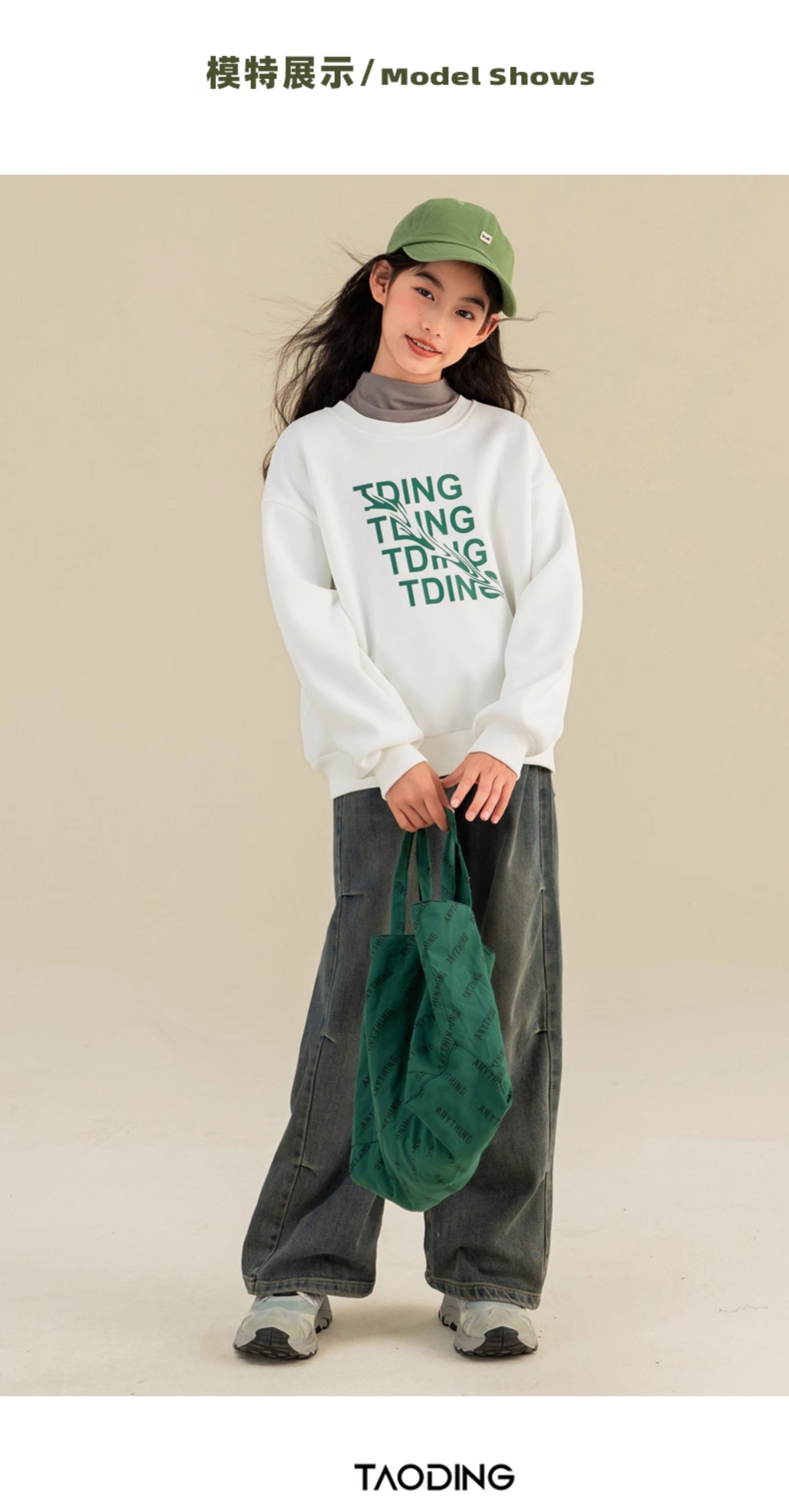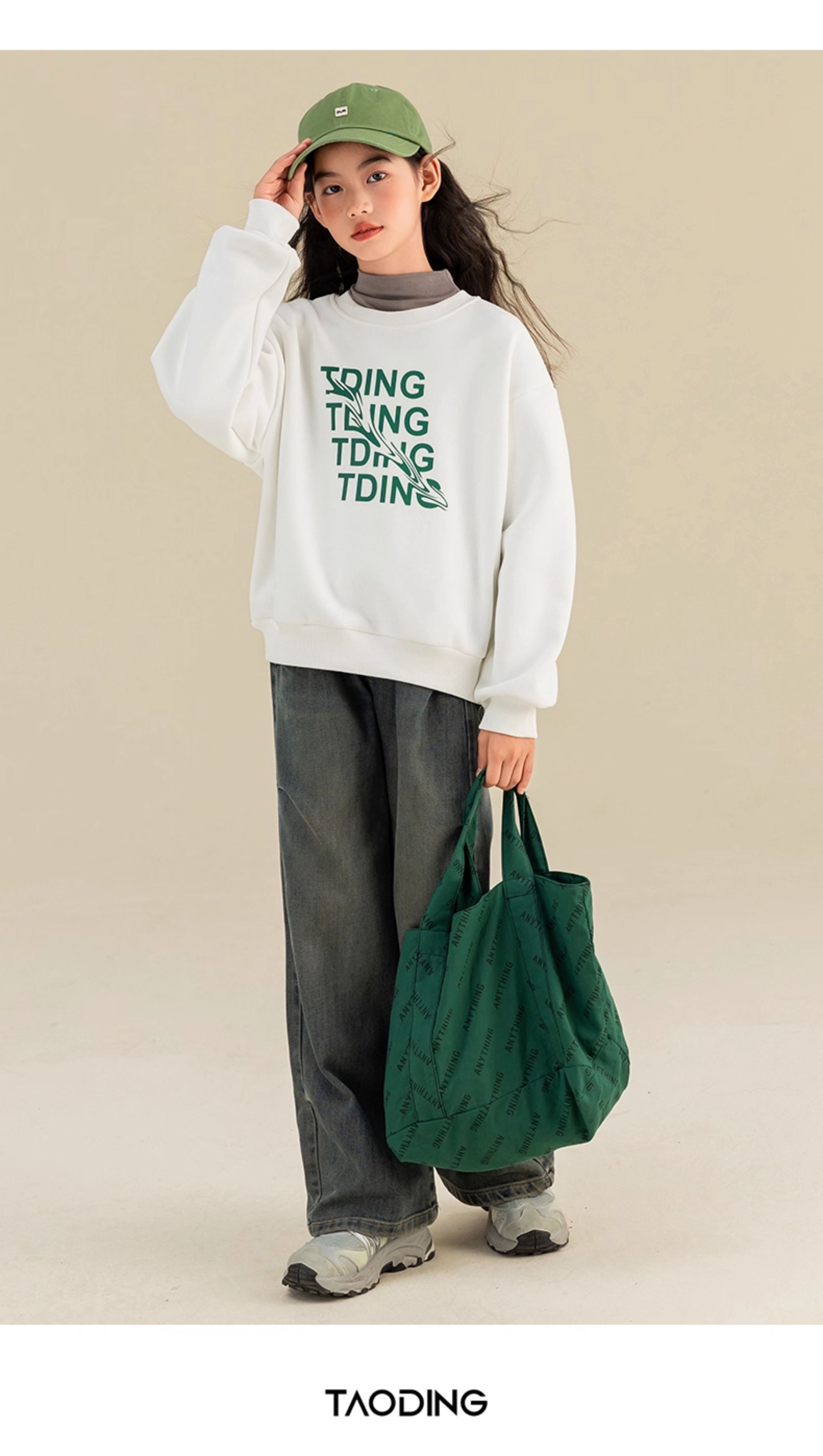 淘町女童卫衣一体绒秋冬中大童休闲百搭波浪字母设计圆领加绒打底 白色 160