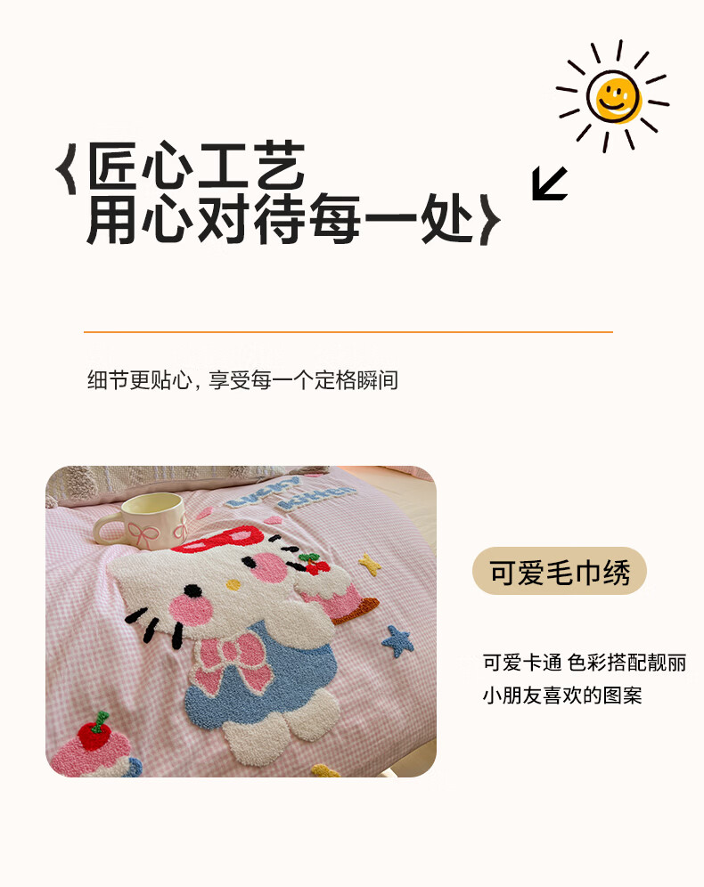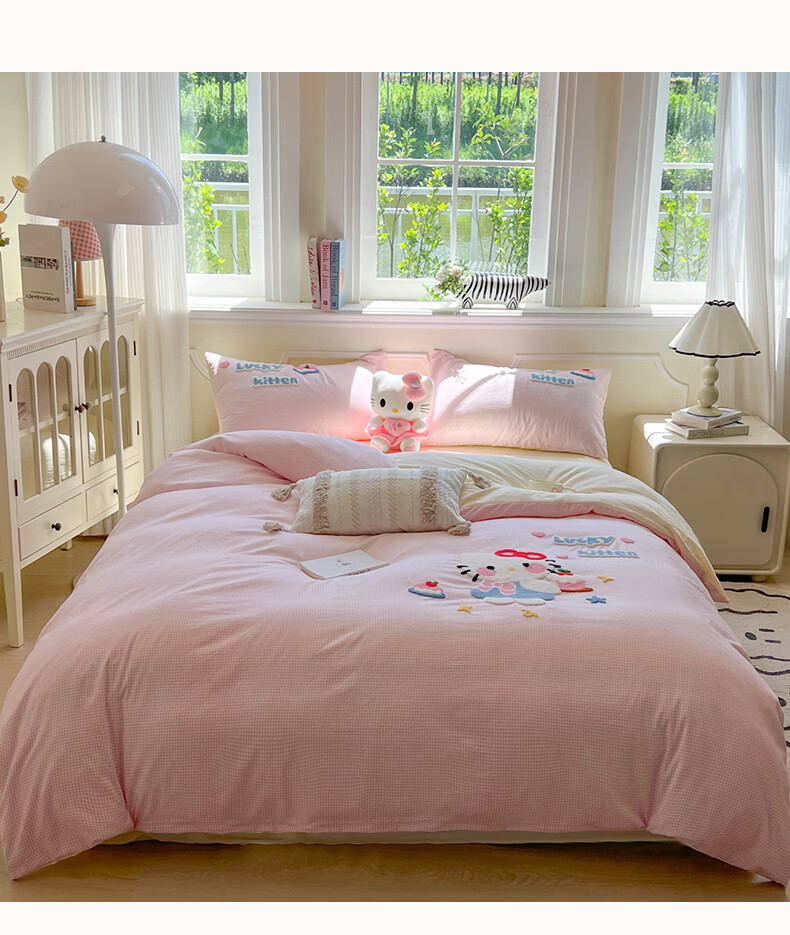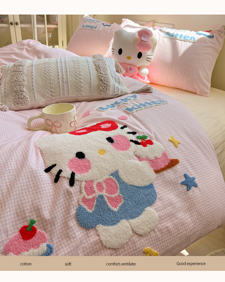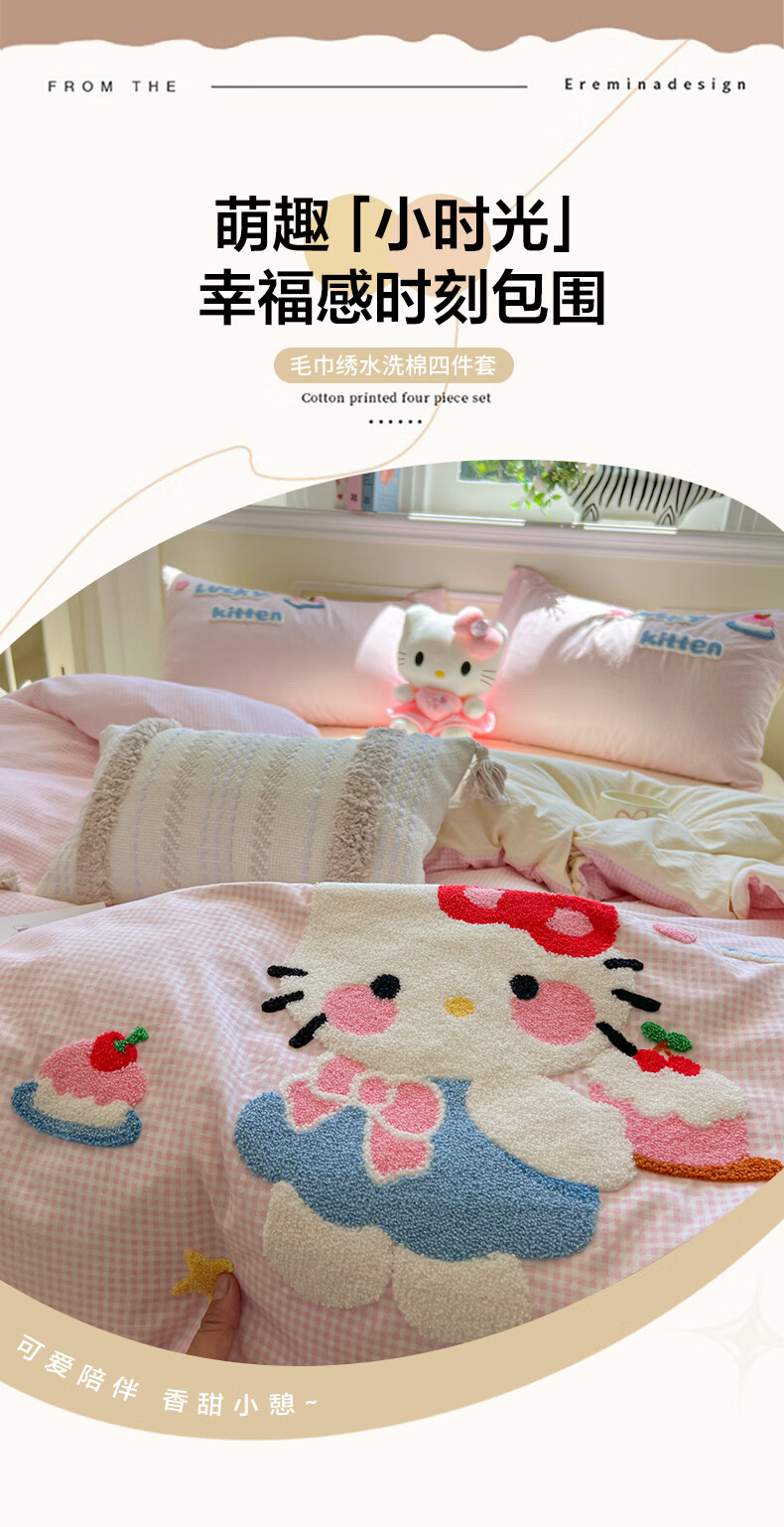 VJE公主风水洗棉四件套可爱卡通毛巾绣床单被套学生宿舍亲肤棉三件套 蛋糕猫咪 三件套0.9m 床单款 (被套150*200cm)