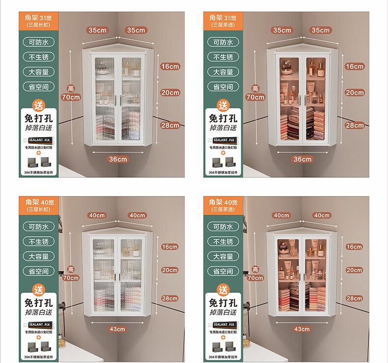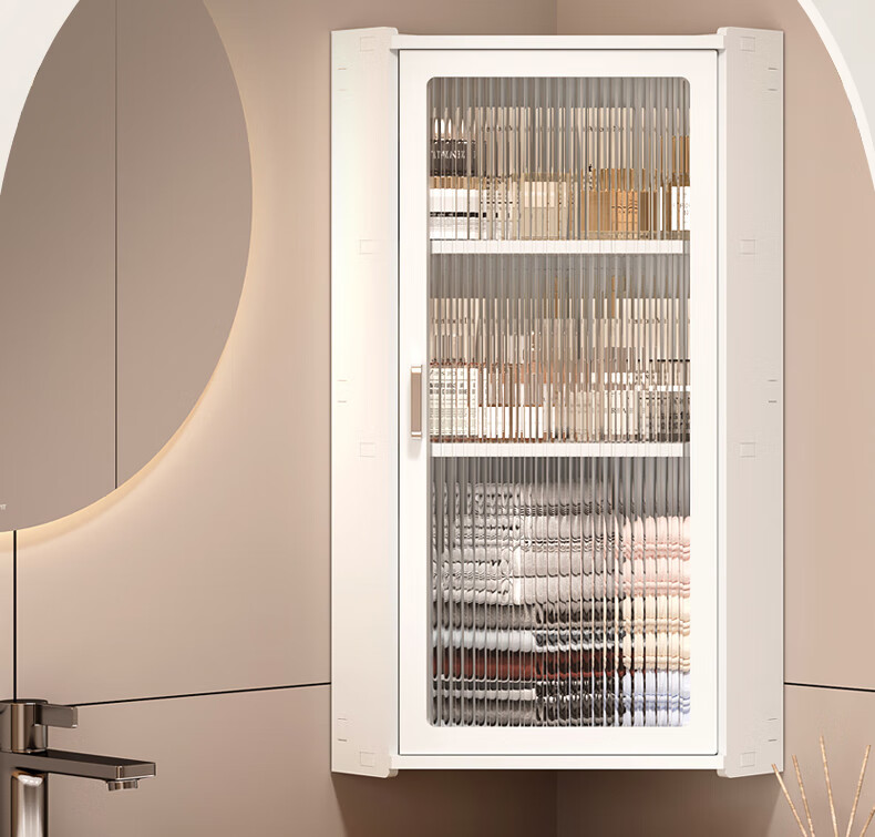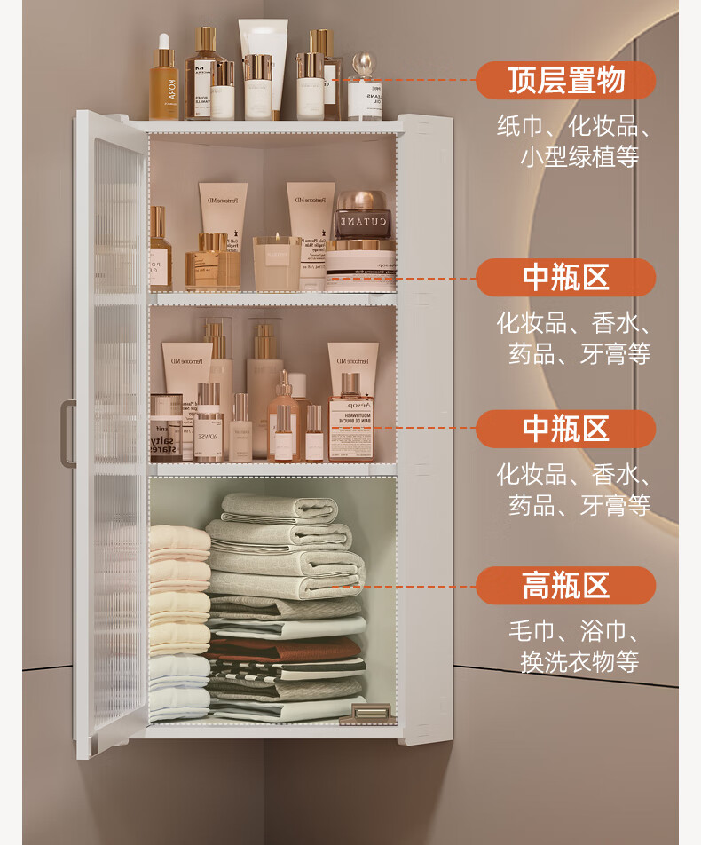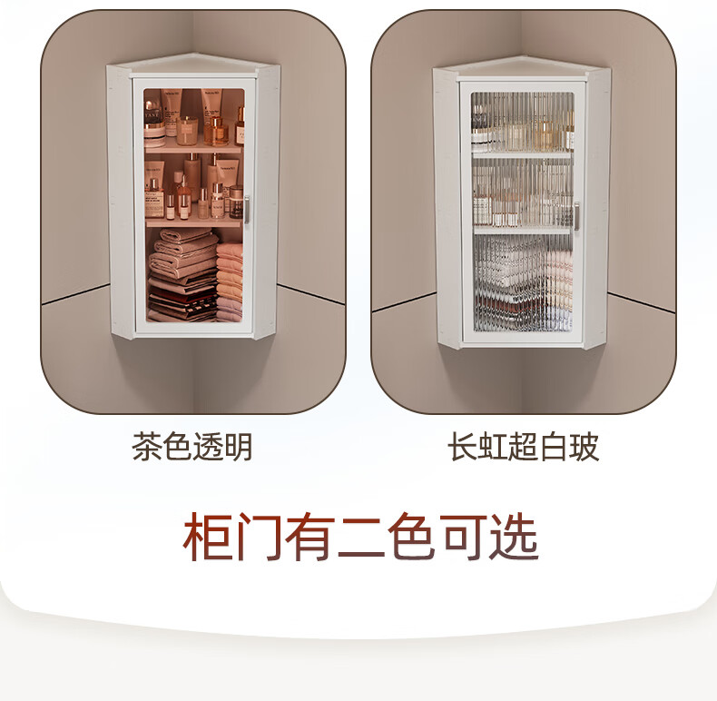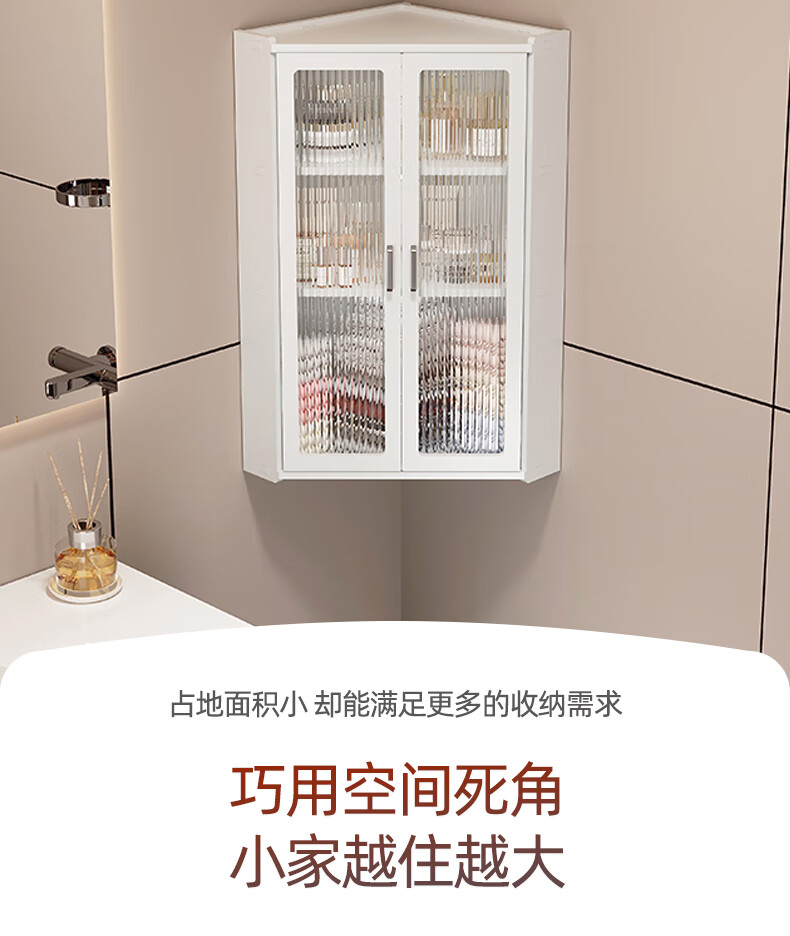 枫居物语浴室卫生间置物架收纳柜墙角壁挂式化妆品洗漱台储物柜防水免打孔 挂角架 白色【38x70】茶透