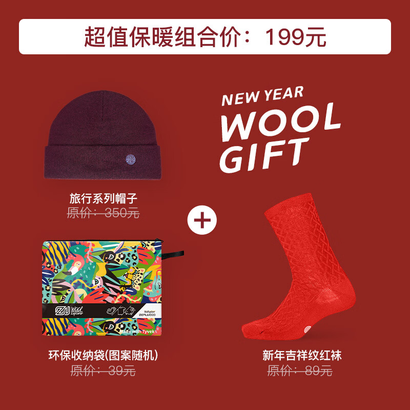 ZEAL WOOD赛乐温暖组合套装送家人新年礼物美丽诺羊毛套装圣诞元旦春节礼物 新年红袜+驼色旅行冷帽(均码)+收纳袋(图案随机) M 39-42(袜子尺码)