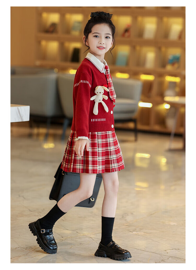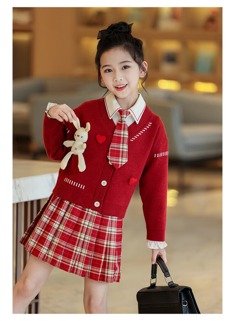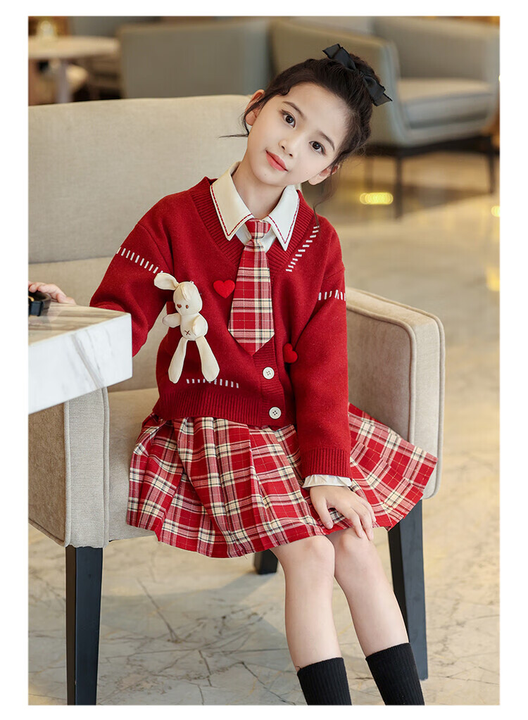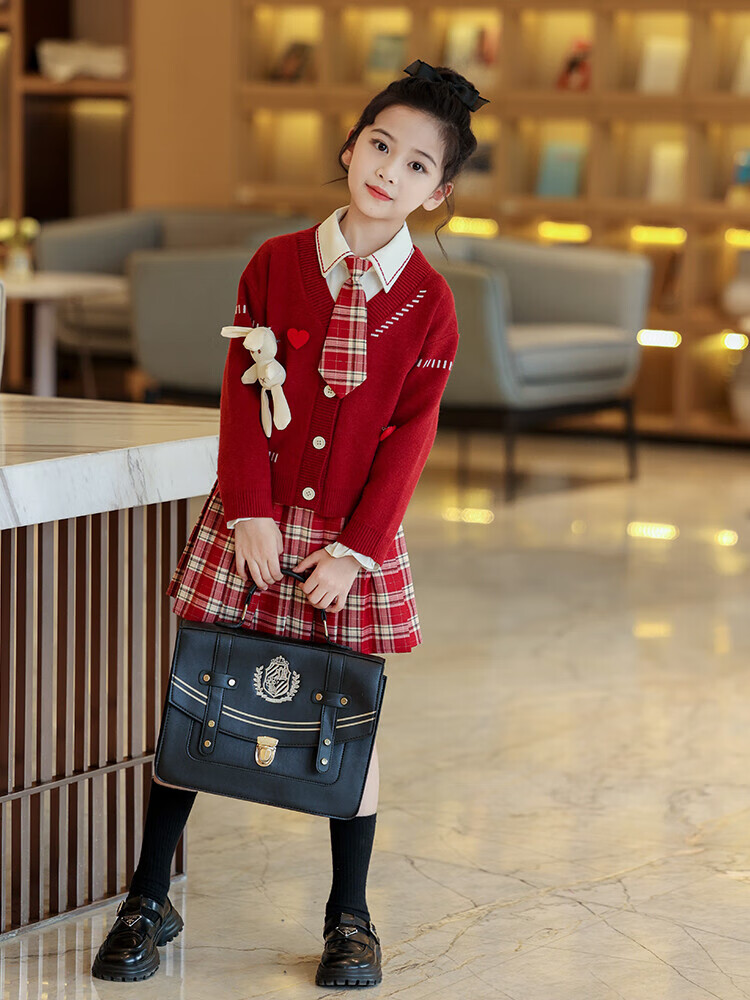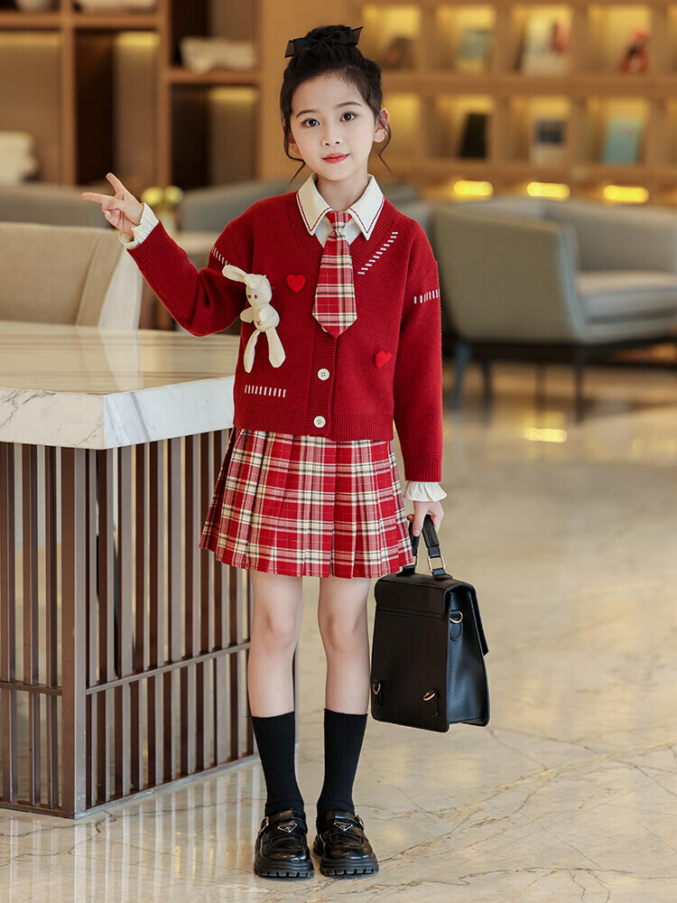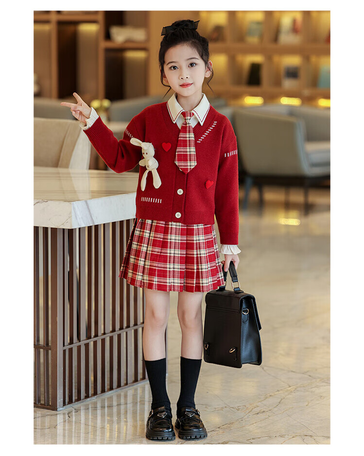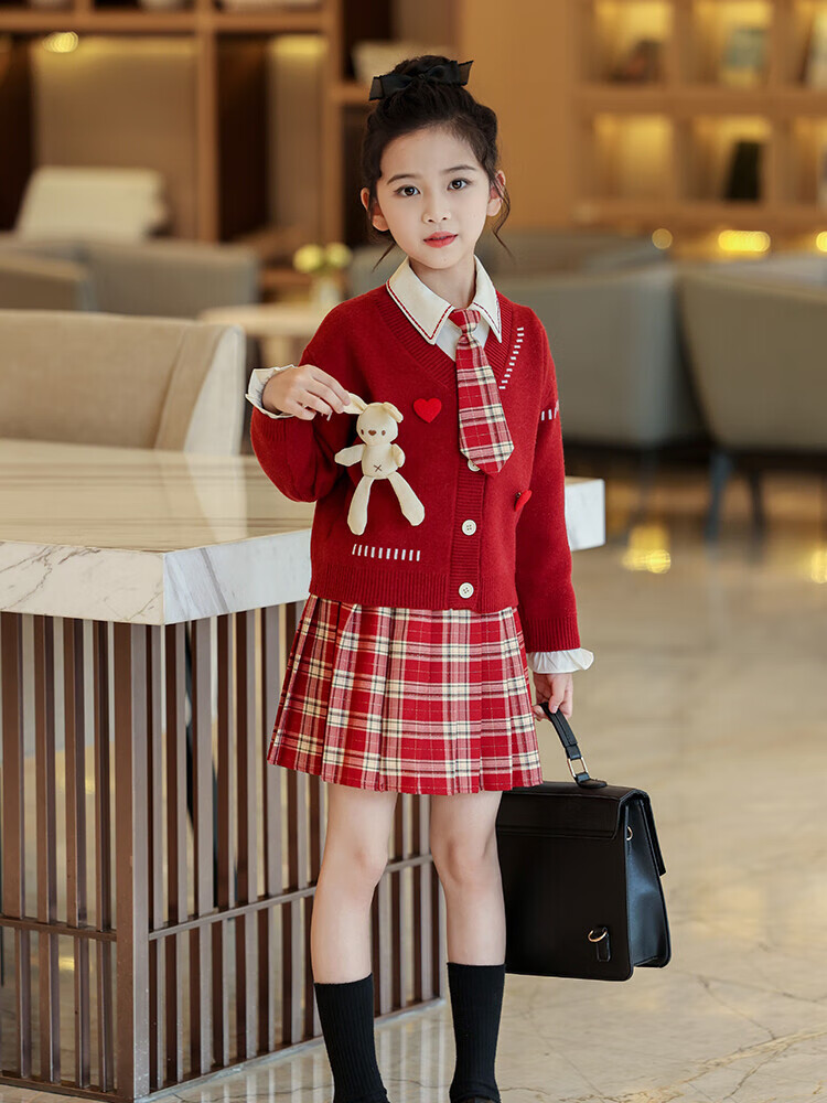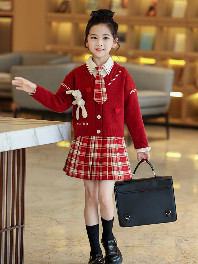 G.duck童装女童套装春秋学院风儿童JK裙子洋气可爱女大童毛衣衬衫三件套 红色三件套 120 (建议身高110cm 6-7岁)c