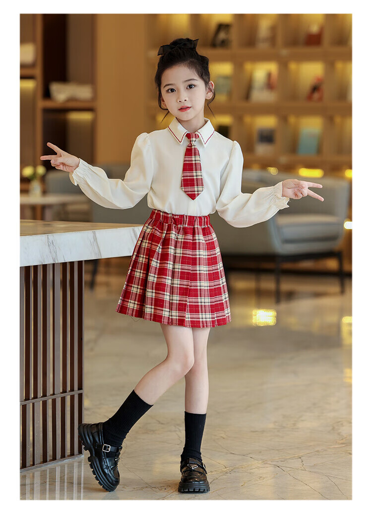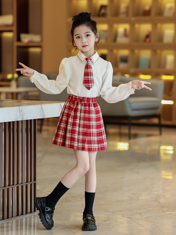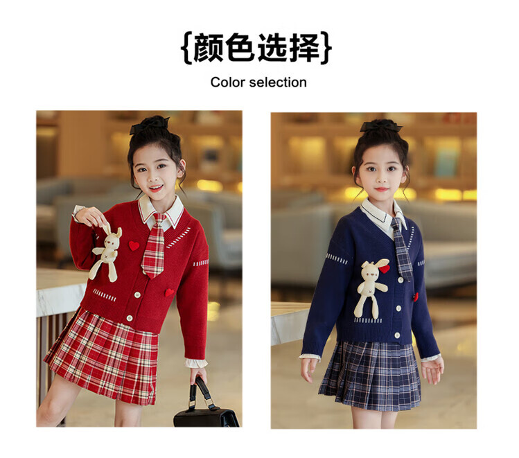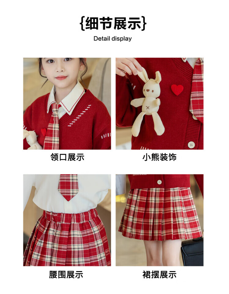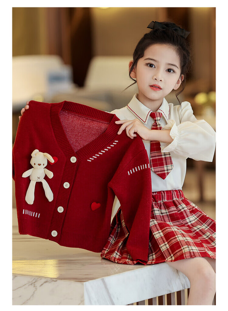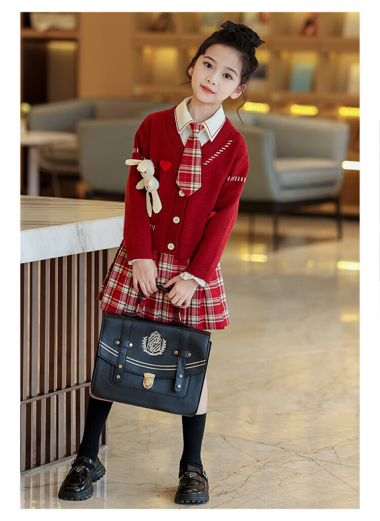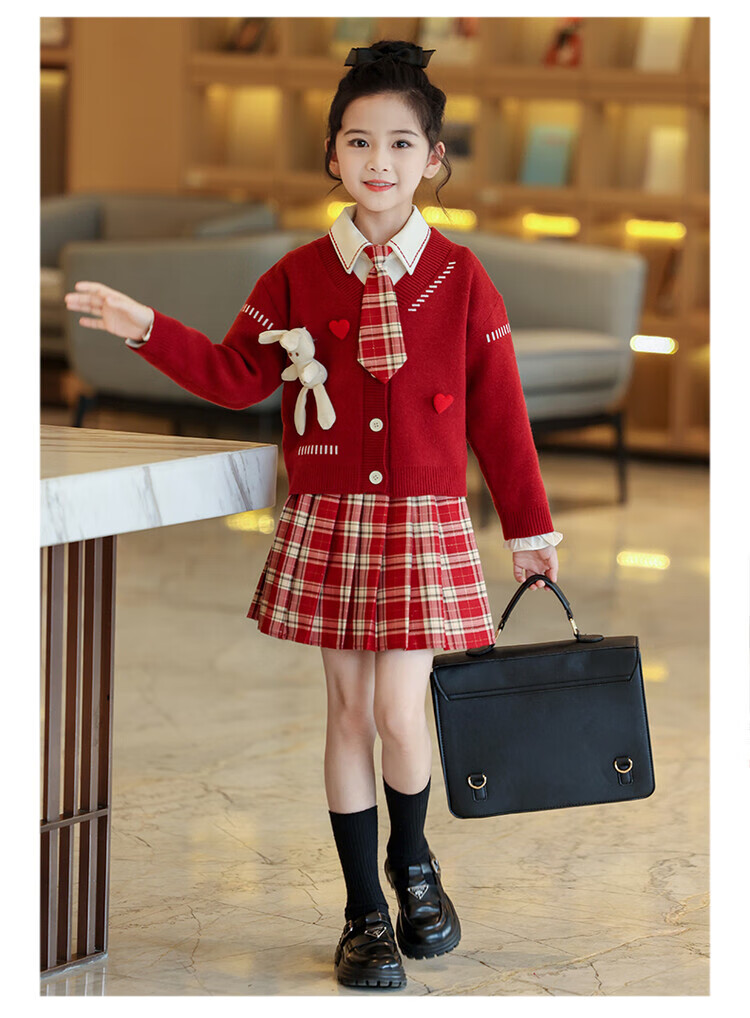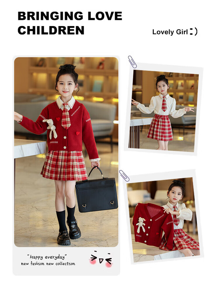 G.duck童装女童套装春秋学院风儿童JK裙子洋气可爱女大童毛衣衬衫三件套 红色三件套 120 (建议身高110cm 6-7岁)c