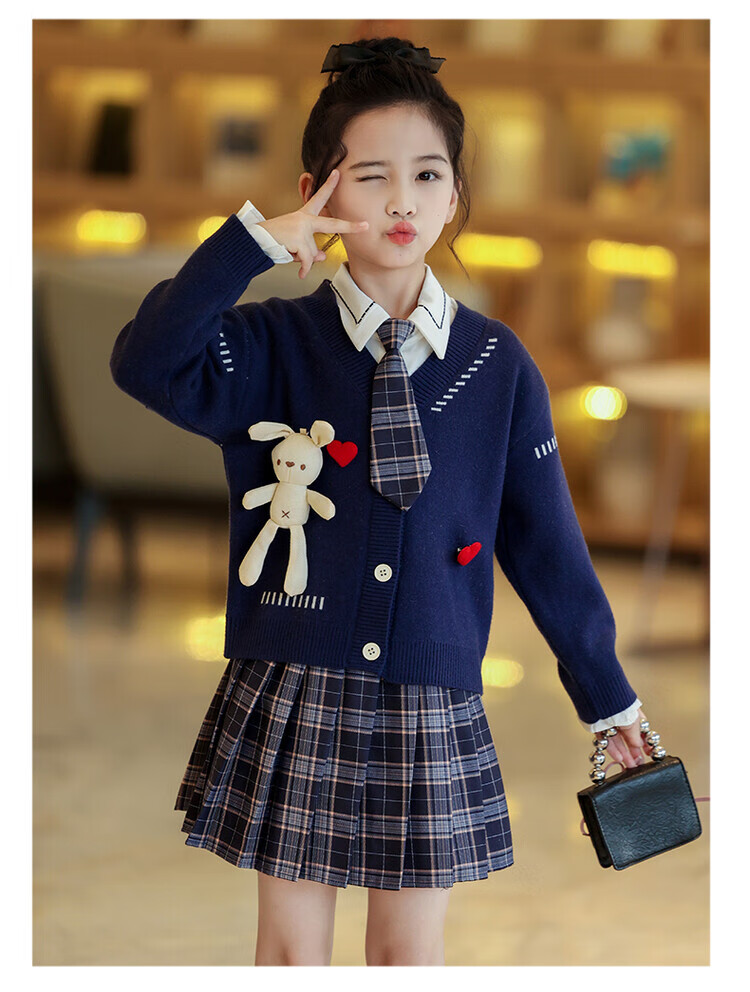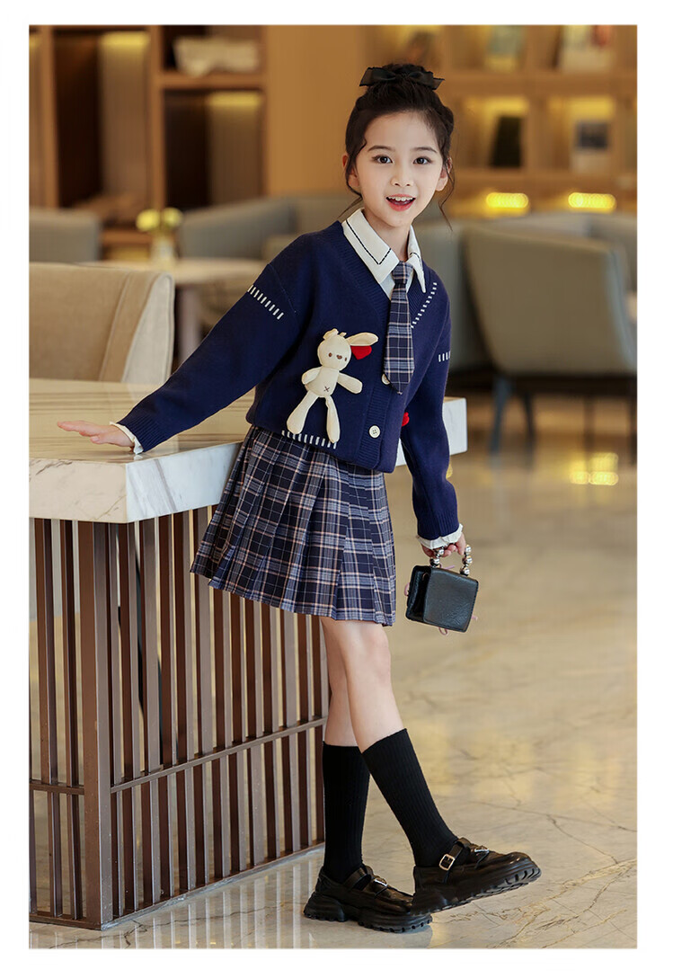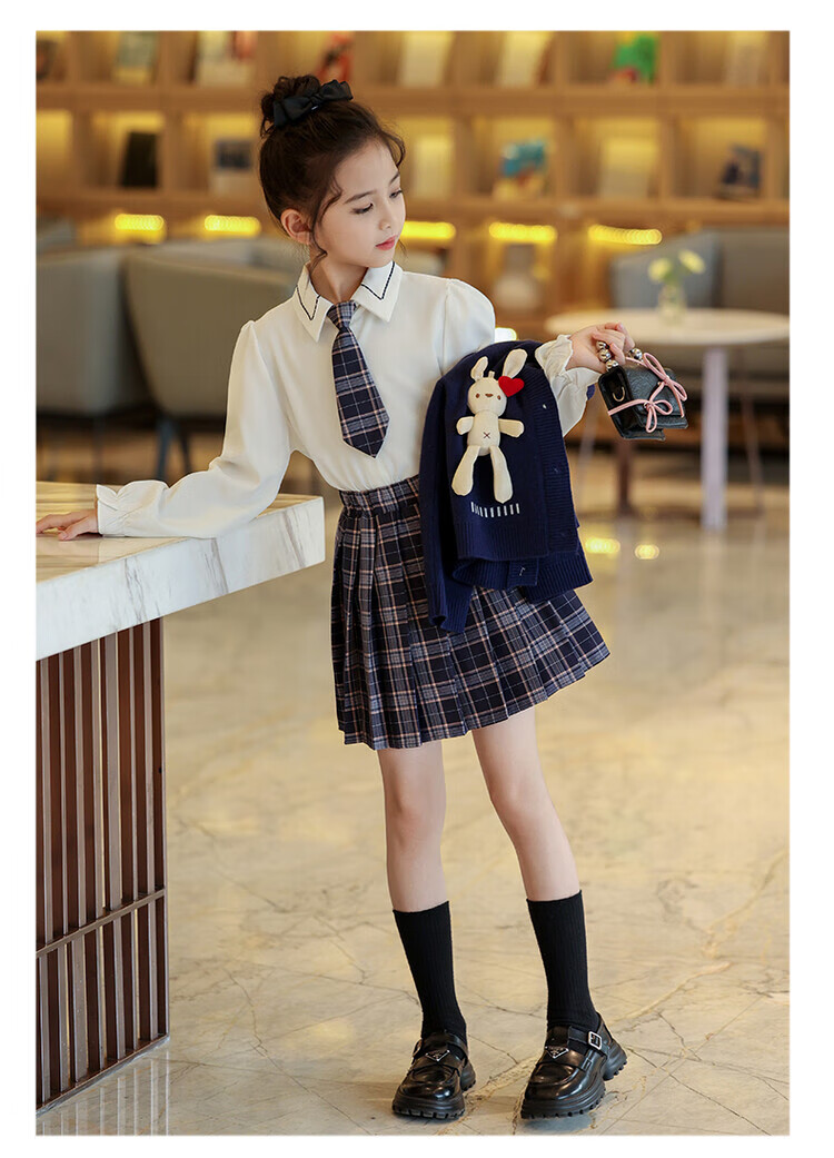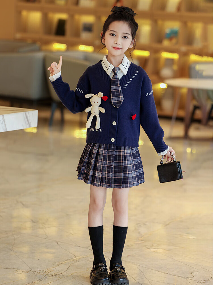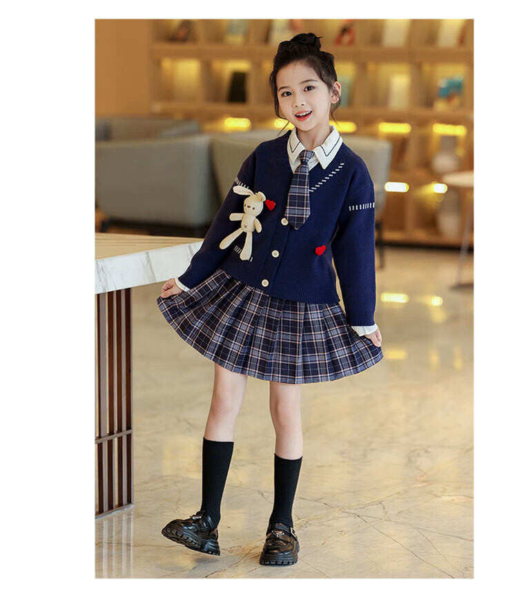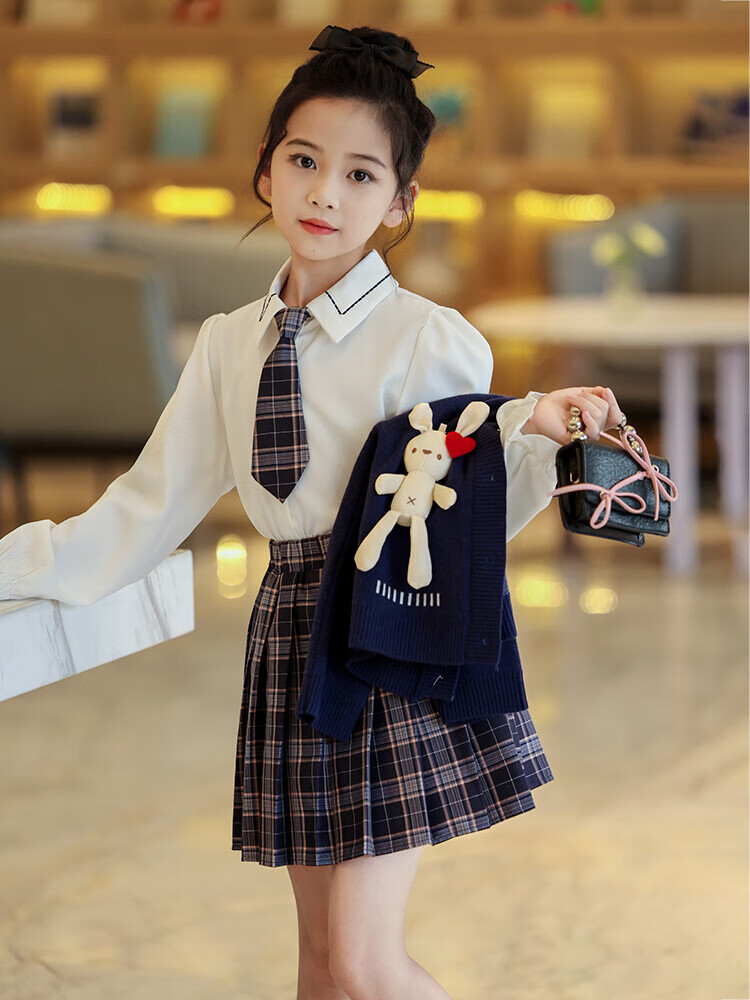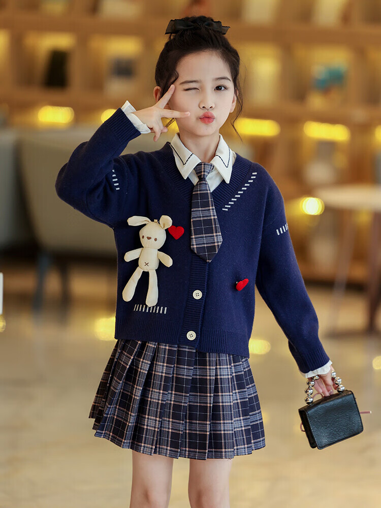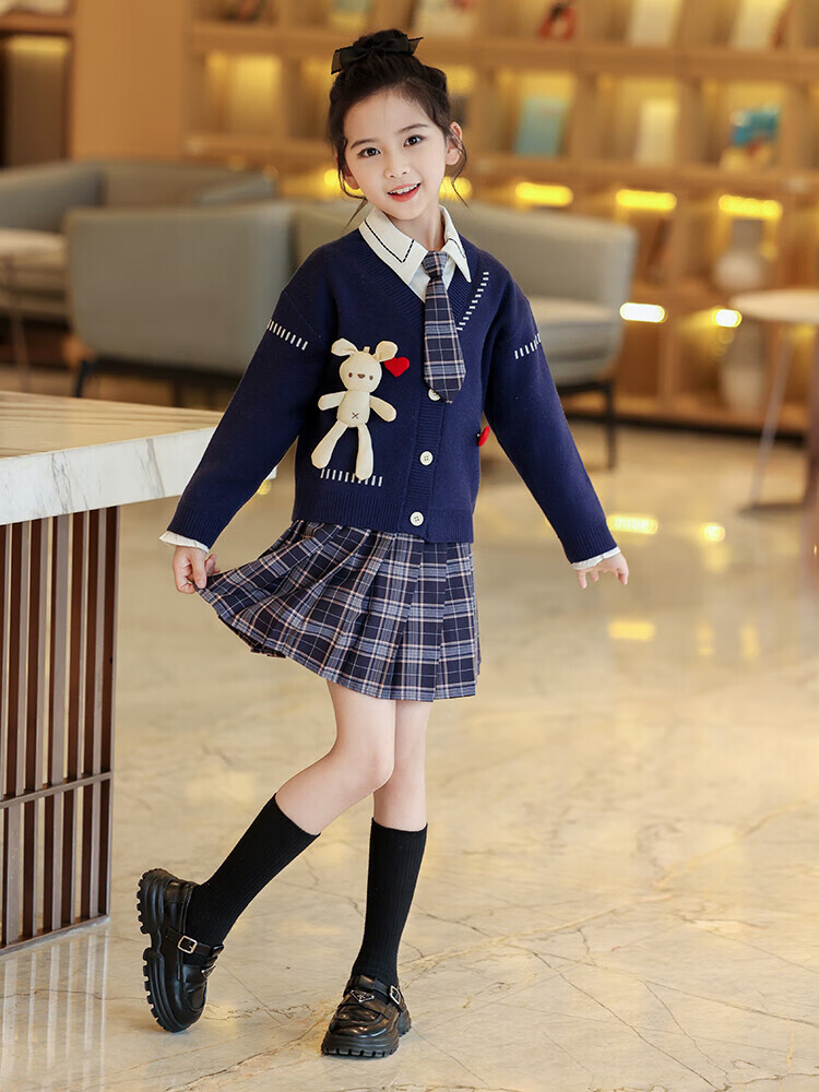 G.duck童装女童套装春秋学院风儿童JK裙子洋气可爱女大童毛衣衬衫三件套 红色三件套 120 (建议身高110cm 6-7岁)c