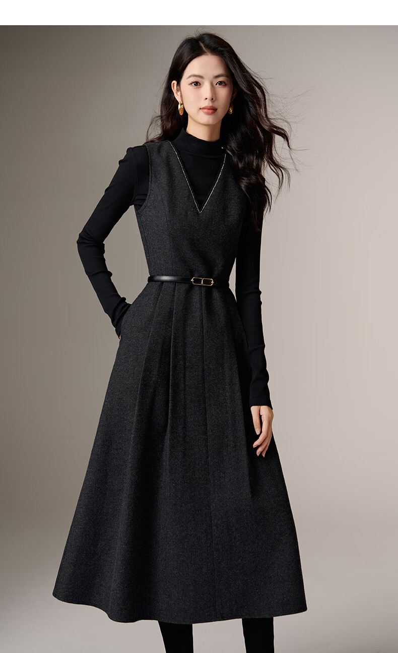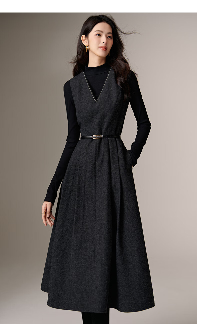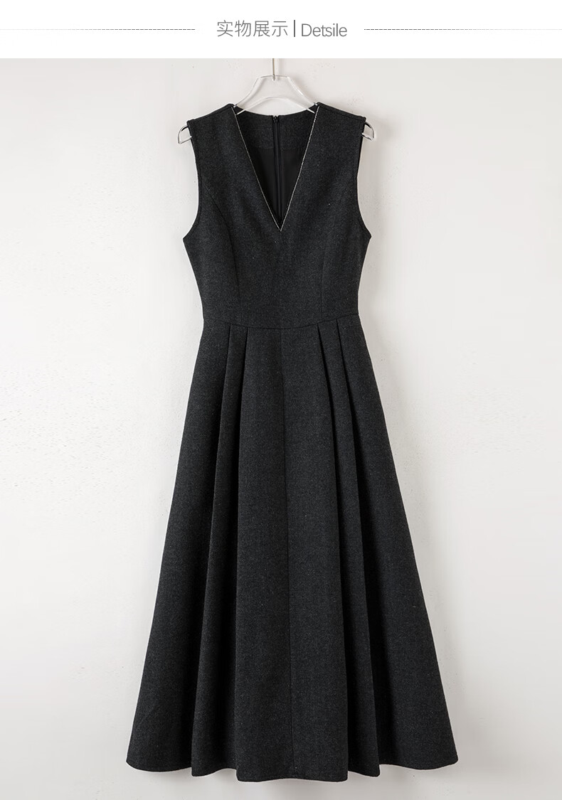 晚白【新品】冬新款知性轻熟风V领羊毛裙挺括收腰百搭无袖连衣裙 深灰色 L