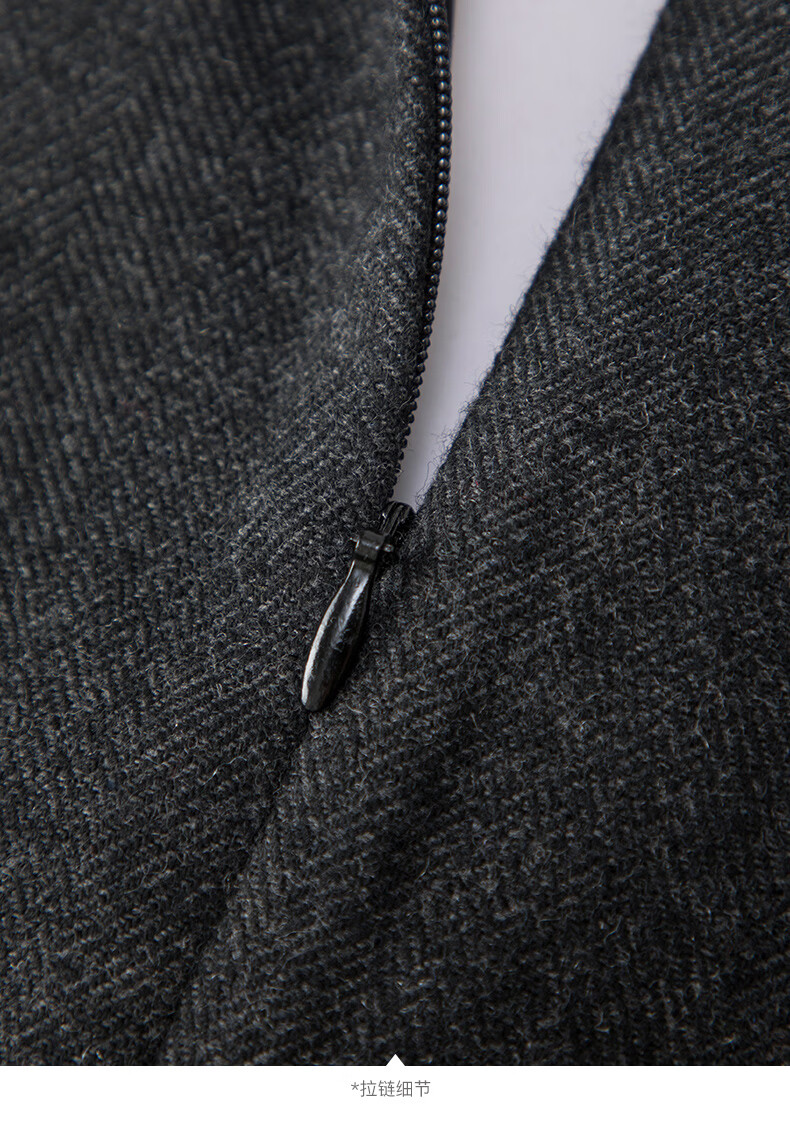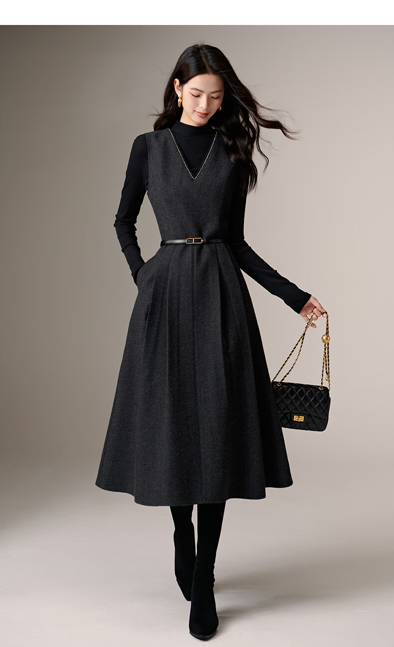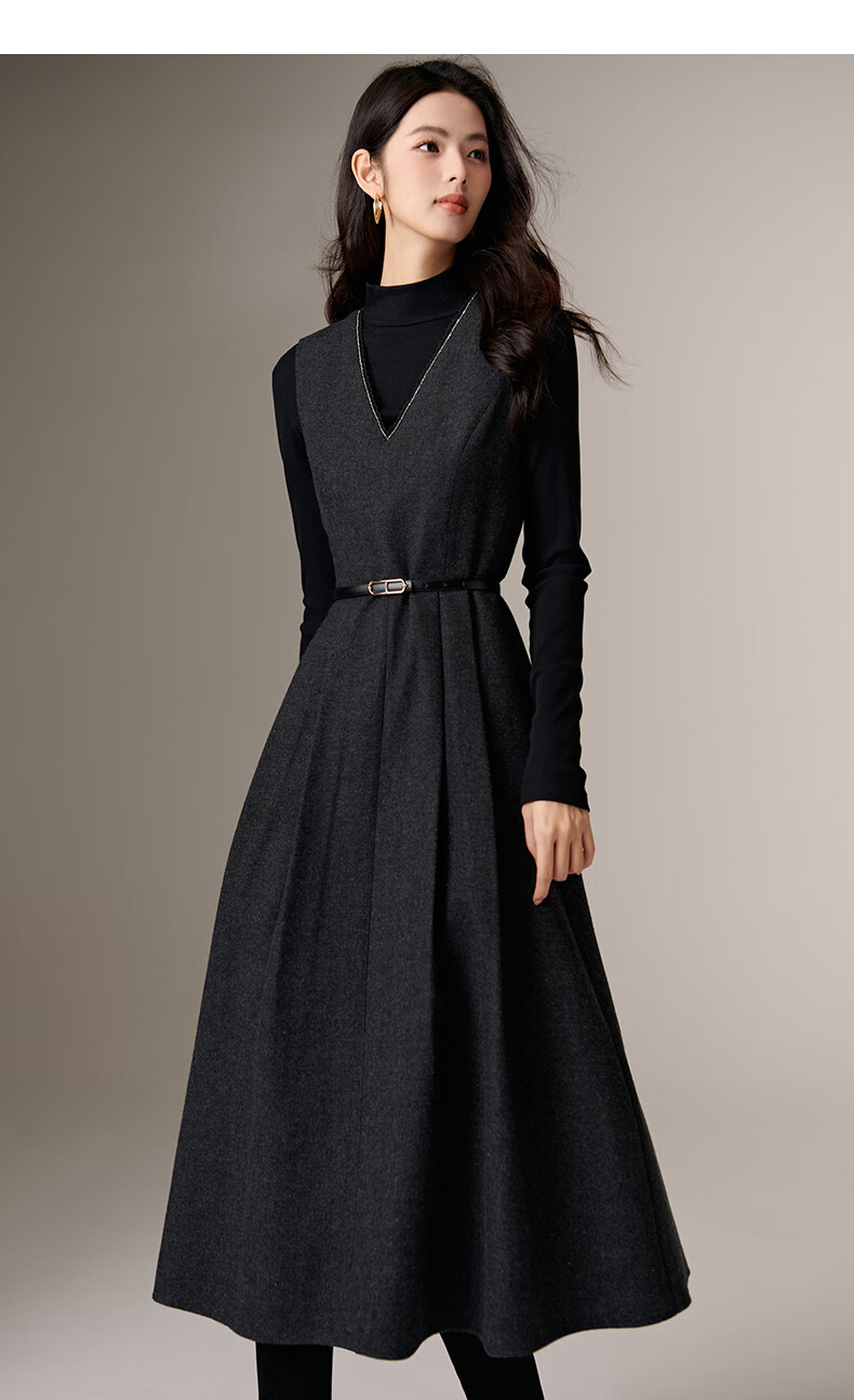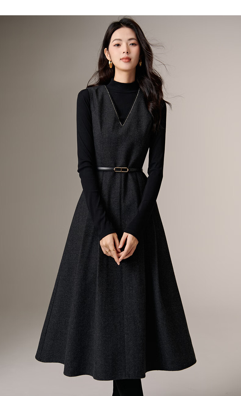 晚白【新品】冬新款知性轻熟风V领羊毛裙挺括收腰百搭无袖连衣裙 深灰色 L
