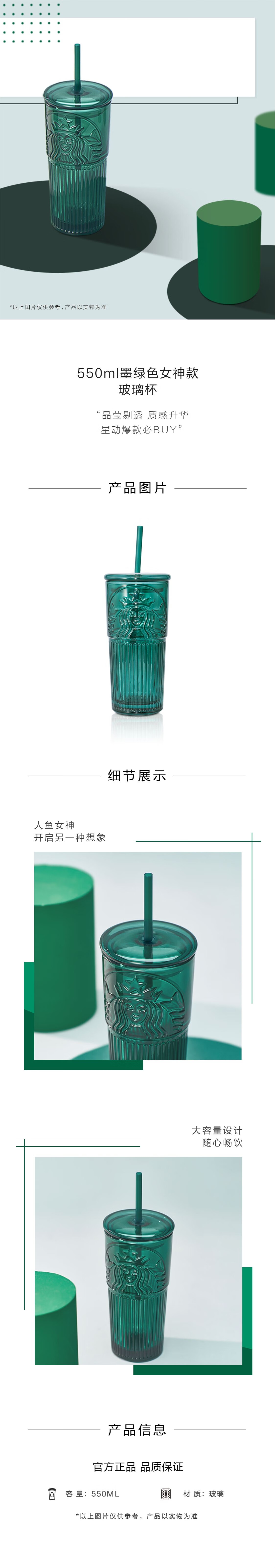 星巴克(Starbucks)墨绿色女神款玻璃杯550ml吸管杯办公室复古冷水杯生日礼物