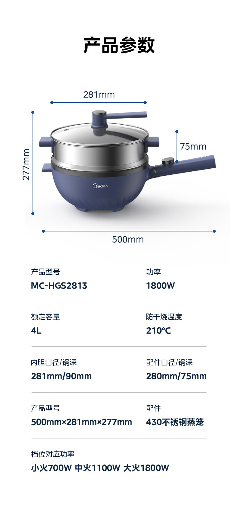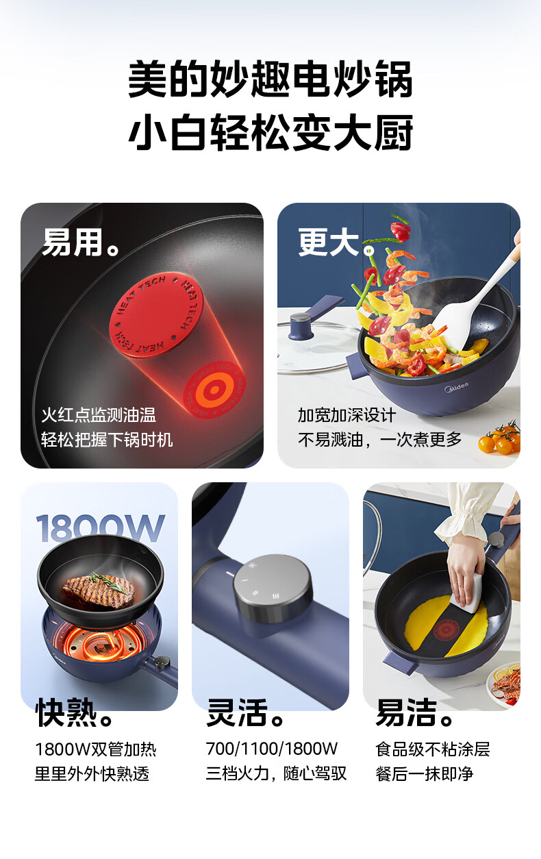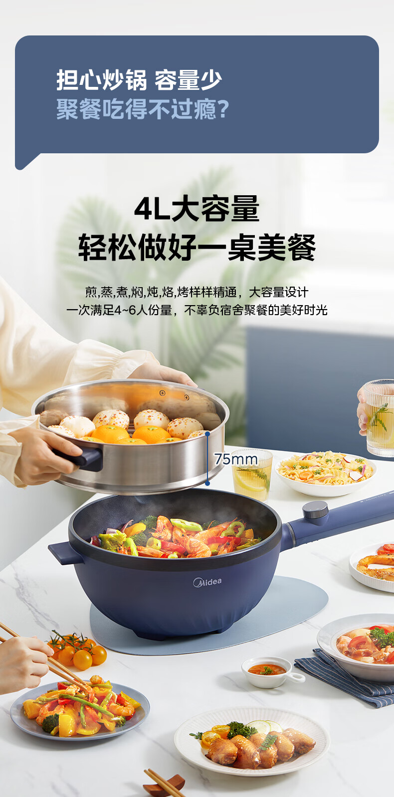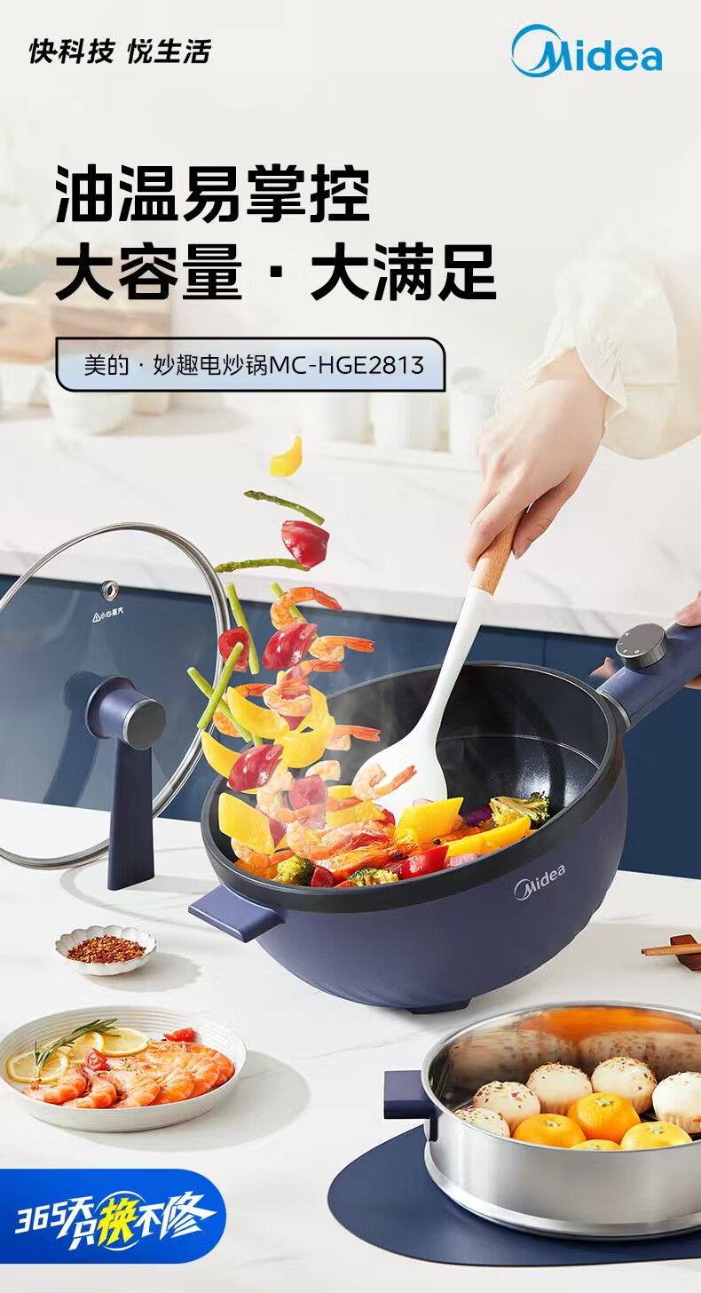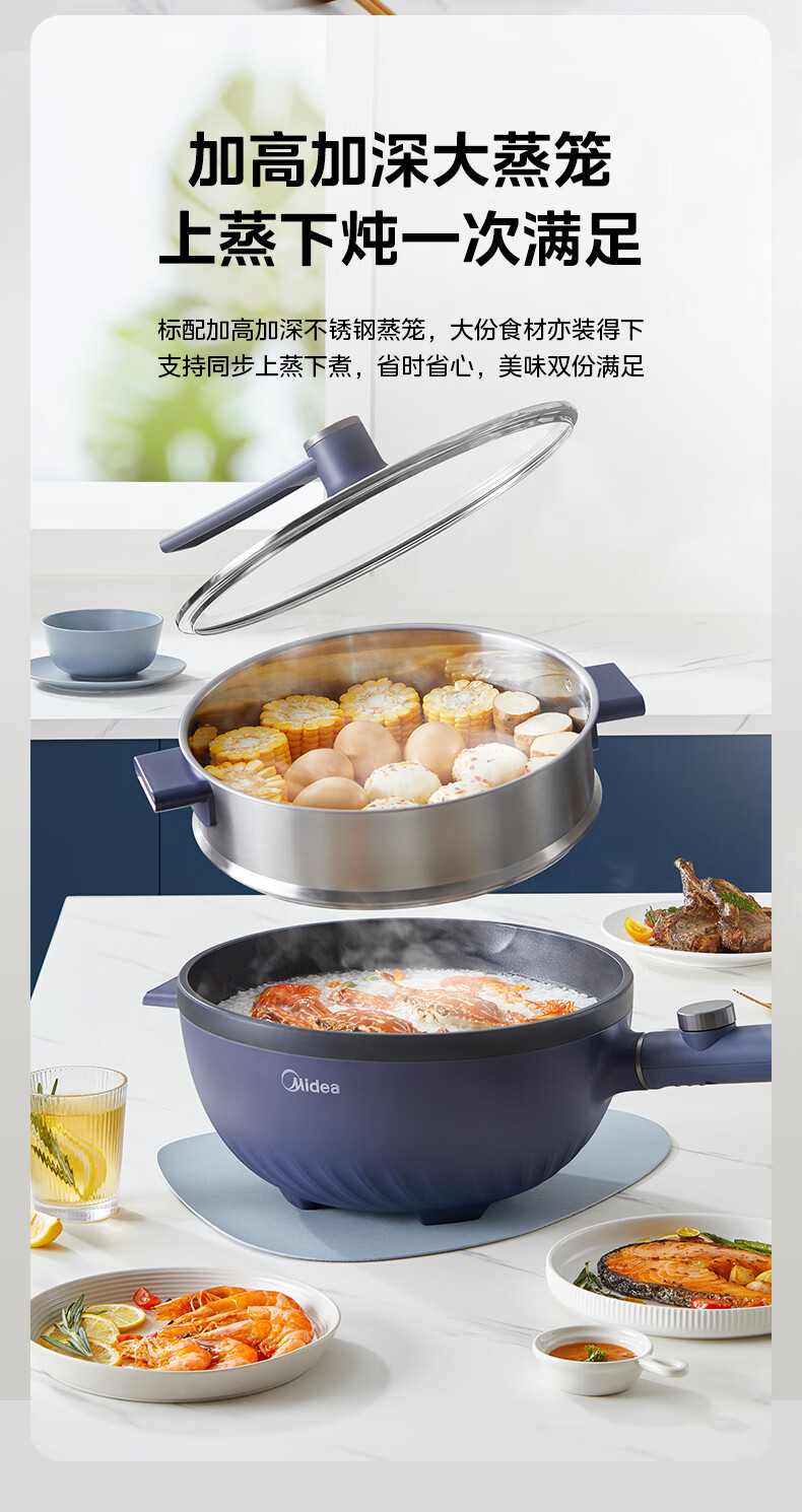 美的(Midea)电炒锅 电蒸锅 电火锅 电煮锅家用多功能煎炒一体锅 4L大容量料理烤肉电热锅 HGE2813 配蒸笼木铲