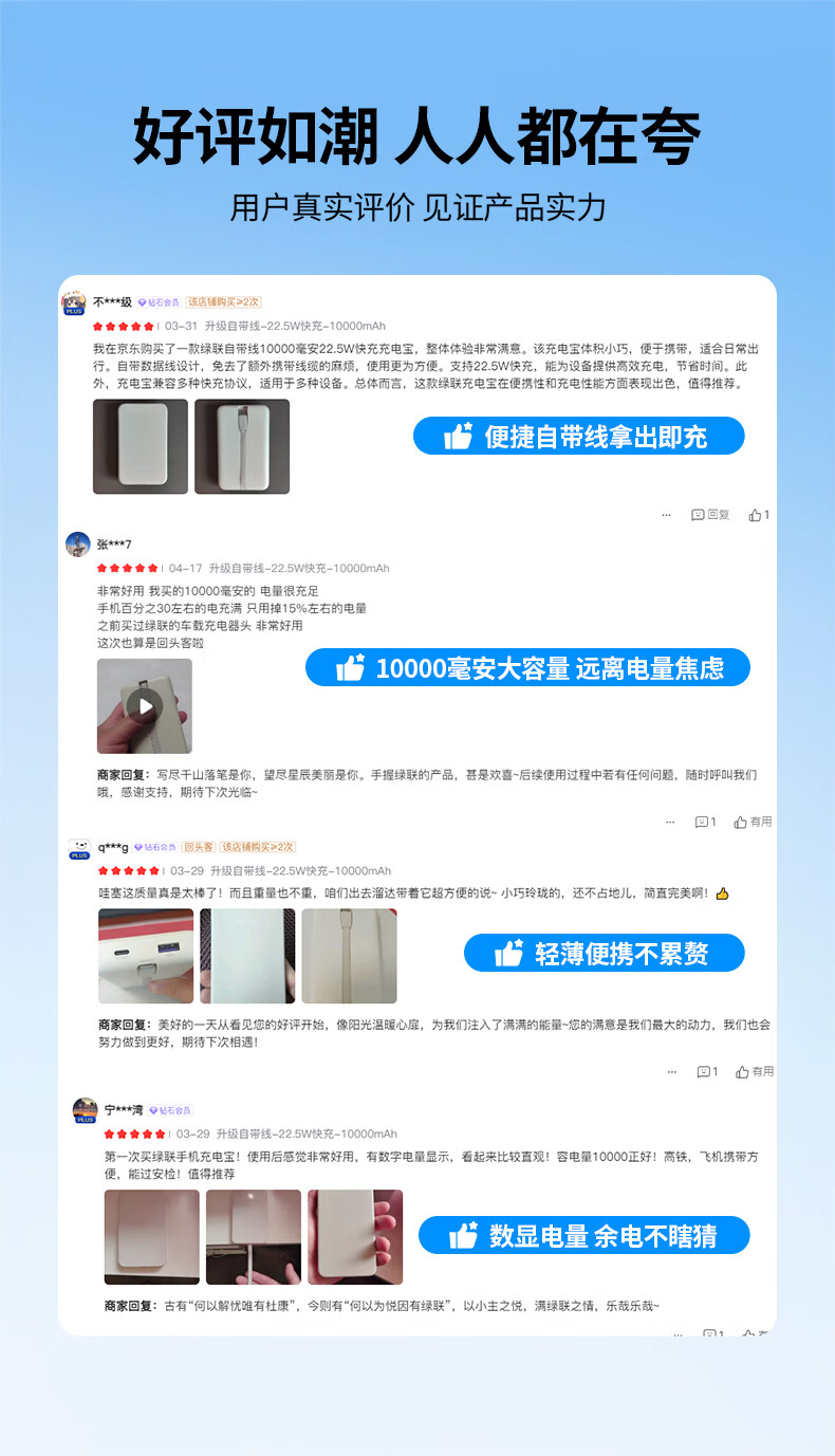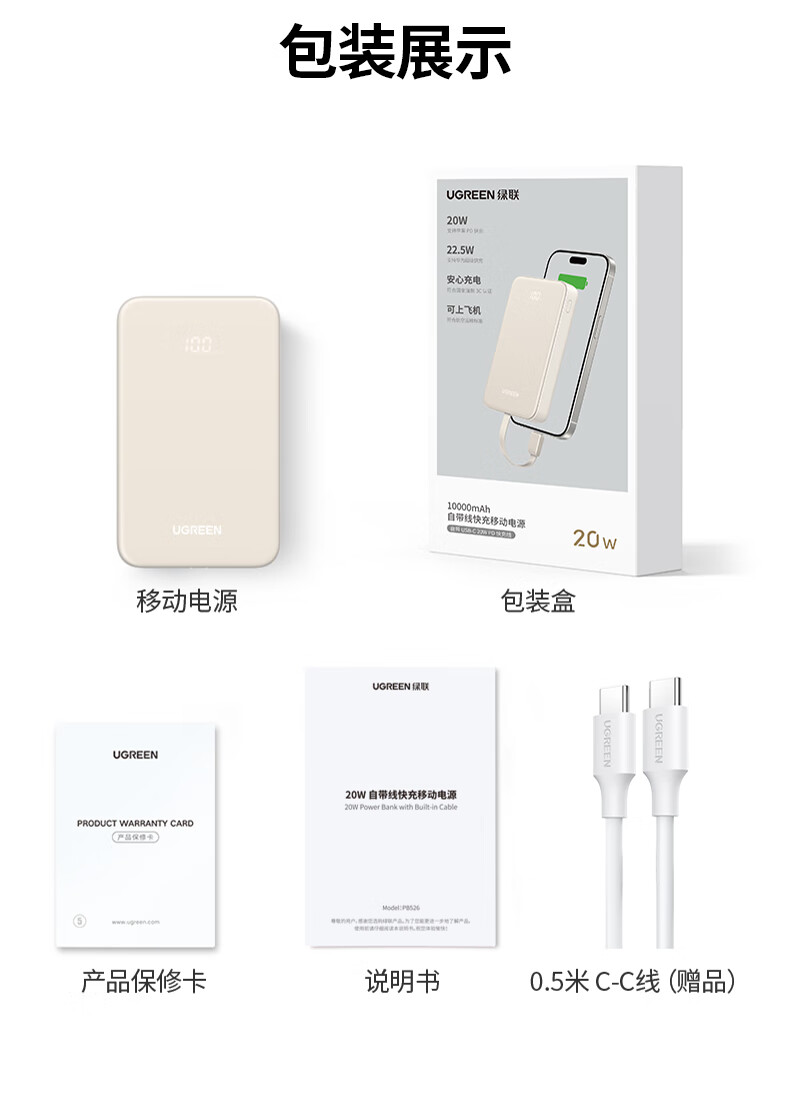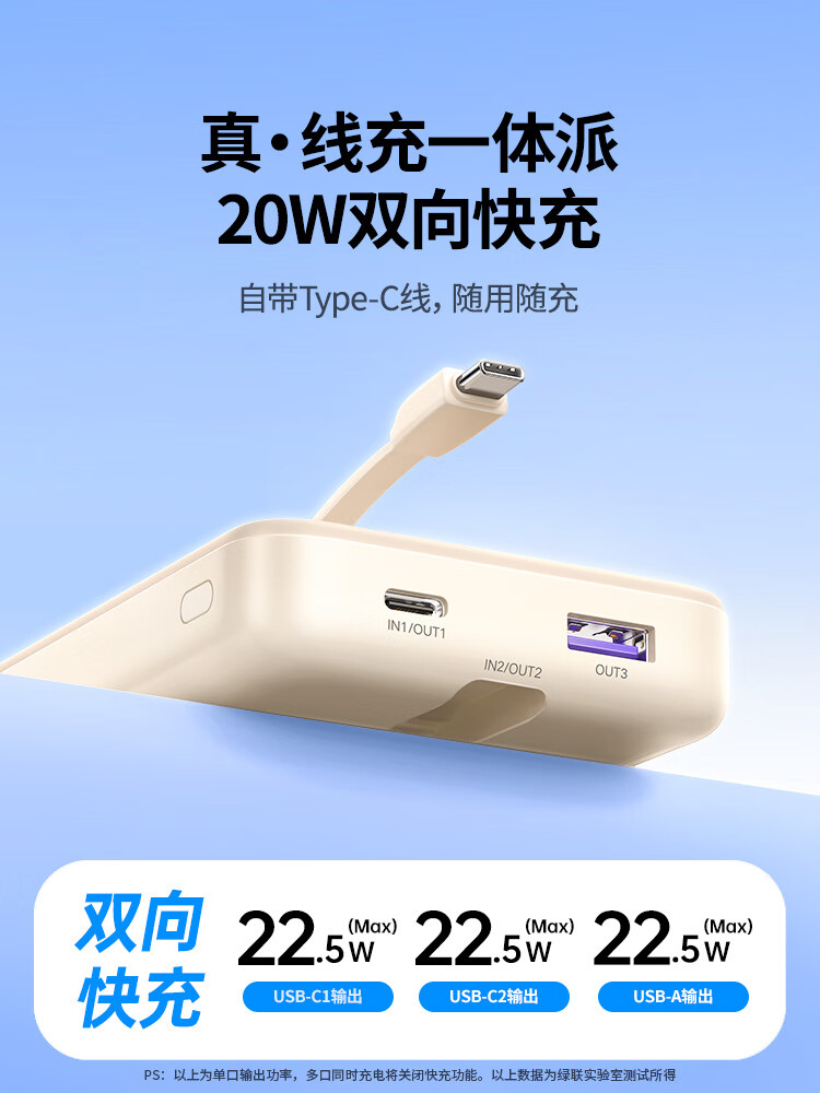绿联【3C认证可上飞机】充电宝自带线22.5W快充10000毫安大容量便携移动电源适用苹果17/16/华为/小米