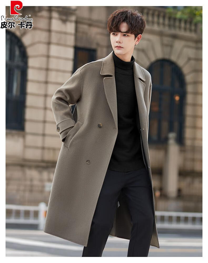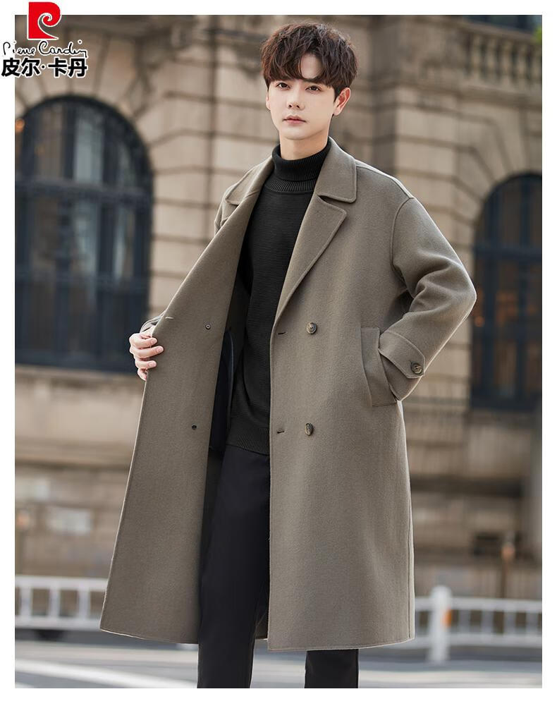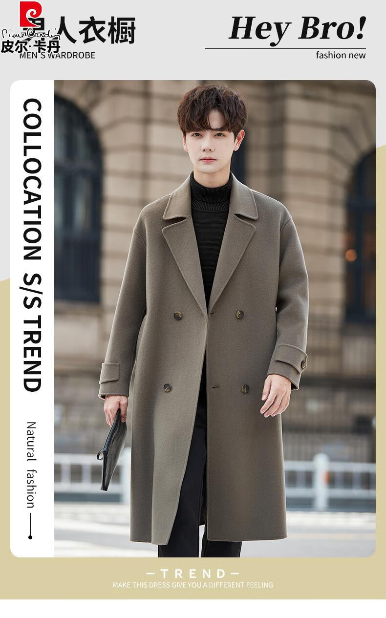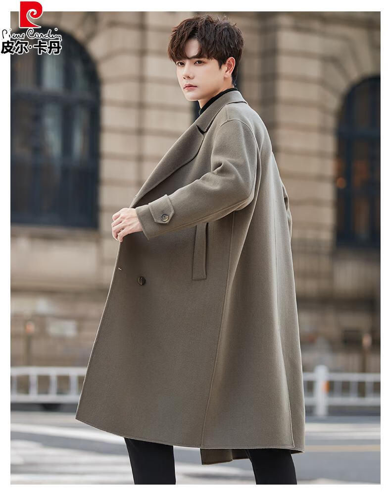 皮尔卡丹(pierre cardin)高端双面羊毛呢大衣男士中长款过膝100%纯羊毛呢子外套风衣冬季加 灰绿色 (100%羊毛 ) M (135-160斤)