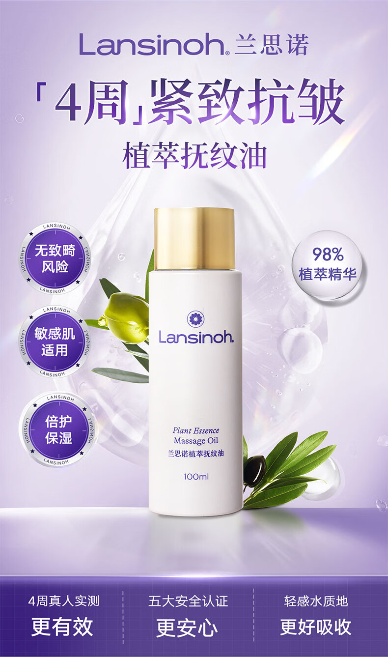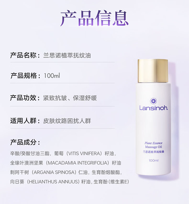 兰思诺(LANSINOH)兰思诺妊娠油 预防淡化身体纹抚纹油 护肤保湿白金美肌瓶 植萃抚纹油100ml